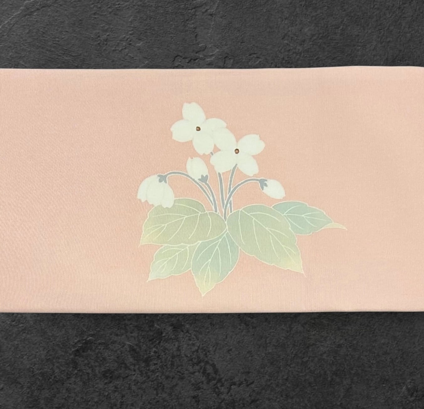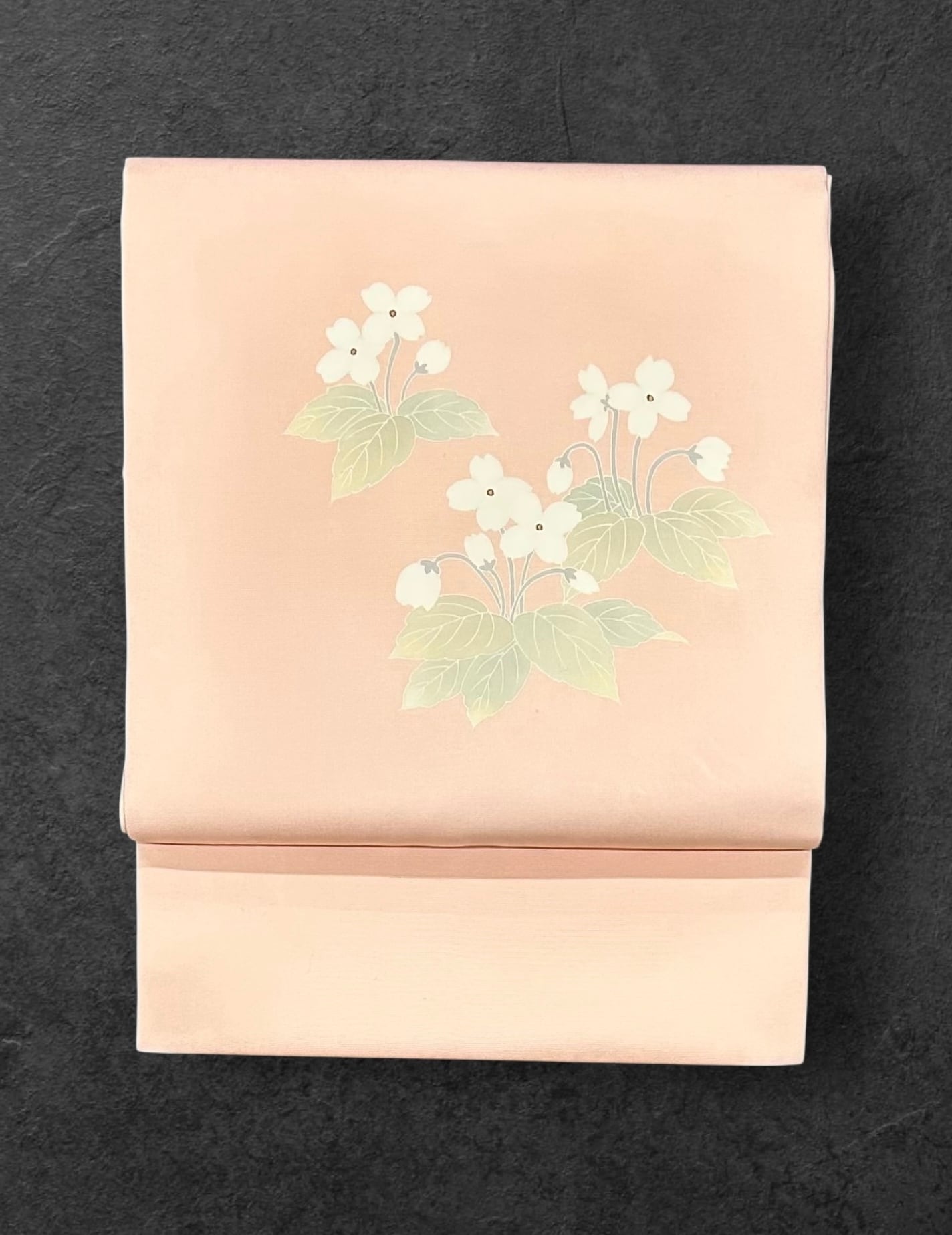 風情漂う名古屋帯の登場です!薄い珊瑚色の地に、可愛らしい草花のお太鼓柄が優雅に描かれています。生成り色の花と薄い山葵色などの優しいお色味色は、着る人の魅力を一層引き立てます。やわらかめの質感で、どんな着物にも合わせやすい逸品です。