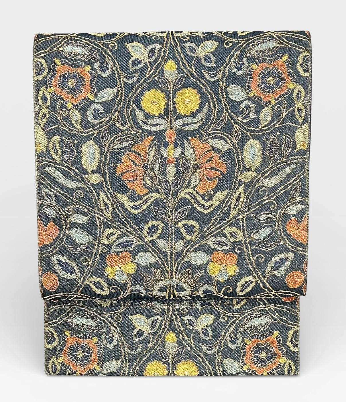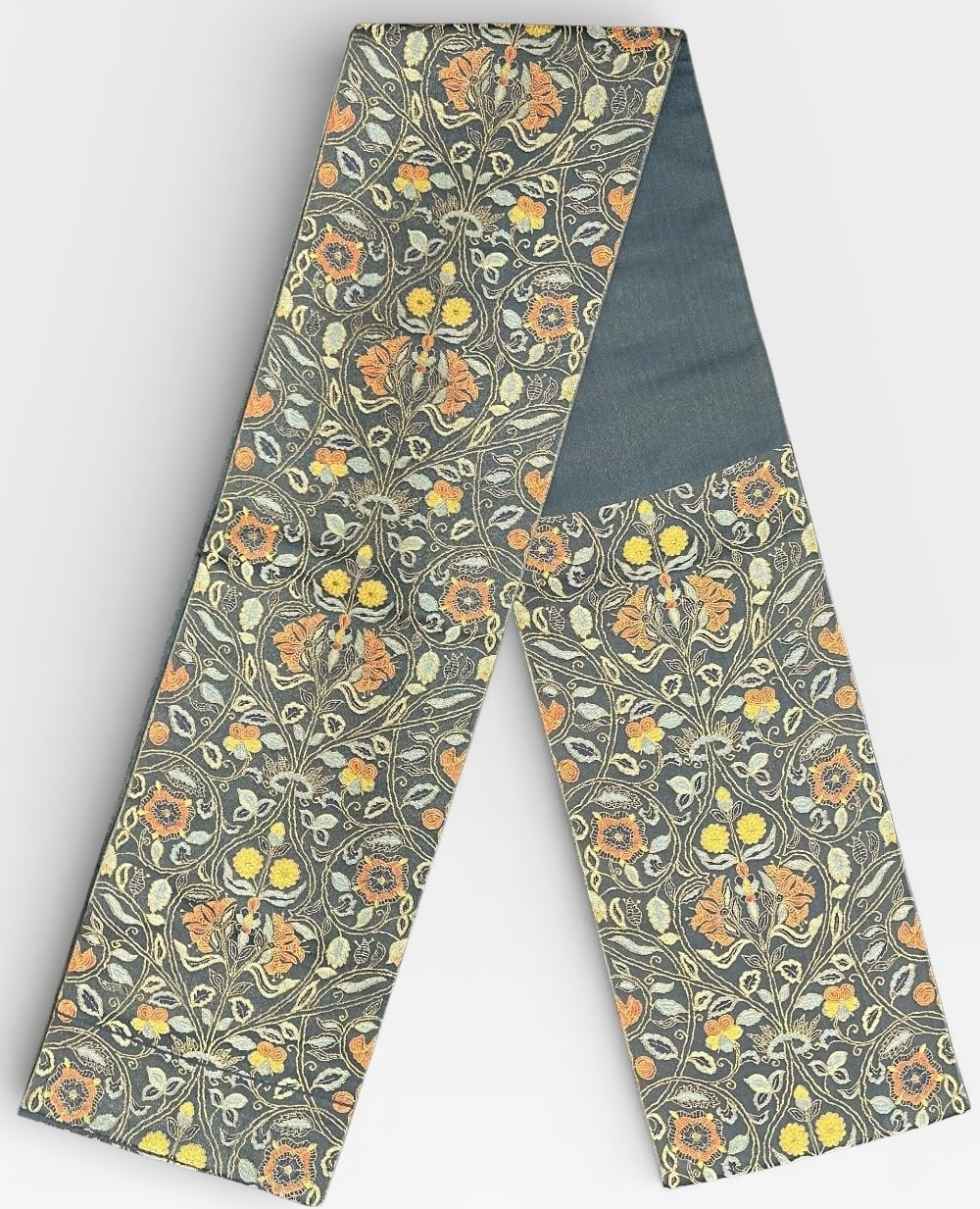 上品な柳煤竹色の袋帯のご案内です。金糸が織り込まれた地に、黄赤色、湊鼠色、麹塵色を駆使した更紗華文が施され、華やかさを添えています。柔らかい地は薄めでしなやか、三風魯の魅力が感じられる逸品です。様々な着物に相性が良く、特別な日にぴったりのアイテムです。