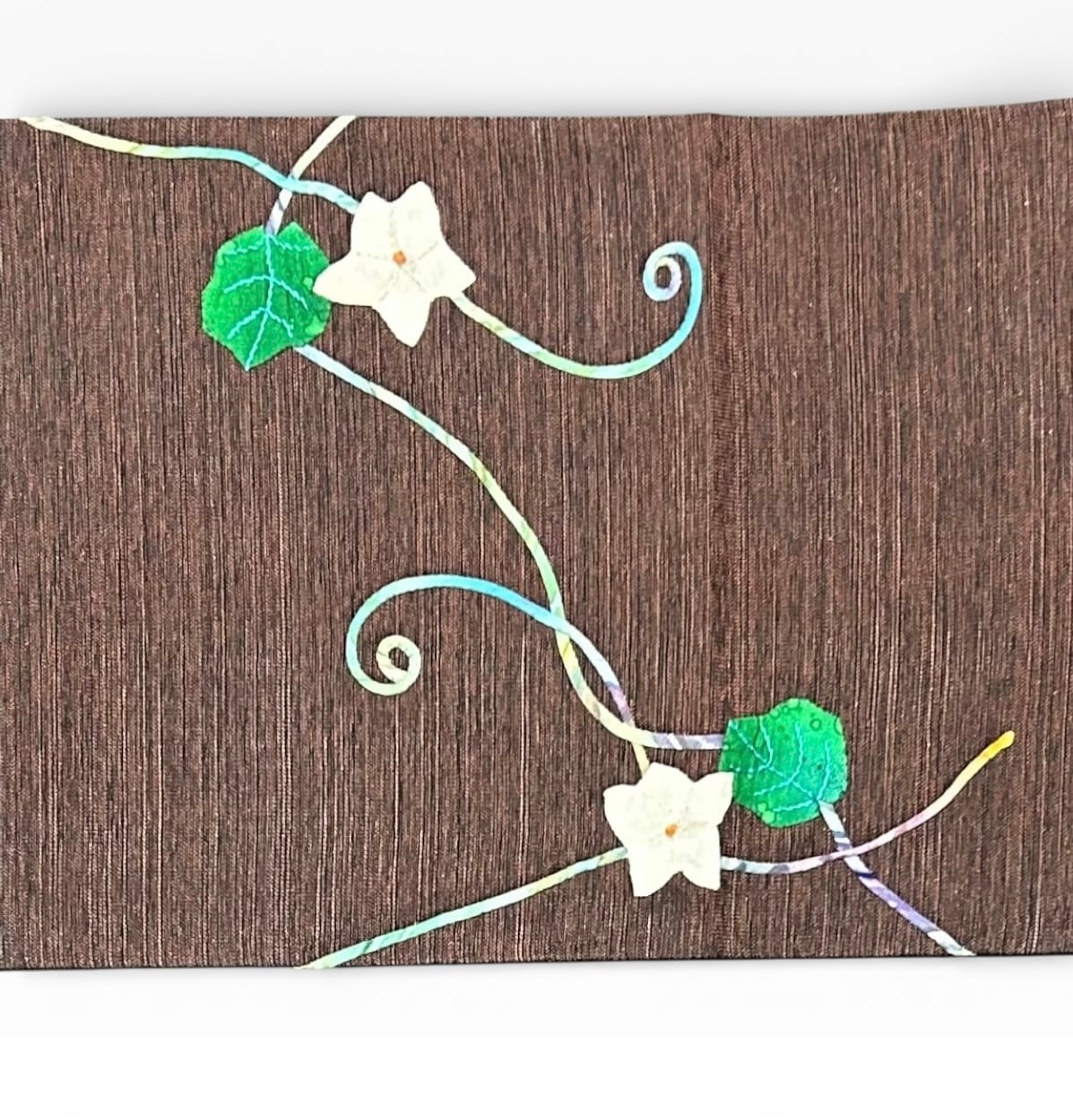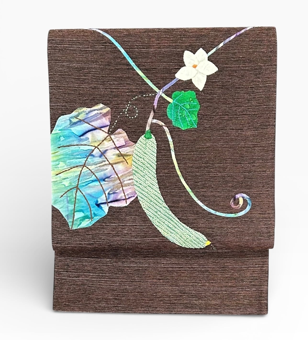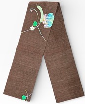 黒が混ざった黒茶色、紬地の袋帯のご案内です。色鮮やかなアップリケの植物柄が大胆に表現されています。美しい切嵌めのお太鼓柄が目を引き、洗練された雰囲気を醸し出す逸品です。ハリのある素材感が、着用時の存在感を高めます。ガード加工すみ。