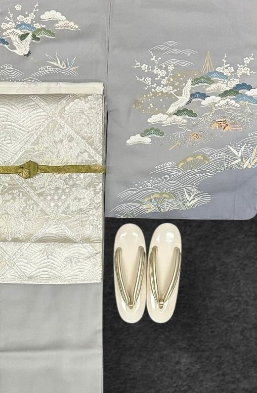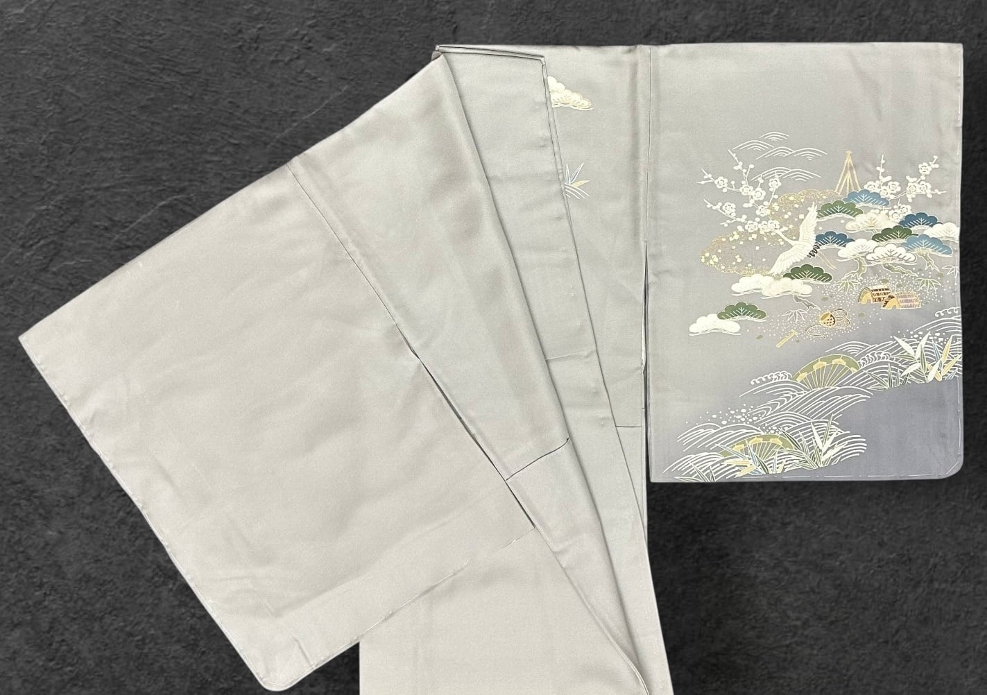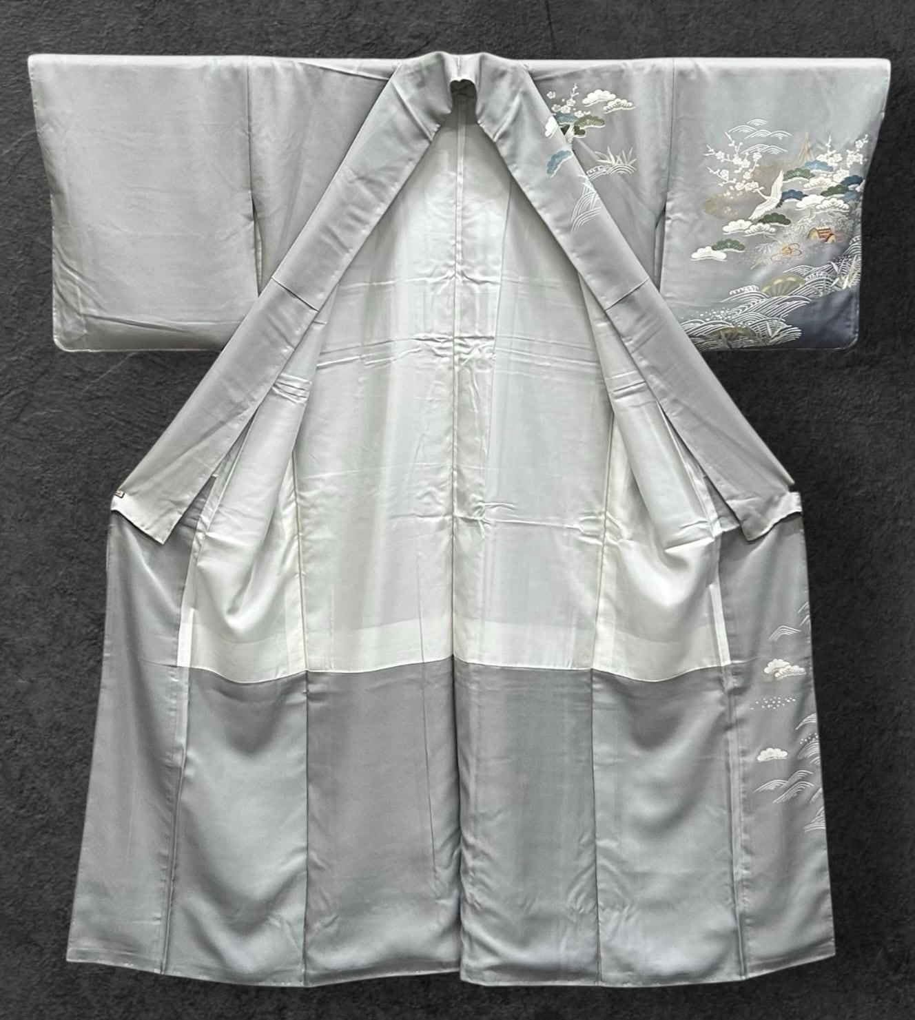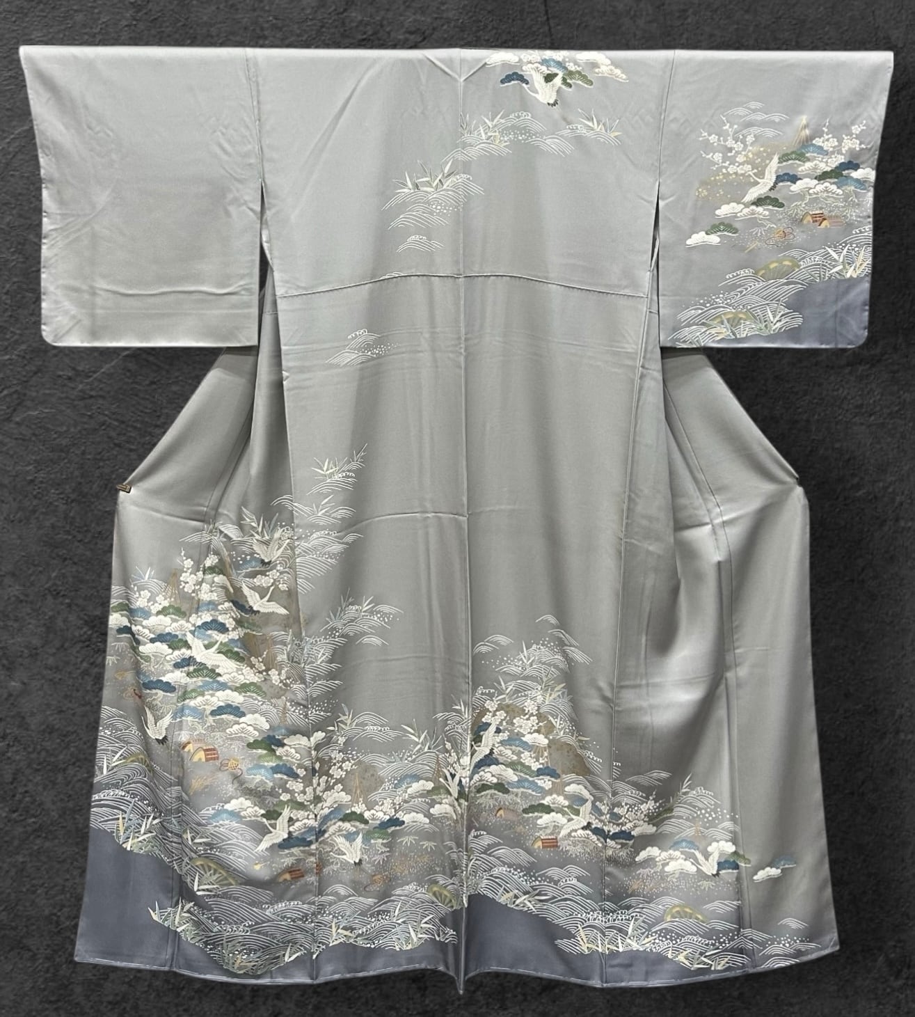 訪問着 薄鈍色~灰色の地 鶴 波 松竹梅などの吉祥文様 しつけ糸つき 裄丈69 ㎝ K5774