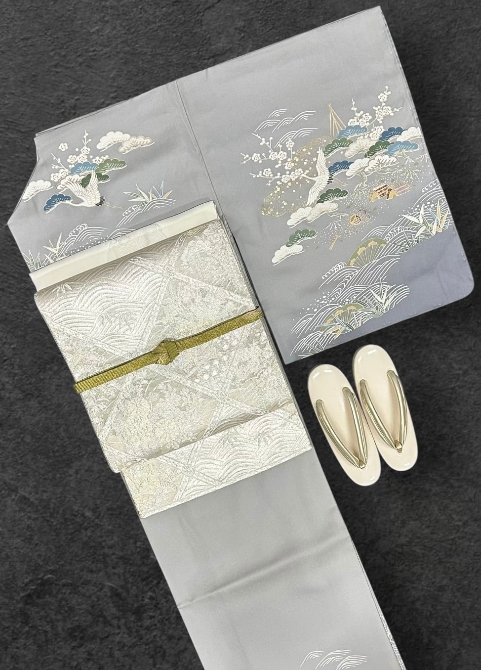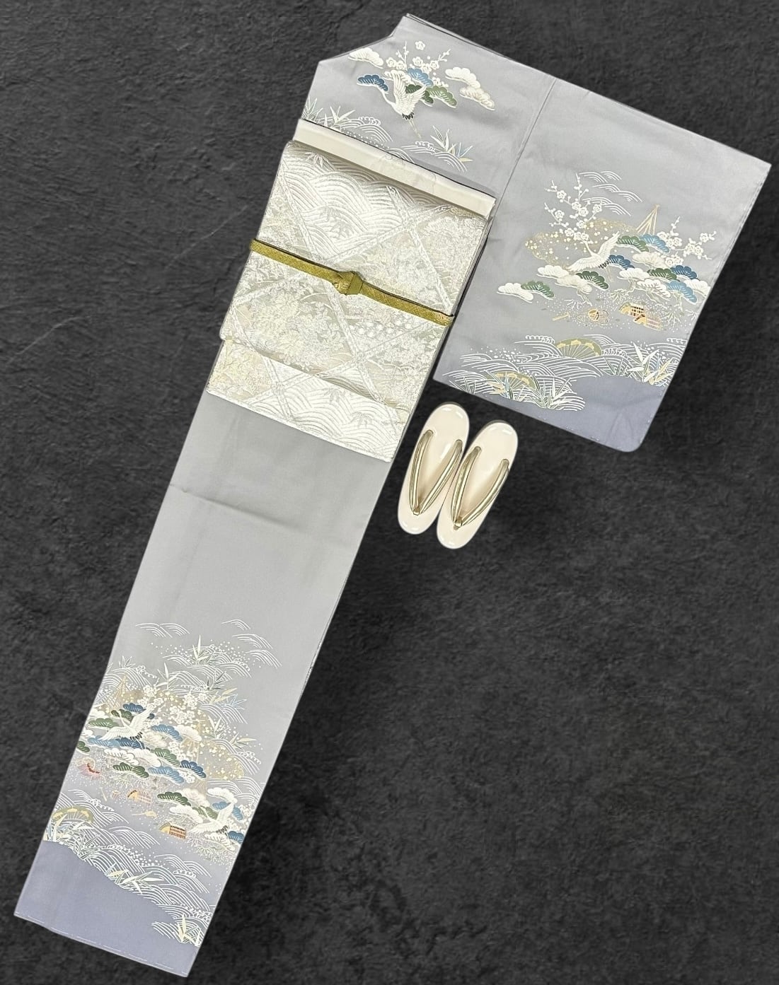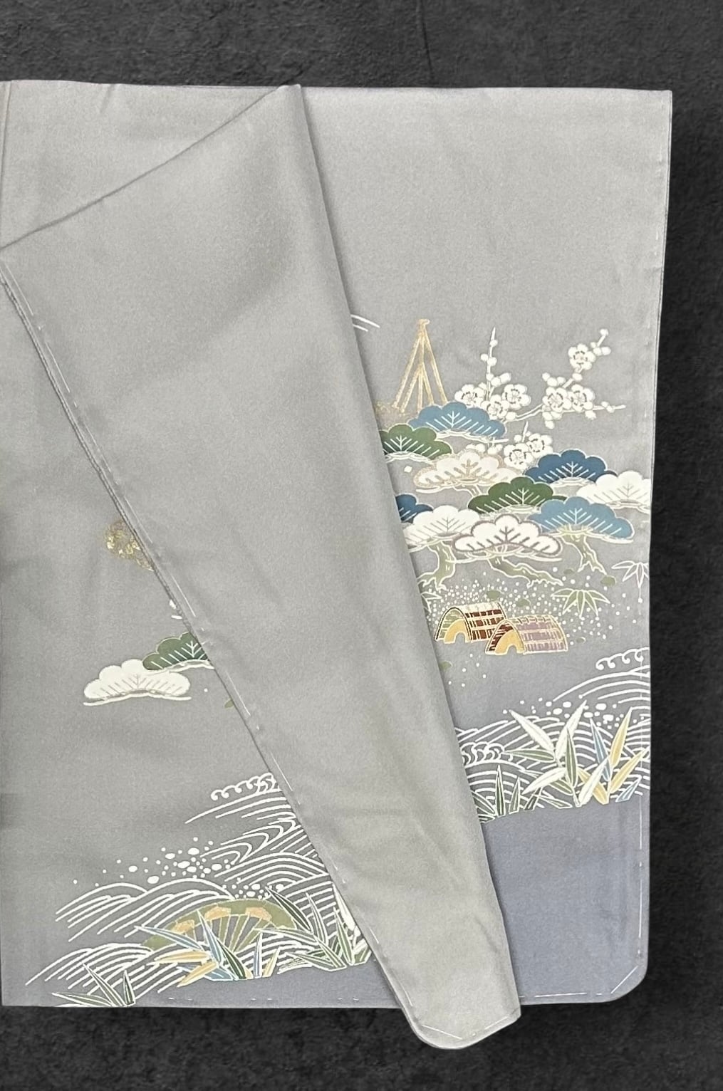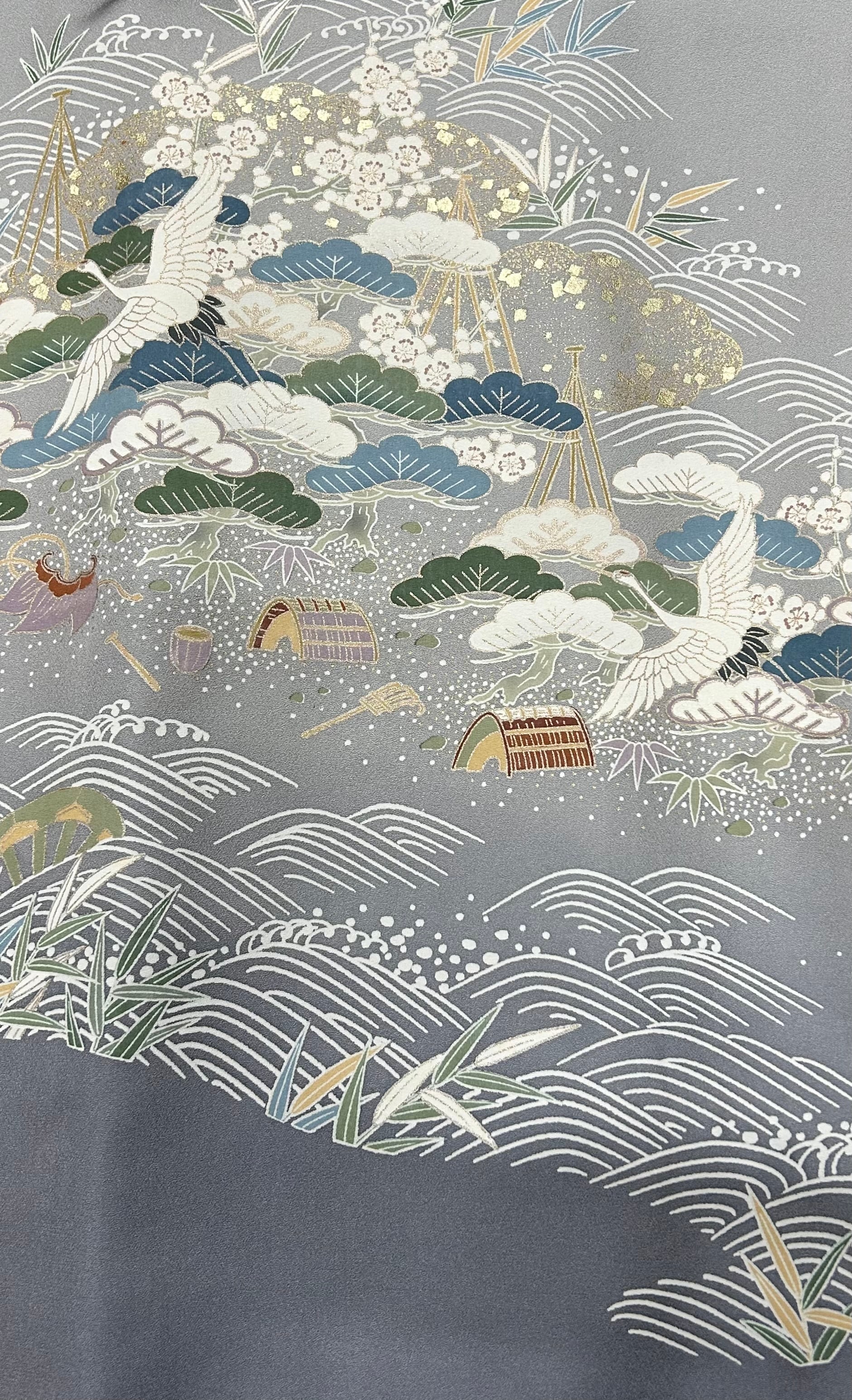 訪問着 薄鈍色~灰色の地 鶴 波 松竹梅などの吉祥文様 しつけ糸つき 裄丈69 ㎝ K5774
