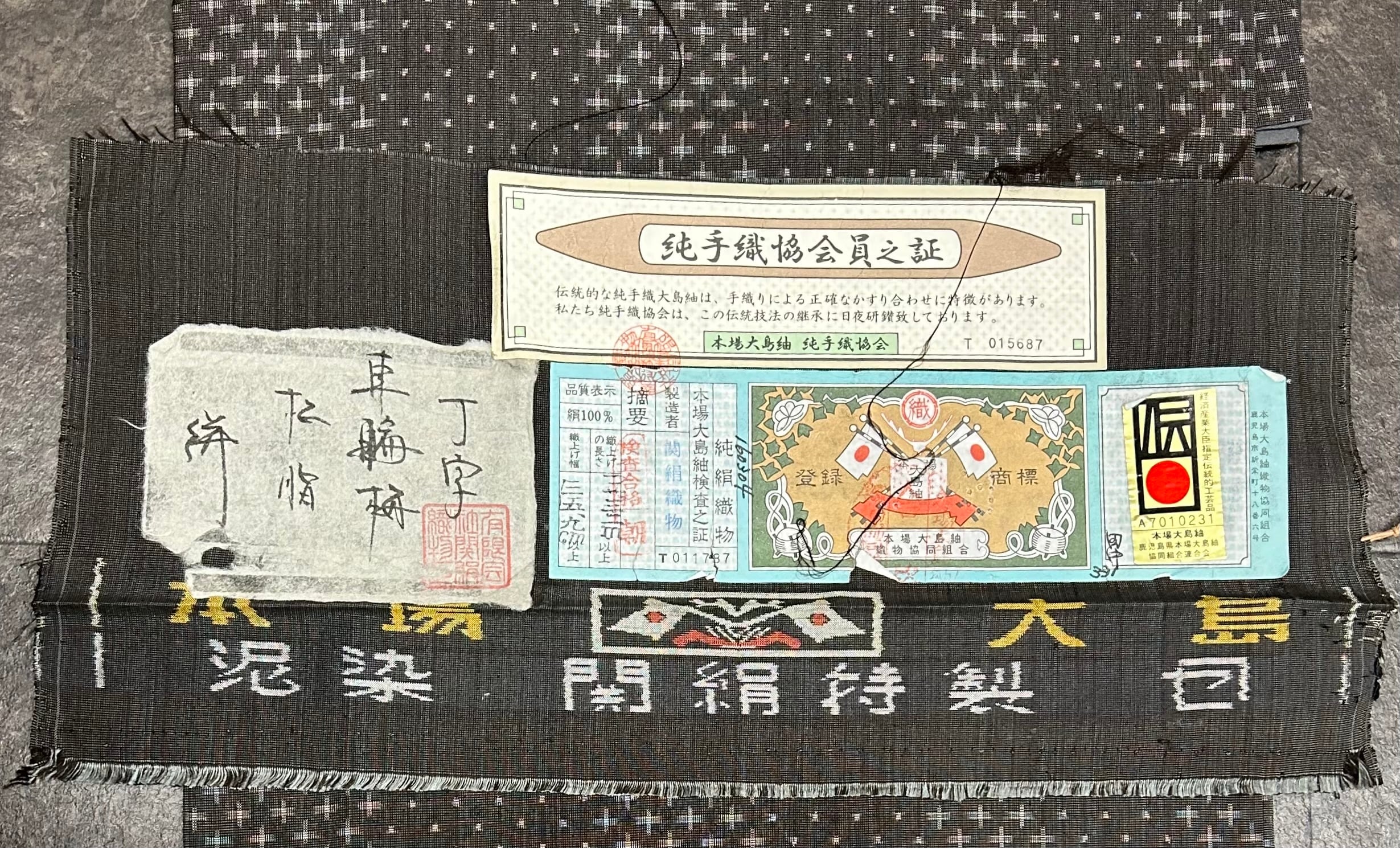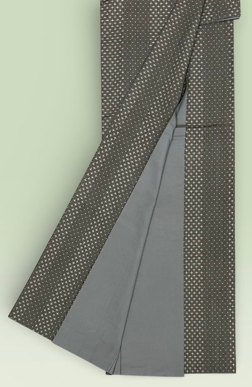 大島紬 関絹織物 青山みとも 茶色の混じった藍墨茶色の地 素敵な絣模様 反端つき 裄丈 72㎝ K6097