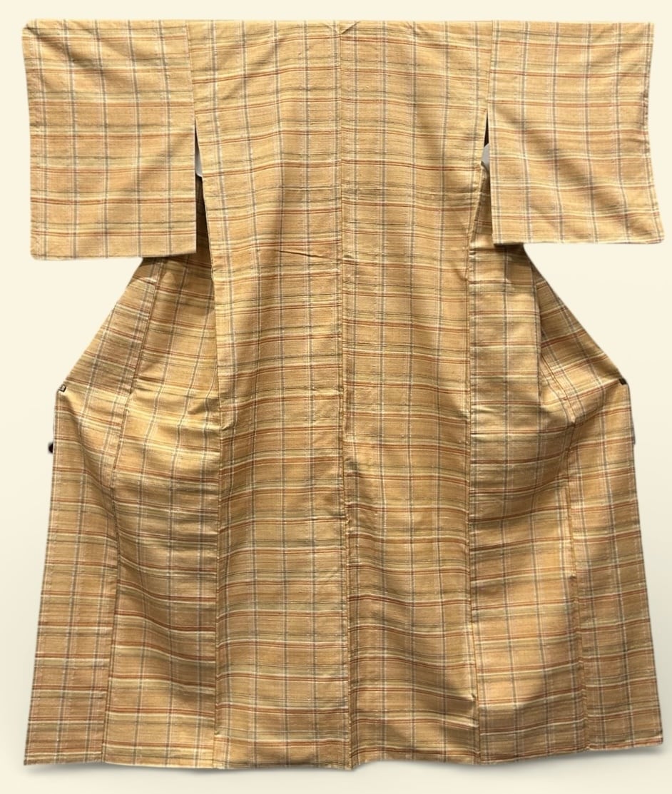 伊那紬 くすんだ小麦色に黄櫨色 薄青色 青鈍色 白などの格子柄 裄丈 63㎝ K5962