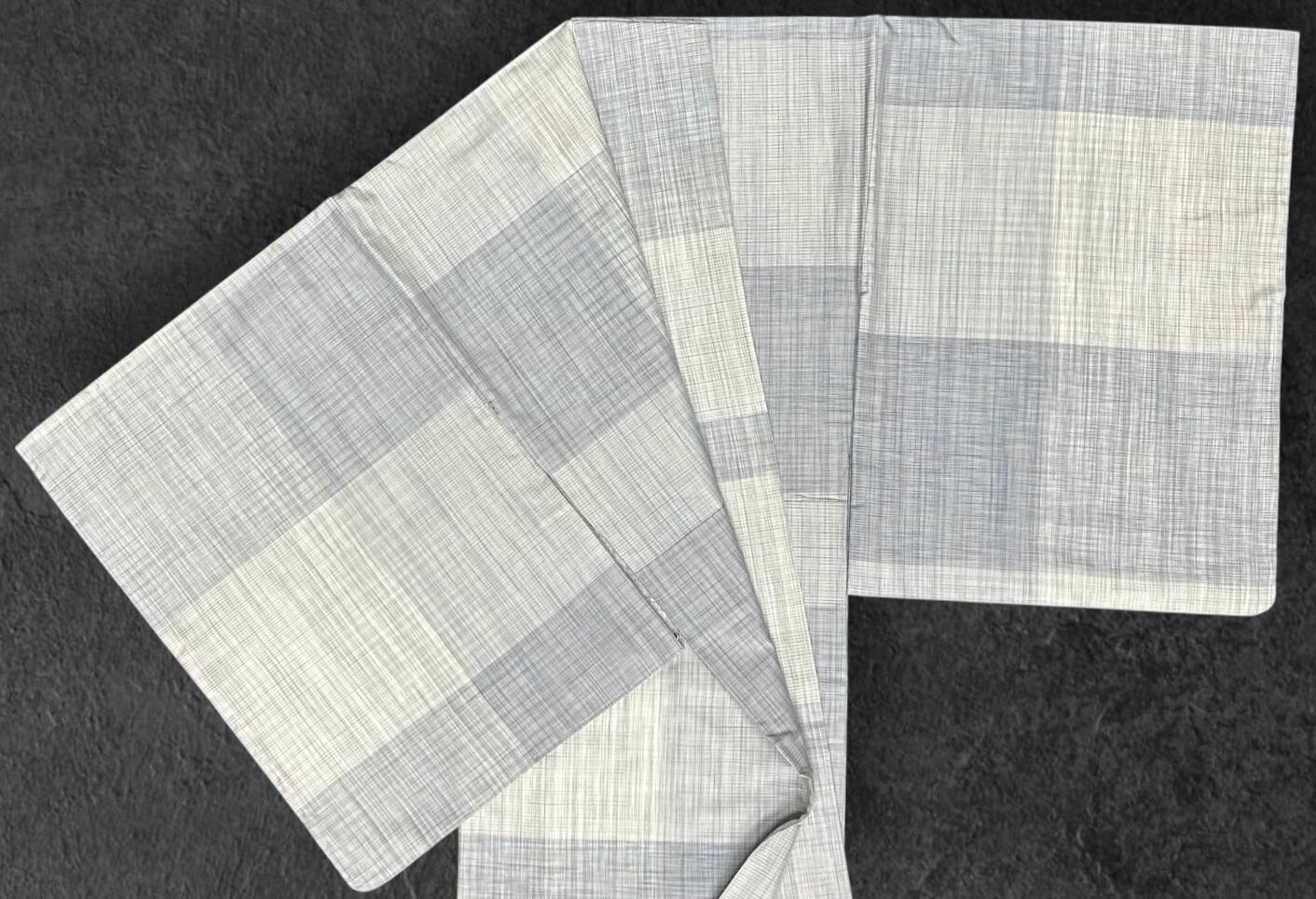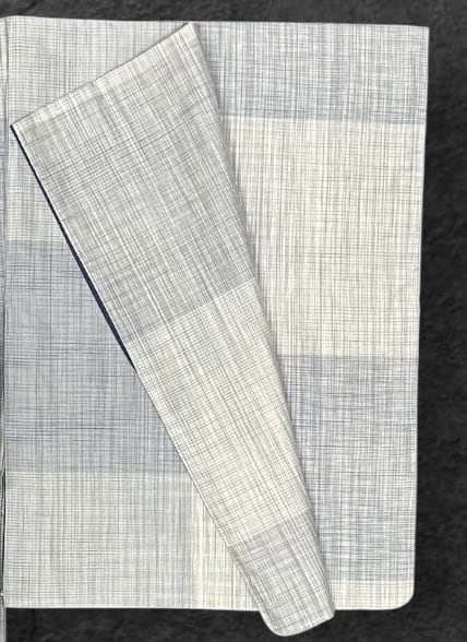 上品な象牙色と灰青の濃淡、青磁色のハーモニーが美しい、大島紬のご案内です。ランダムな格子柄が特徴的で、ほんのりとしたハリ感が魅力的で、しつけ糸も付いており、安心してご使用いただける逸品です。大島紬美幸の証紙も付いており、本物の大島紬の質感をお楽しみいただけます。