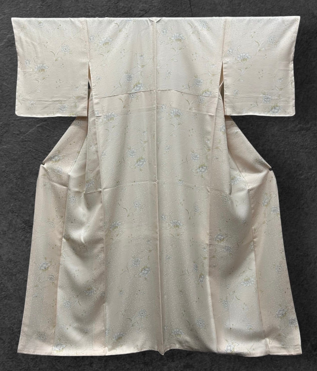 ハリと光沢のある灰梅色の地に、白、榛色、灰青など淡い色合いで描かれた可愛らしい唐花模様の小紋です。京友禅の技法で丁寧に仕立てられており、可愛らしいデザインが魅力です。反端ついています。