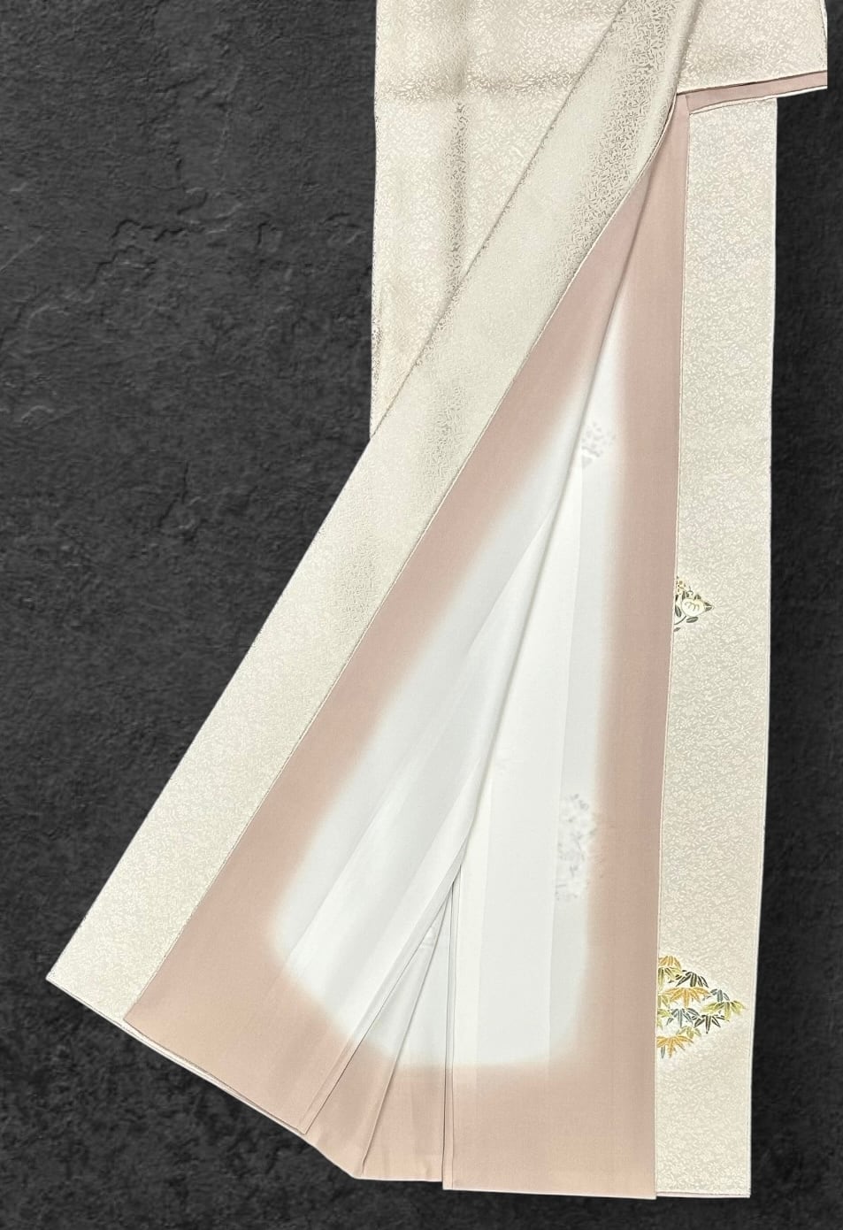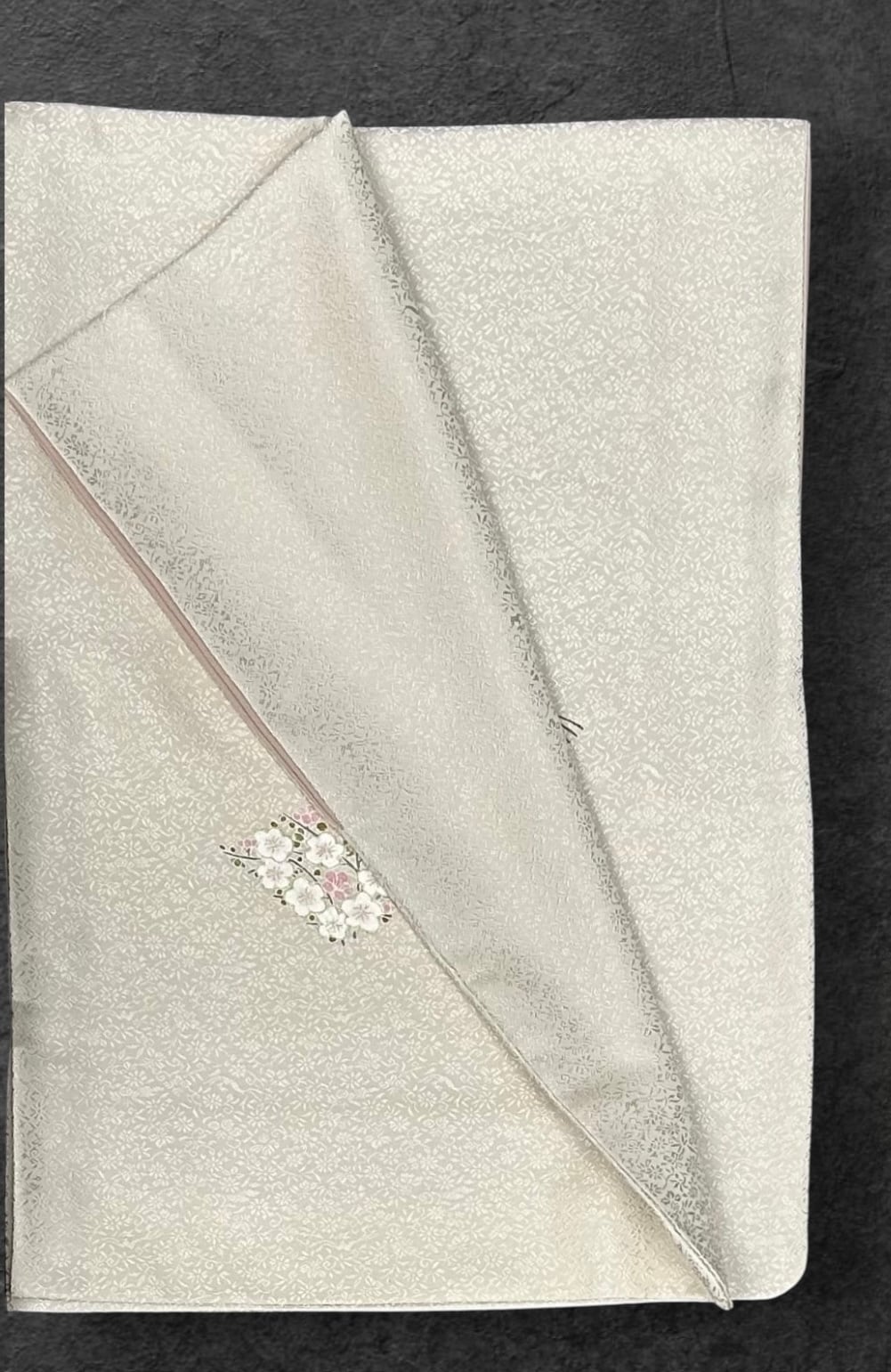 落ち着きのあるピンクがかった練色の地に、華やかな小花の地紋が施された付下げのお着物です。ほんのり光沢のある地は、上品で優しい印象を与えます。菱にかたどられた淡いお色味の四季折々の植物や青海波の模様が、さりげなくおしゃれ感を演出。ほんのりとハリがありますので、着用時にはしなやかな動きを楽しめます。高島屋さんお誂えの素晴らしい逸品です。
