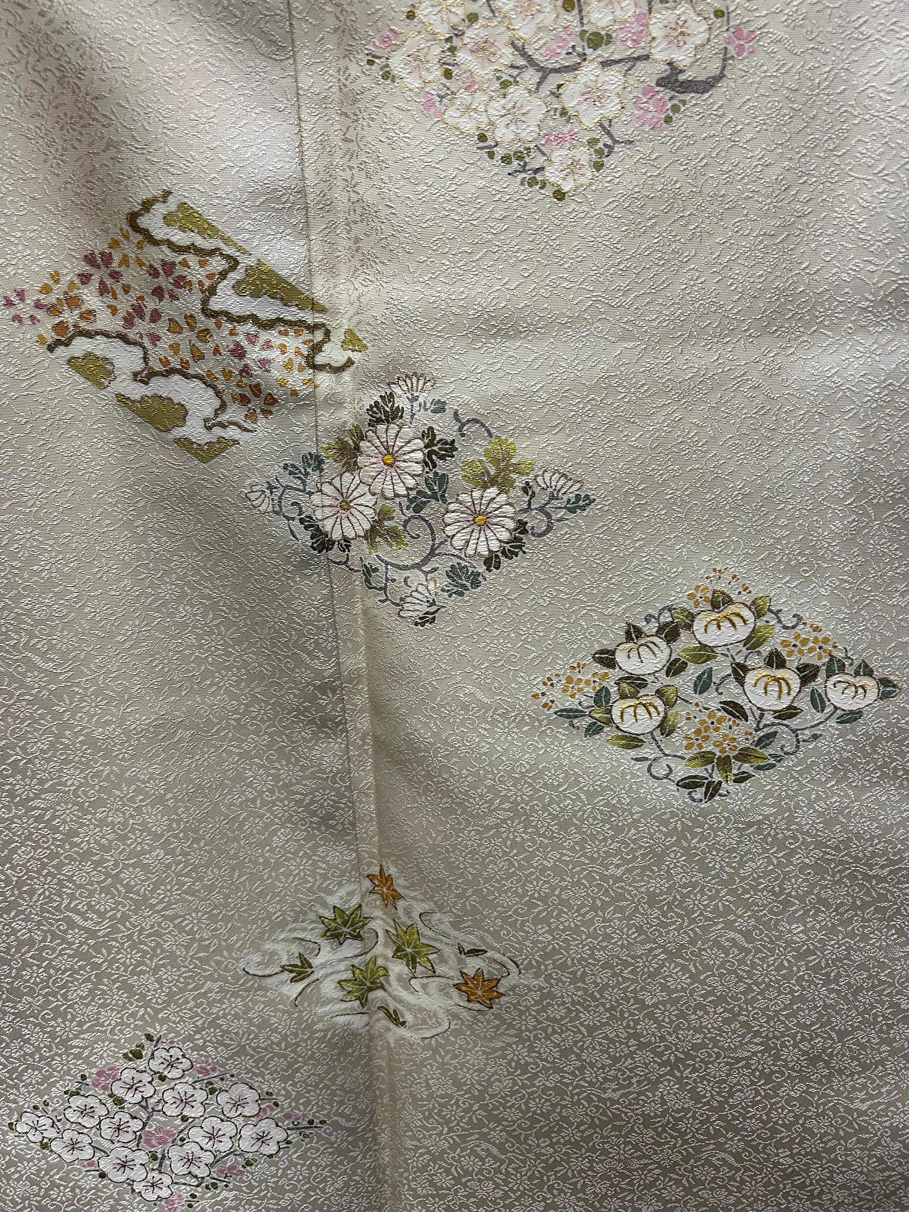 付下げ 高島屋 ピンクがかった練色の地 小花の地紋 菱形にかたどられた四季の植物と青海波 裄丈66 ㎝ K6453