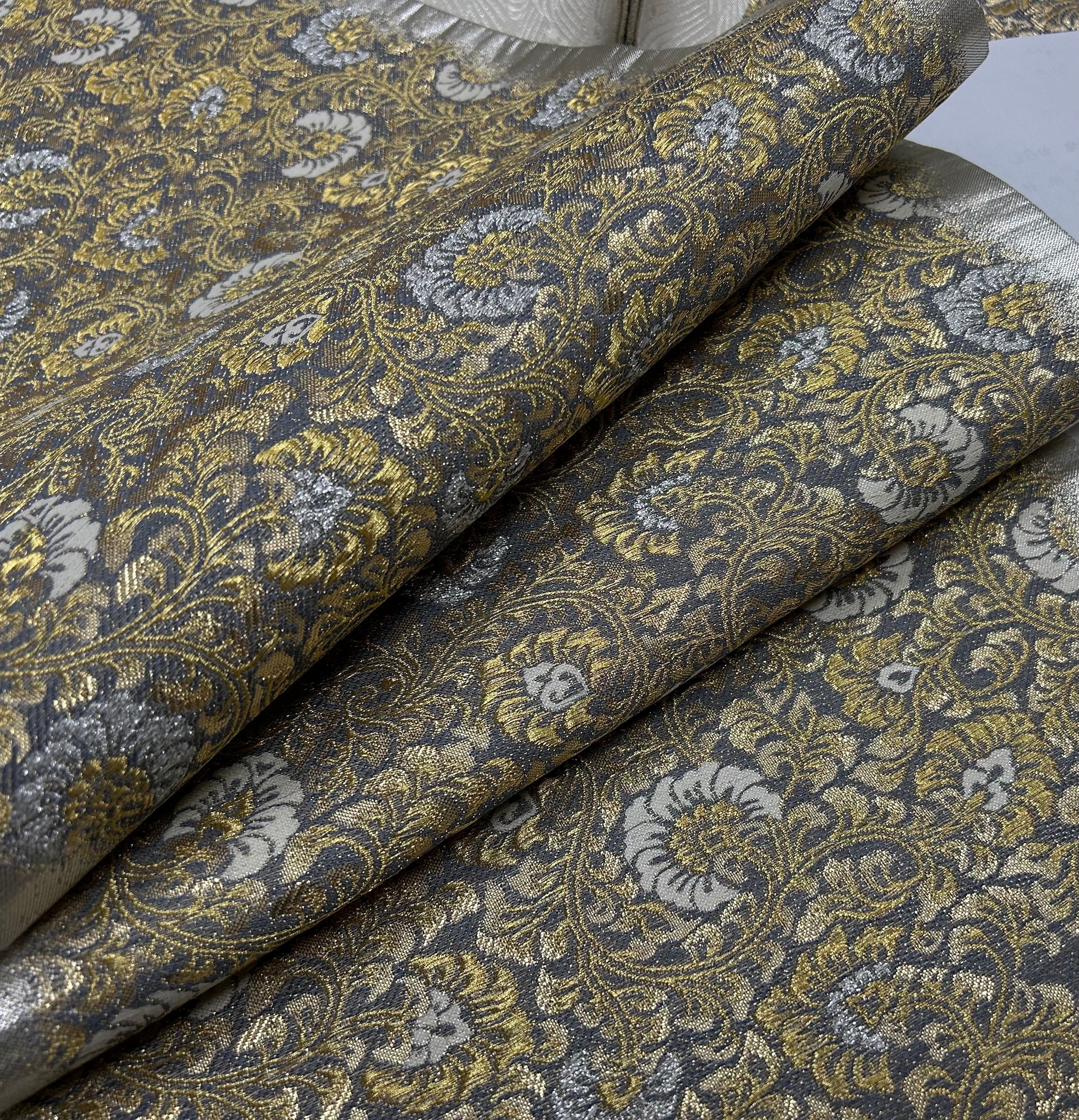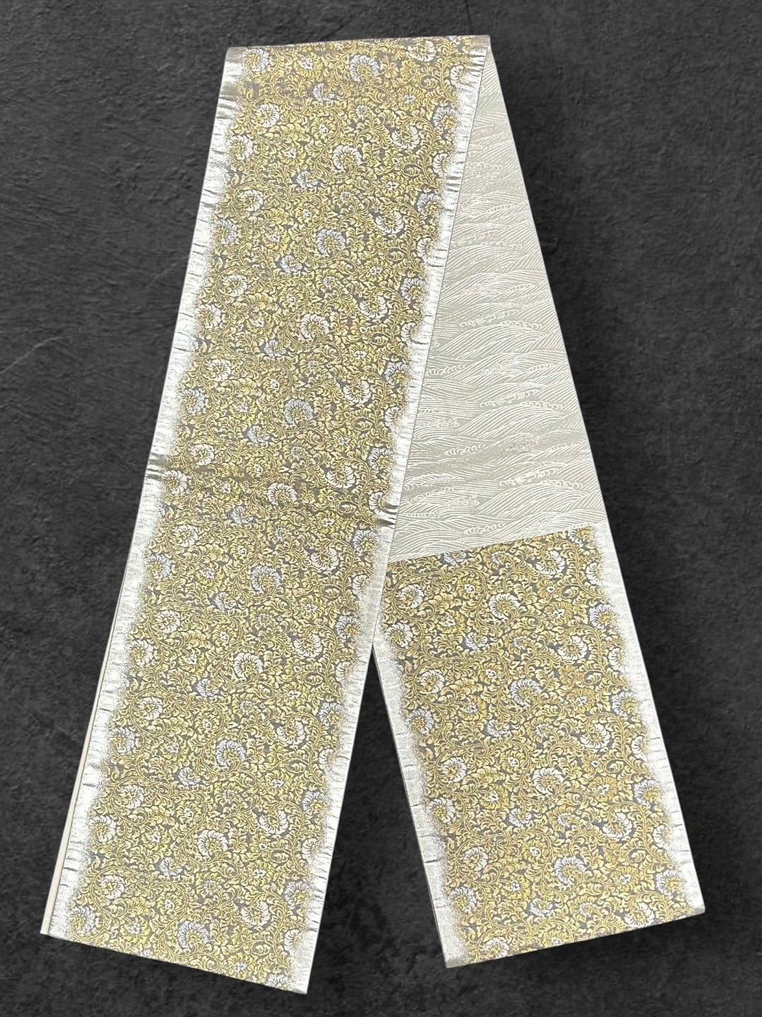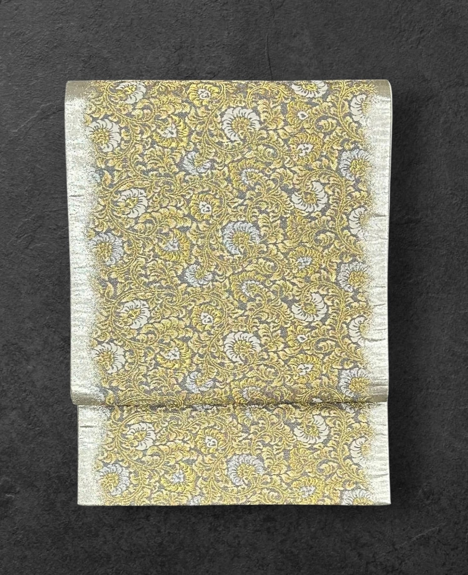 袋帯 練色に金糸 銀糸 灰色の唐草花文 波模様の地紋 ガード加工すみ 長さ446 ㎝ Q6538
