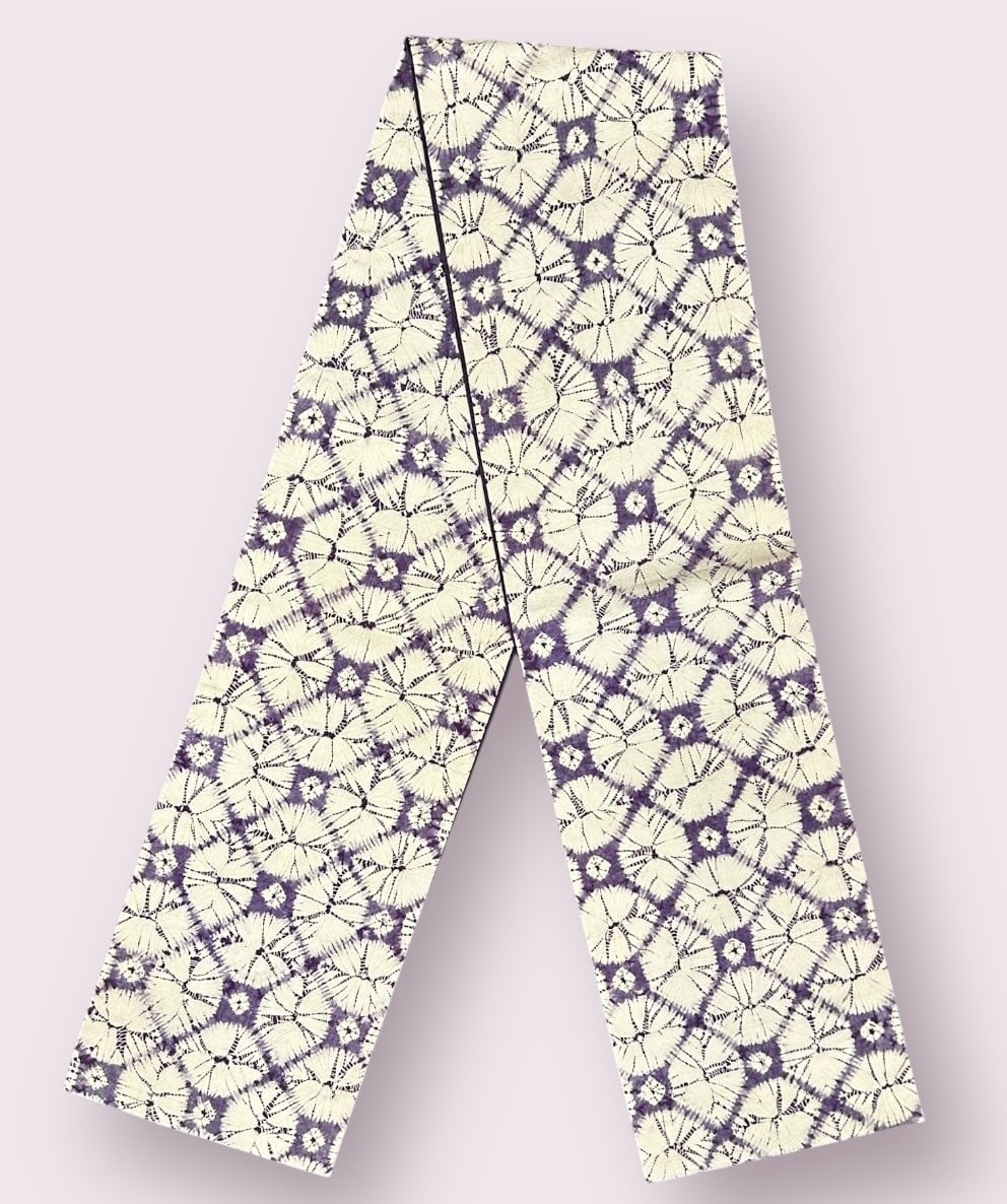 紫根染めの美しさが際立つ、菱文様のような文様が優雅な袋帯です。ハリがありつつも柔らかな素材感が魅力です。特別な日や、カジュアルなお出かけにぴったりのアイテムです!