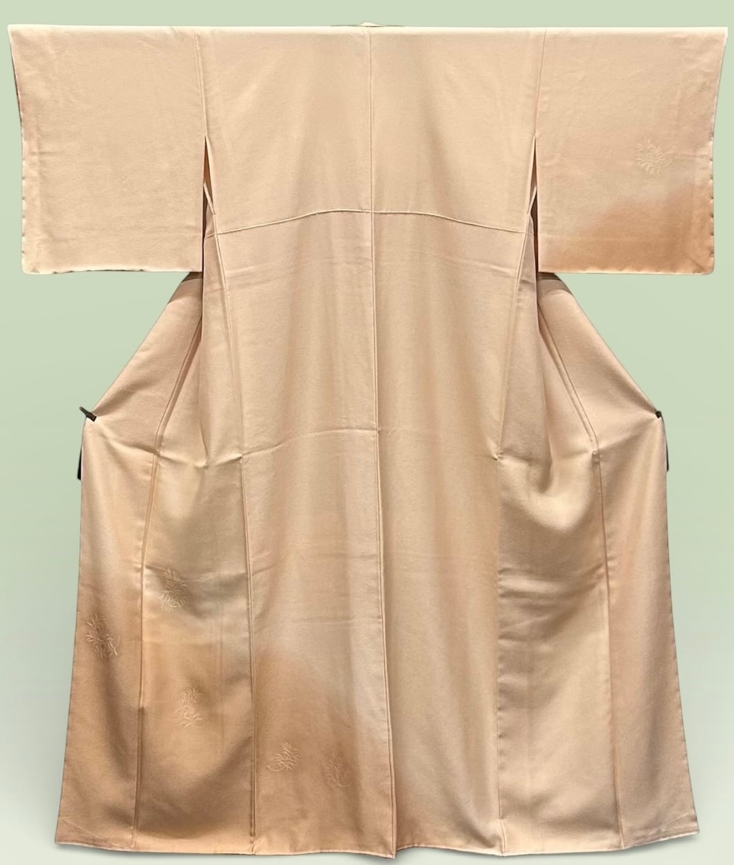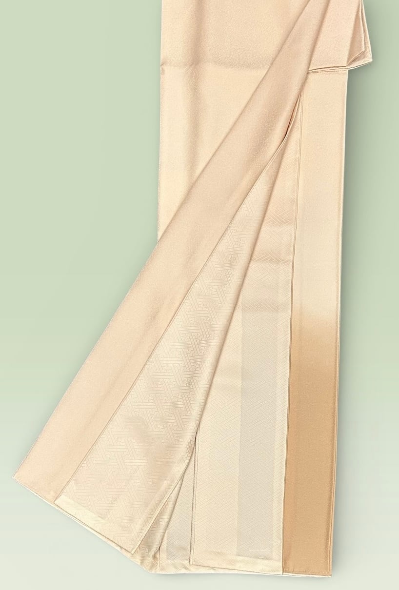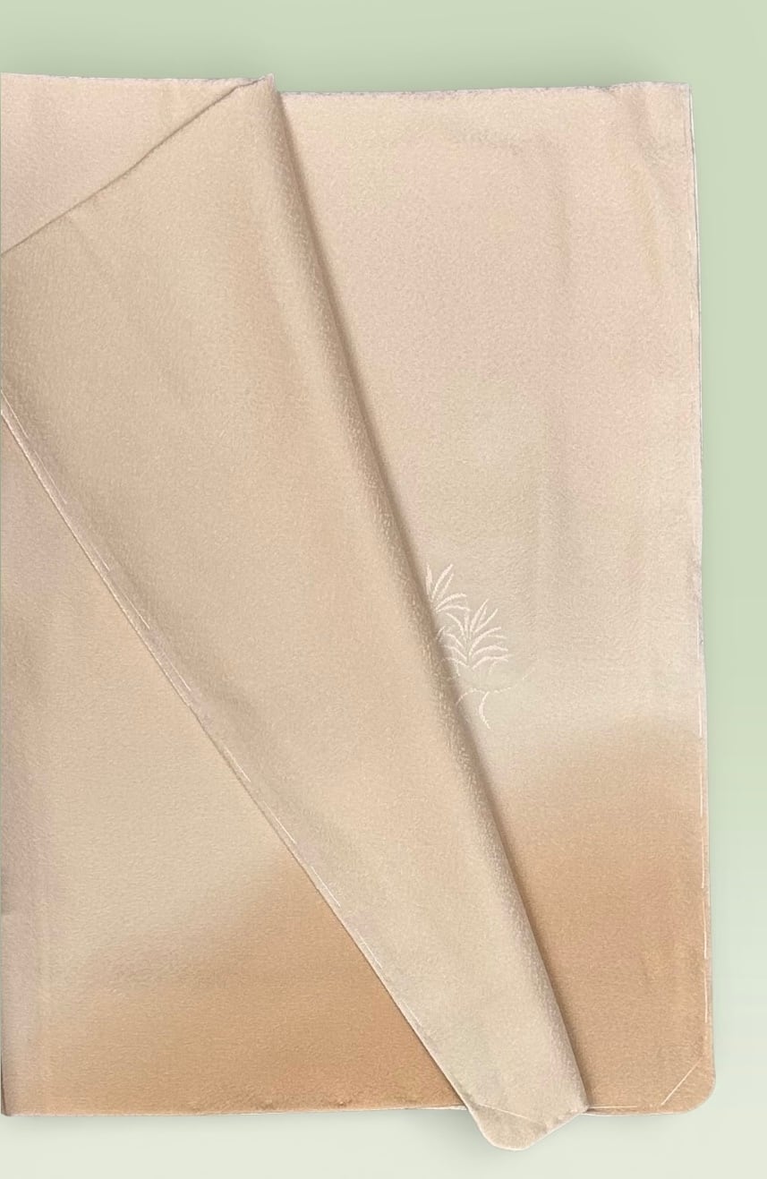 こちらの付下げは、洗柿色からくすんだ宍色へと優雅にぼかされており、シンプルながらも洗練された印象を与える一品です。同系色の草の柄が上前と袖にあしらわれており、上品な雰囲気を醸し出しています!柔らかな色合いは多様なシーンにマッチし、特別な日のお出かけにもぴったりです。
