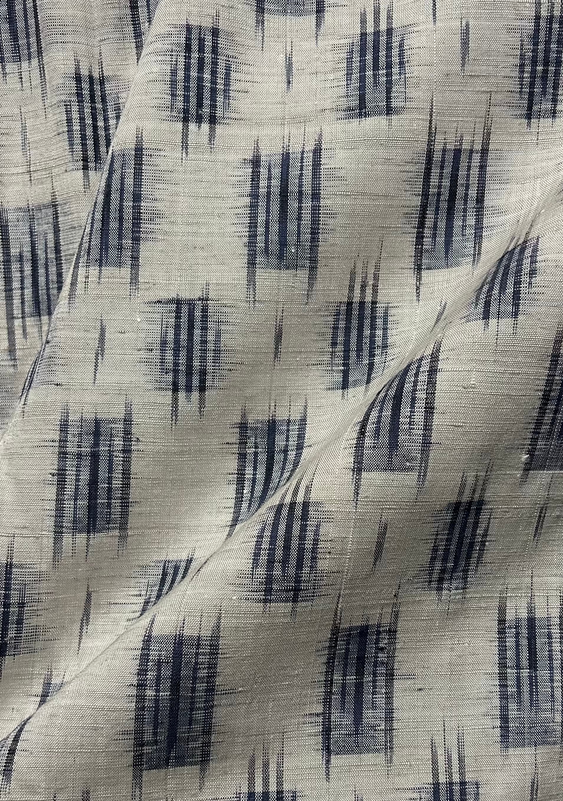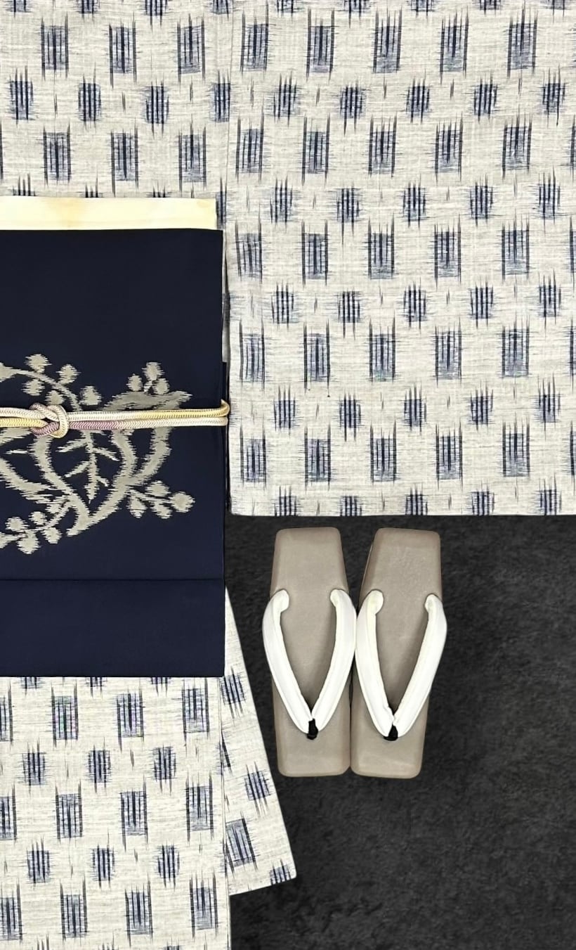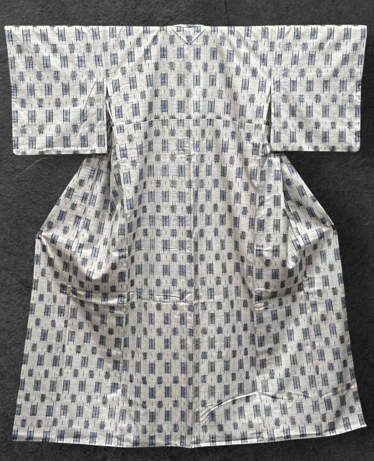 灰色がかった絹鼠色の地に、藍の濃淡で優雅に織り込まれた絣模様が特徴での紬です。さっぱりとした柔らかい地は、心地良い肌触りを提供し、着る方の魅力を引き立てます。シンプルながらも洗練されたデザインは、様々なシーンでのコーディネートにぴったりです。