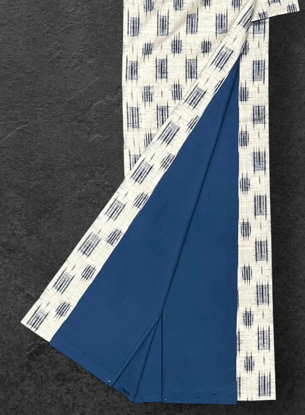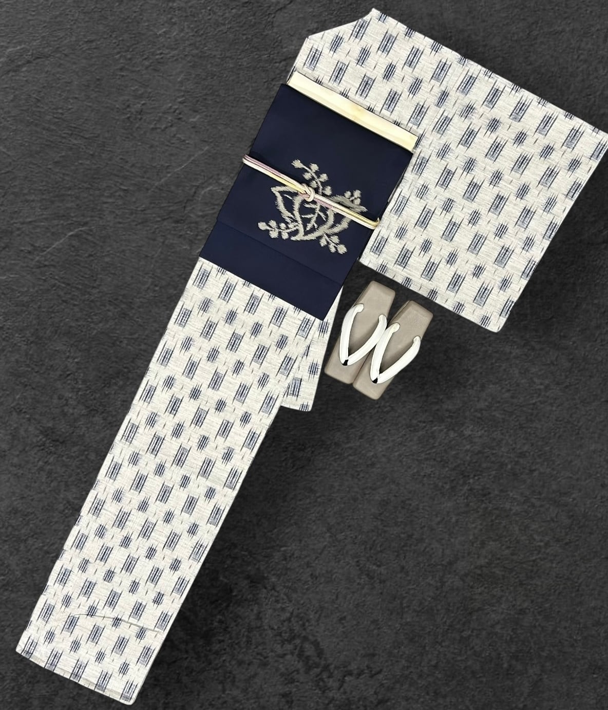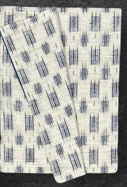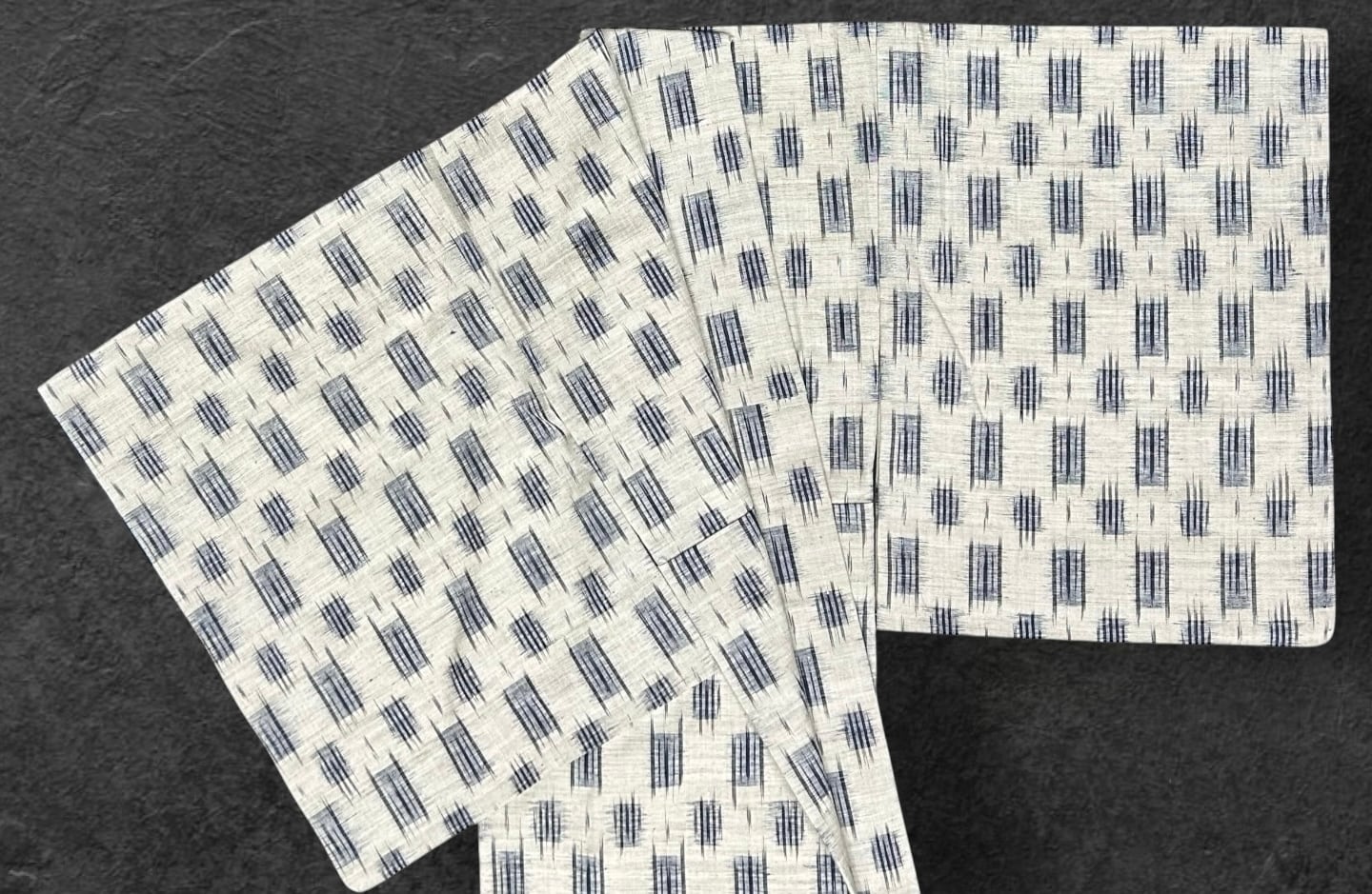 灰色がかった絹鼠色の地に、藍の濃淡で優雅に織り込まれた絣模様が特徴での紬です。さっぱりとした柔らかい地は、心地良い肌触りを提供し、着る方の魅力を引き立てます。シンプルながらも洗練されたデザインは、様々なシーンでのコーディネートにぴったりです。