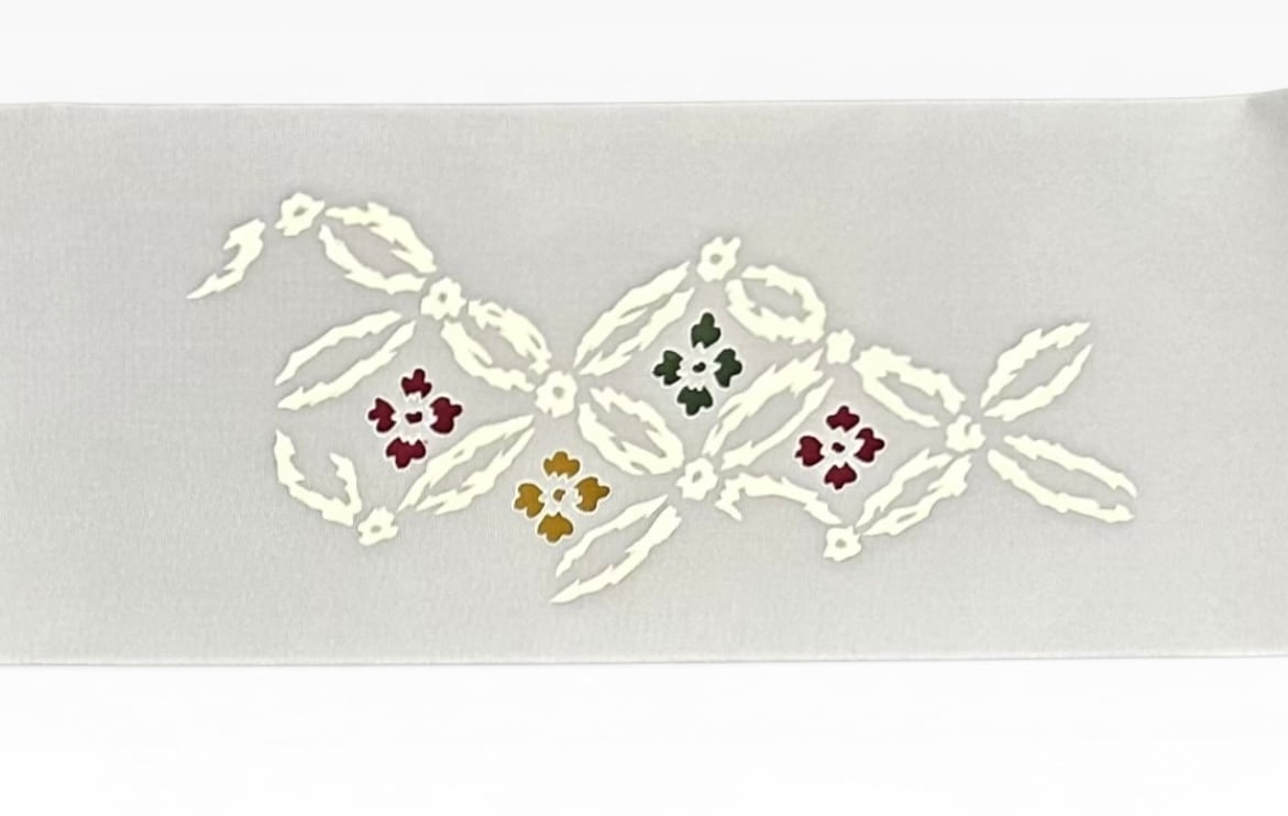 優雅な素鼠色の地に、象牙色の七宝柄と葡萄色 香染色 百入茶色の花文が施された塩瀬の名古屋帯です。程よいハリを持ち、着用する方に心地よさをもたらします。シンプルながらも華やかさがあり、様々なコーディネートにぴったりです。