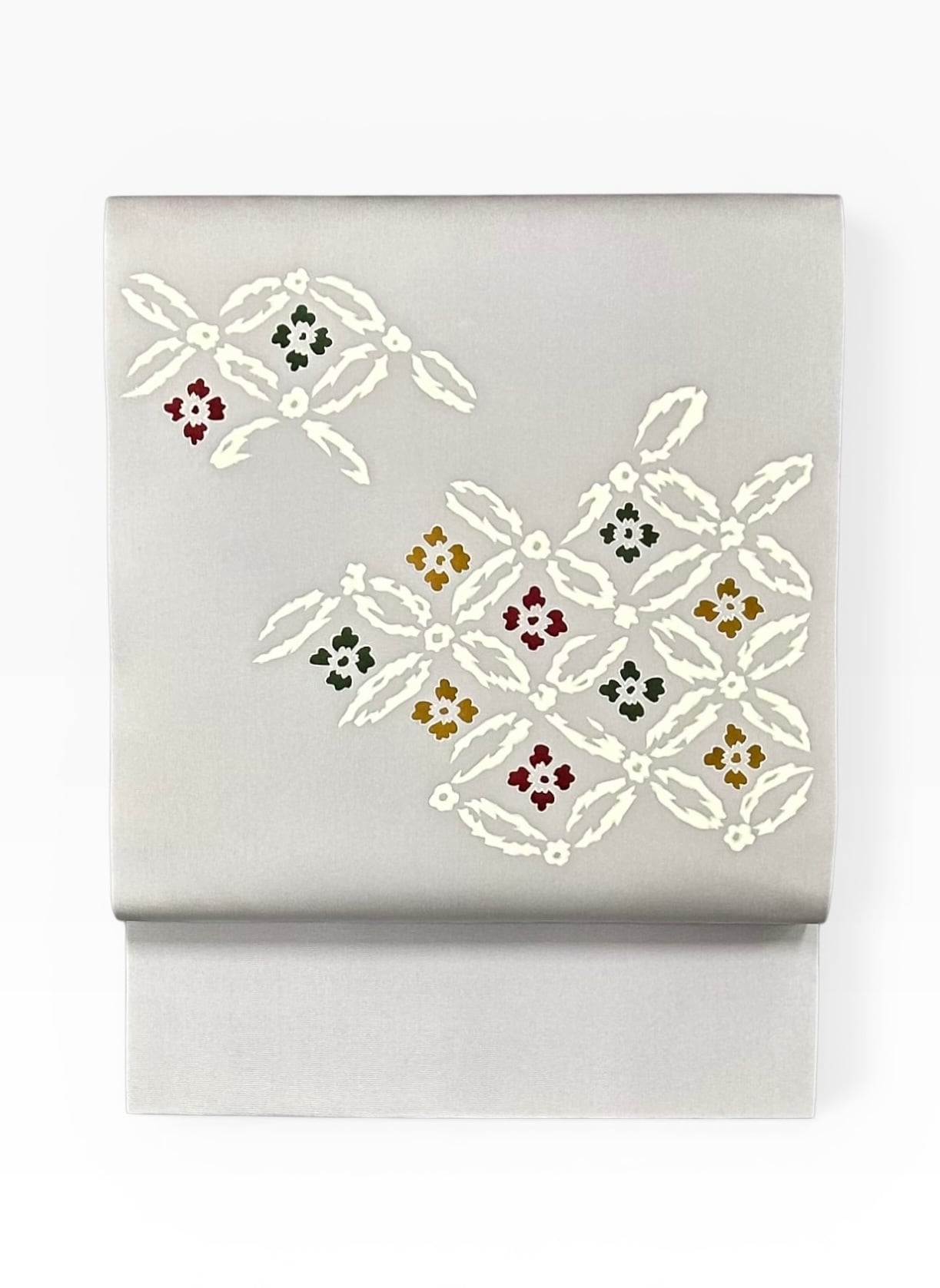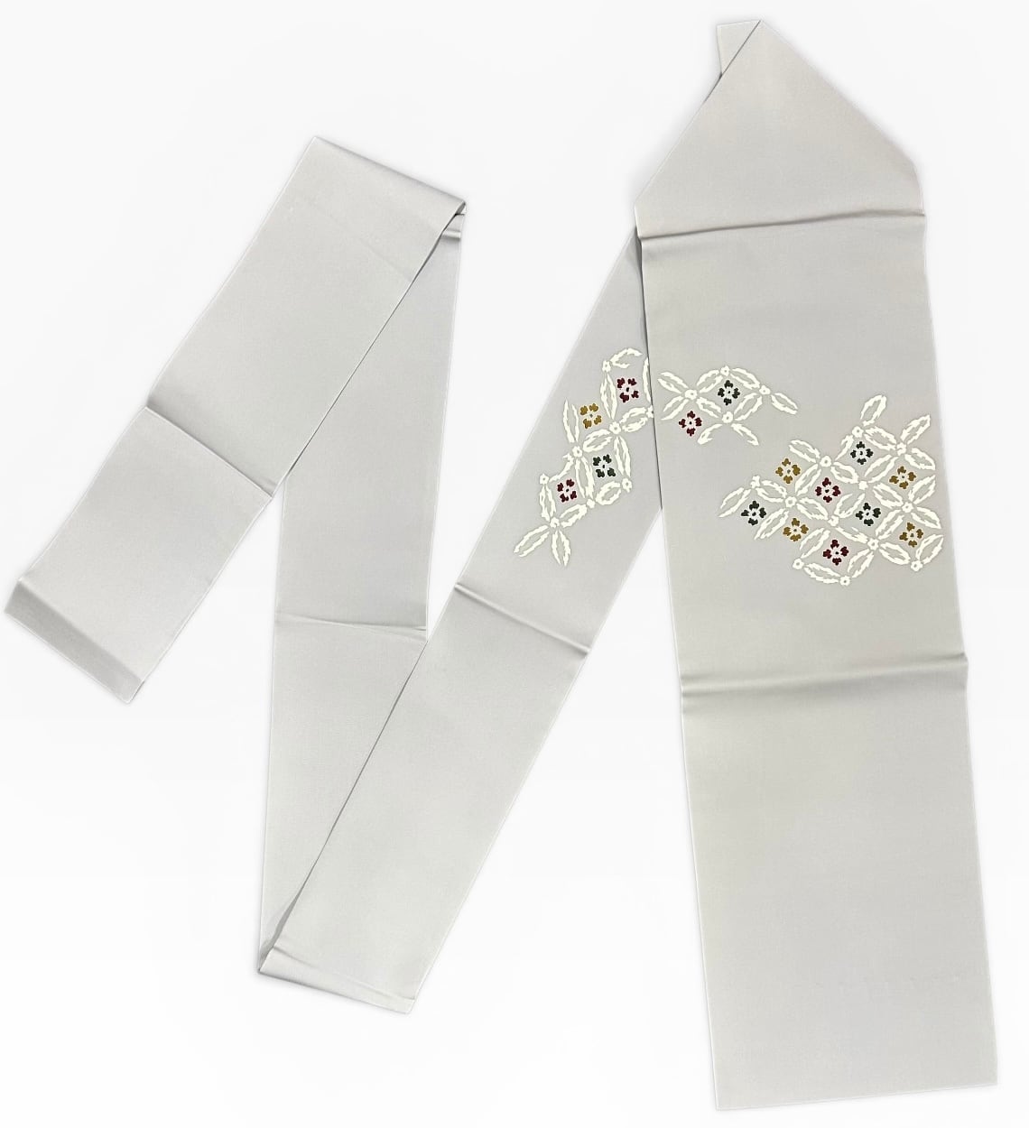 名古屋帯 塩瀬 素鼠色の地 上品な七宝に花文 長さ 385㎝ Q6143