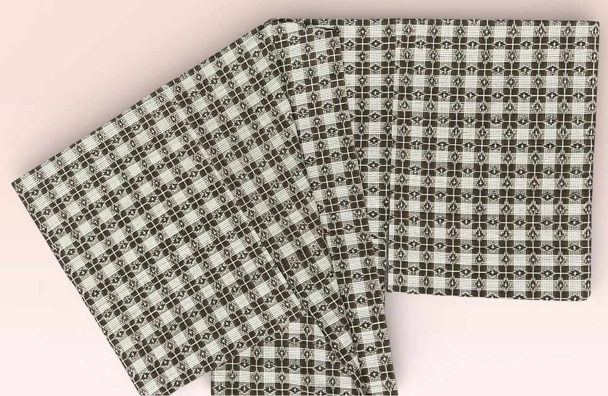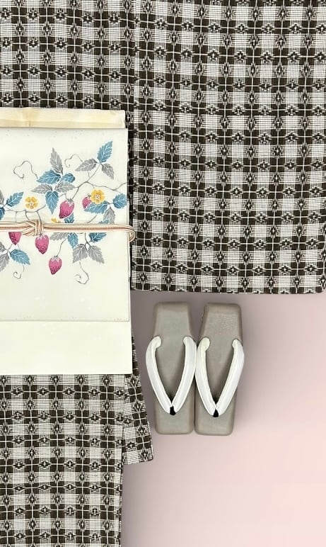 憲法色と檳榔子染色と素色などを用いた格子柄に、巧妙な絣模様が施された魅力的な一品です。細かい格子と大きめの格子の間に広がる絣模様が、全体に洗練された印象を与え、着用時のシーンを華やかに演出します。程よいハリのある地は、着心地も良くご着用いただける逸品です。