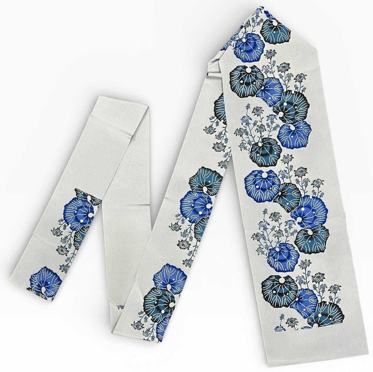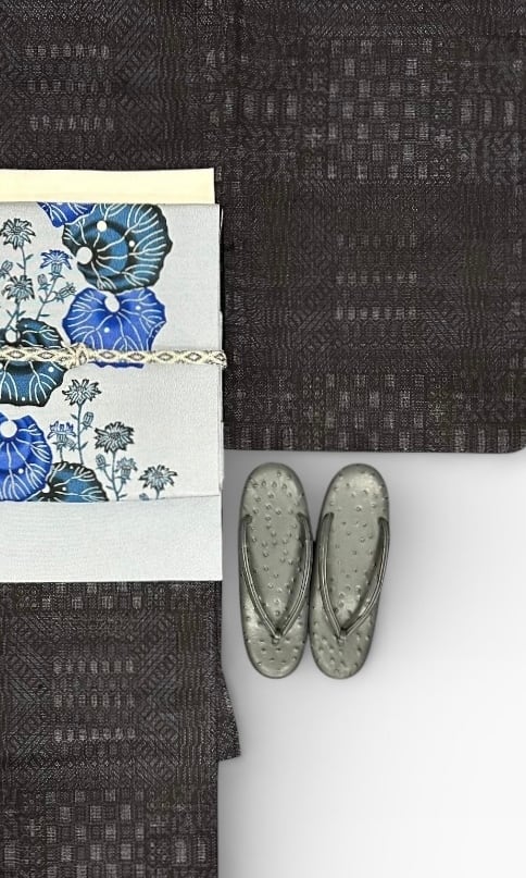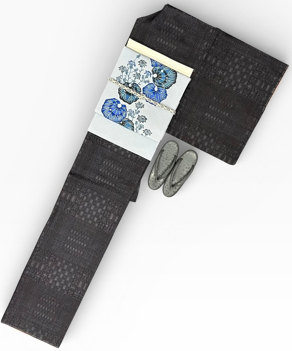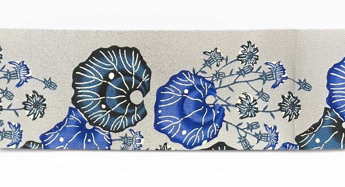 深い灰青色の地に、藍色や瑠璃色、淡黒色の植物柄が施された紅型 名古屋帯です!ちりめん地ならでは質感があなたの着物スタイルを一層引き立てます。関東巻と関西巻で前腹の柄が異なるため、その日の気分やコーディネートに合わせて楽しむことができます。ハリが少なく柔らかめの地は、着用時の快適さを保証し、さまざまな場面で活躍します。