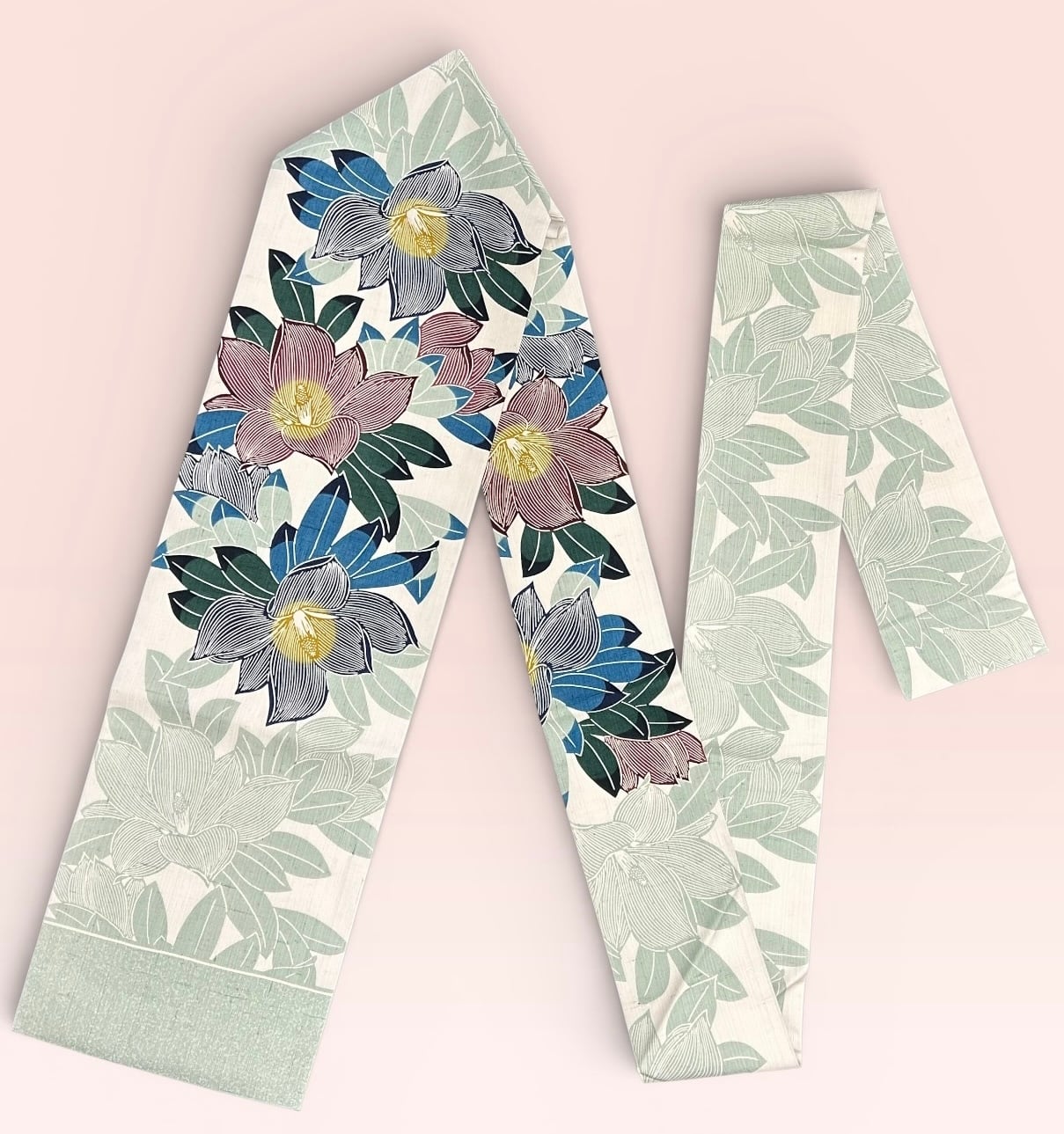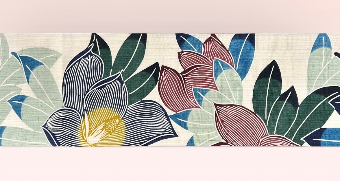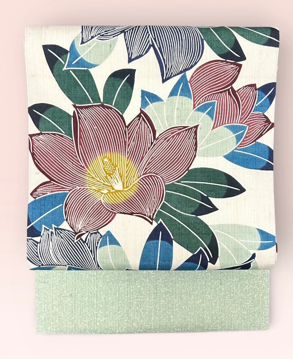 栗山吉三郎さんの型染めの名古屋帯をご紹介いたします!生成り色の地に裏葉柳色のたれ先、蘇芳色と留紺色の花、さらに深緑や花浅葱色の葉が華やかに施されています。ハリがあり、さっぱりとした肌触りであるため、着用の際には非常に心地良いです。