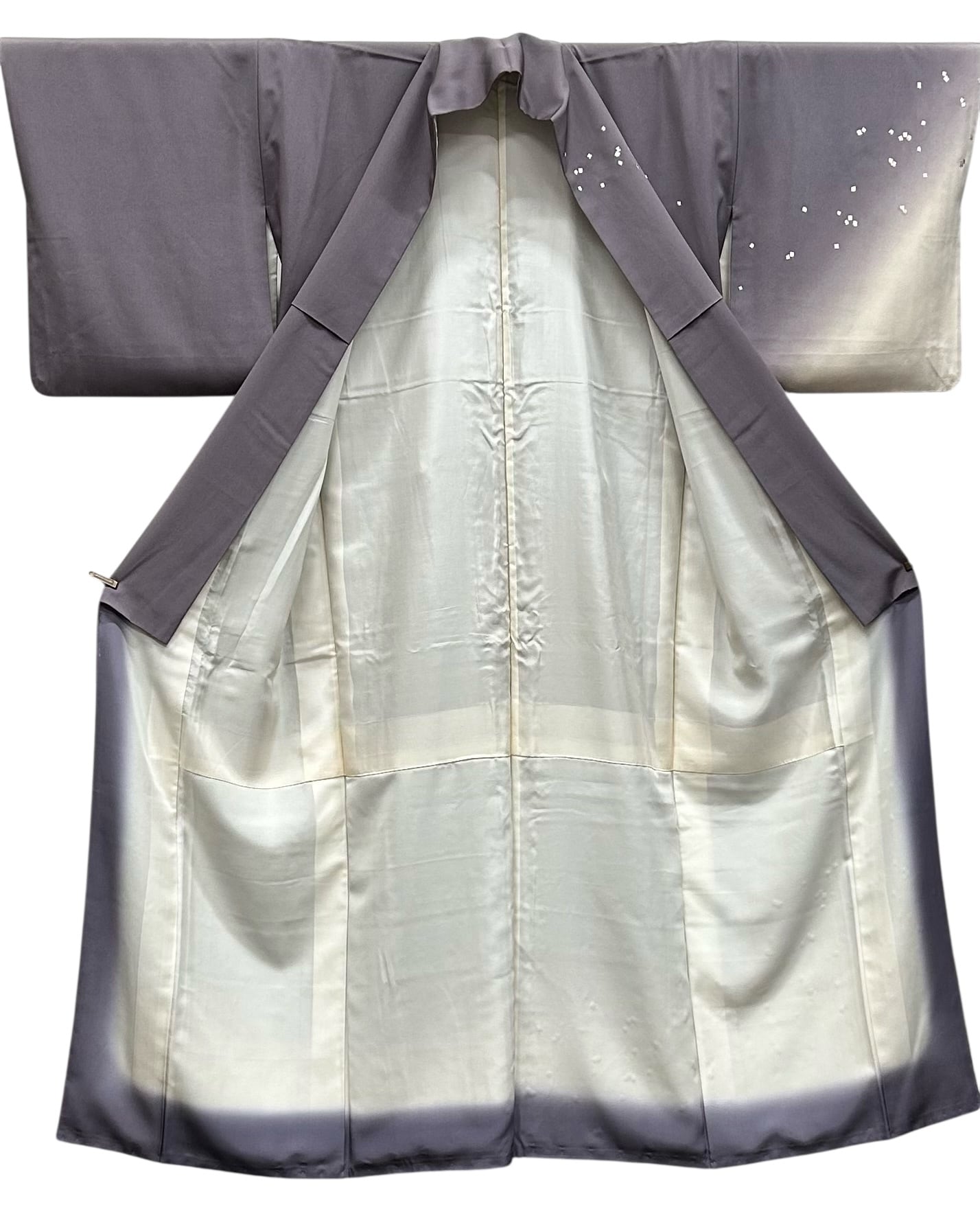 付下げ くすみのある葡萄鼠色~くすみのある濃いめの練色の上品なぼかし地 細かい刺繍の散らし文様 裄丈 67㎝ K6000