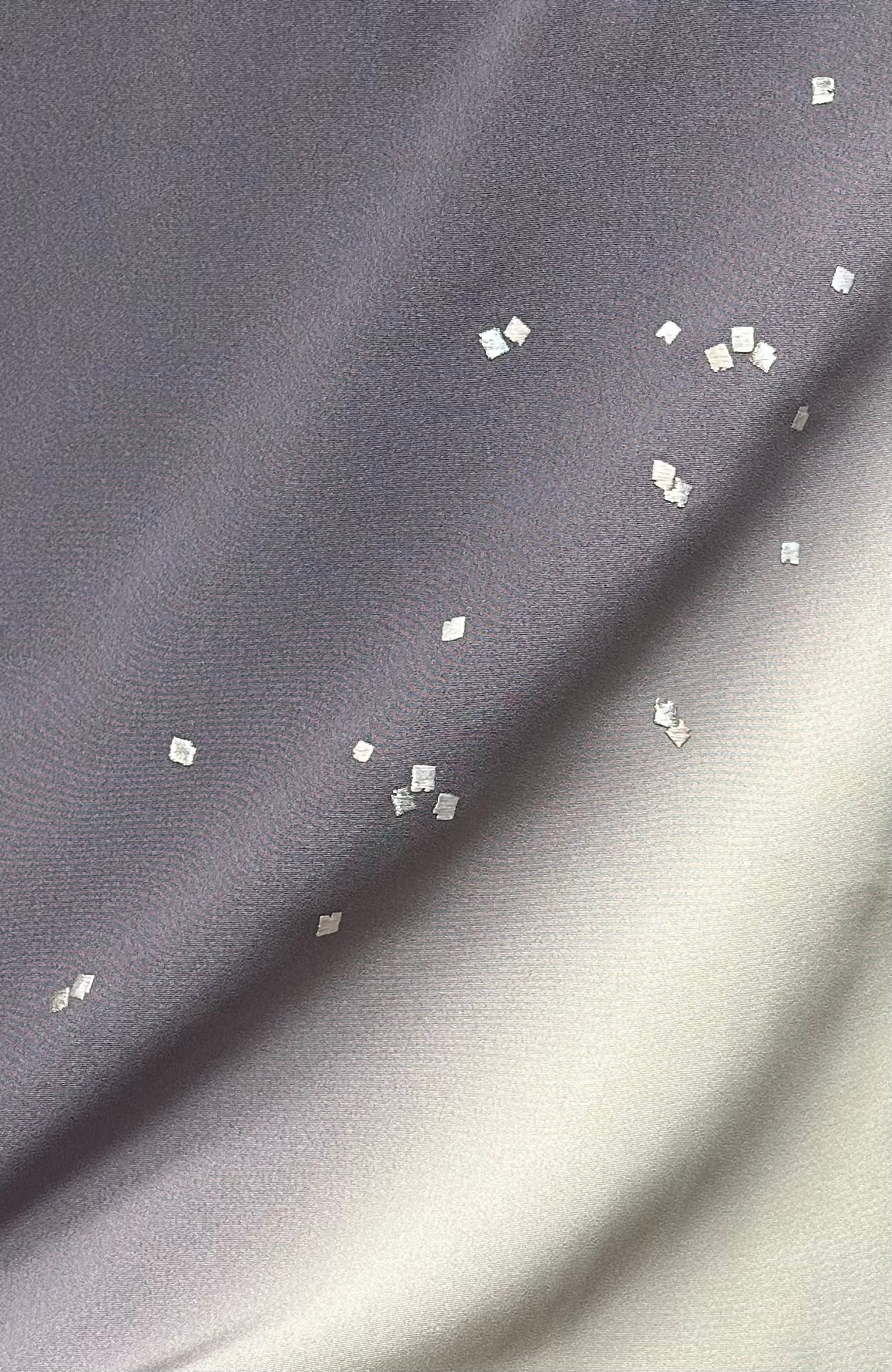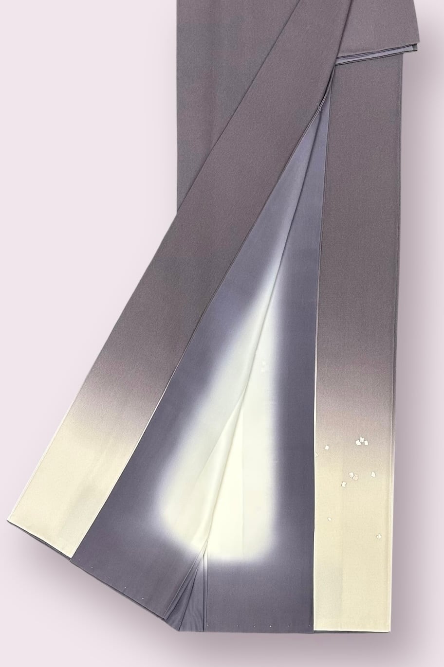 美しい付下げ着物のご案内です。くすみのある葡萄鼠色が裾と袖にかけてくすんだ濃いめの練色に移り変わる暈し地は、優雅な印象を与えます。銀糸や銀桜色や象牙色の細かい刺繍の散らし文様が上品に施され、程よいハリとともになめらかな肌触りが魅力です。特別な一品として、和の美しさを引き立てるお品です。