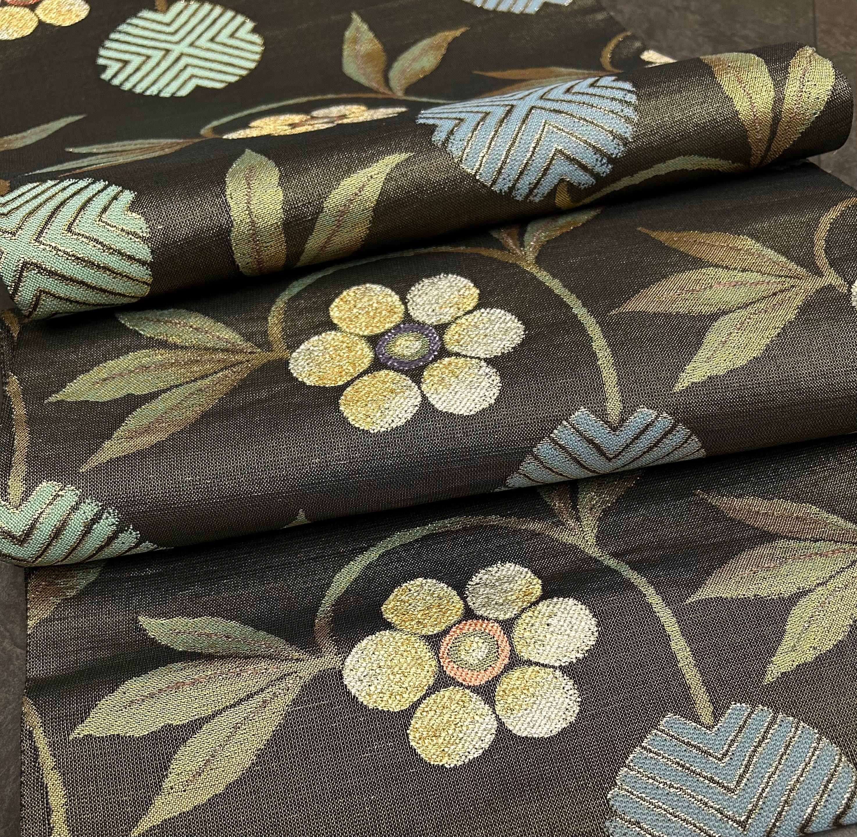華やかさを纏った 袋帯のご案内です。黒地に金糸が織り込まれ、美しい笹蔓模様が施された美しい逸品です。金糸に外花色や山葵色がアクセントのように使われており、目を引きます。薄めで軽やかな仕上がりは、着用時にストレスを感じさせず、心地よい時間をお約束します。