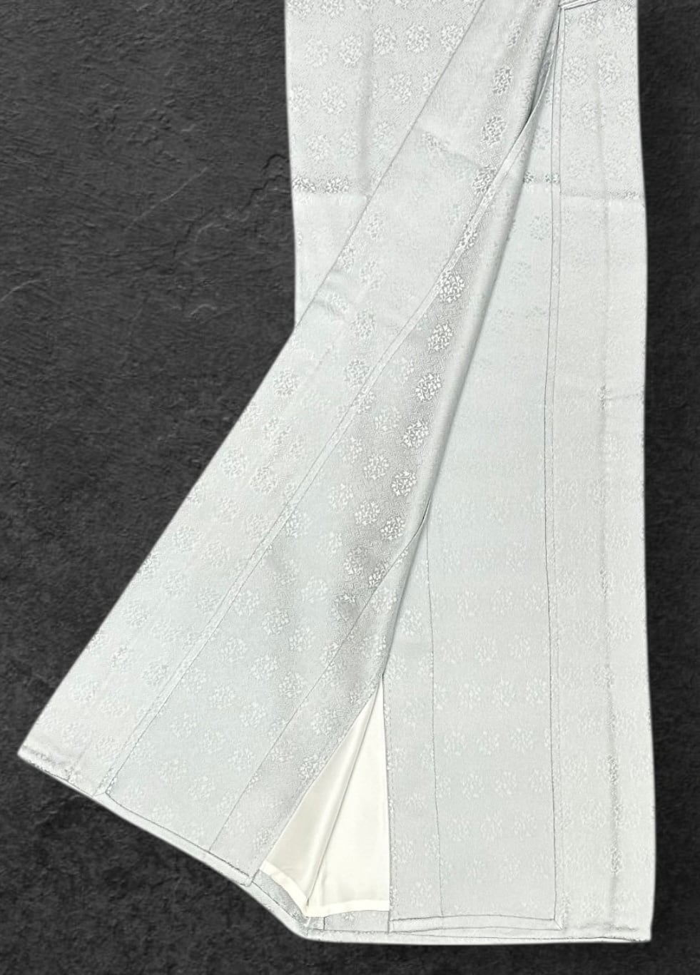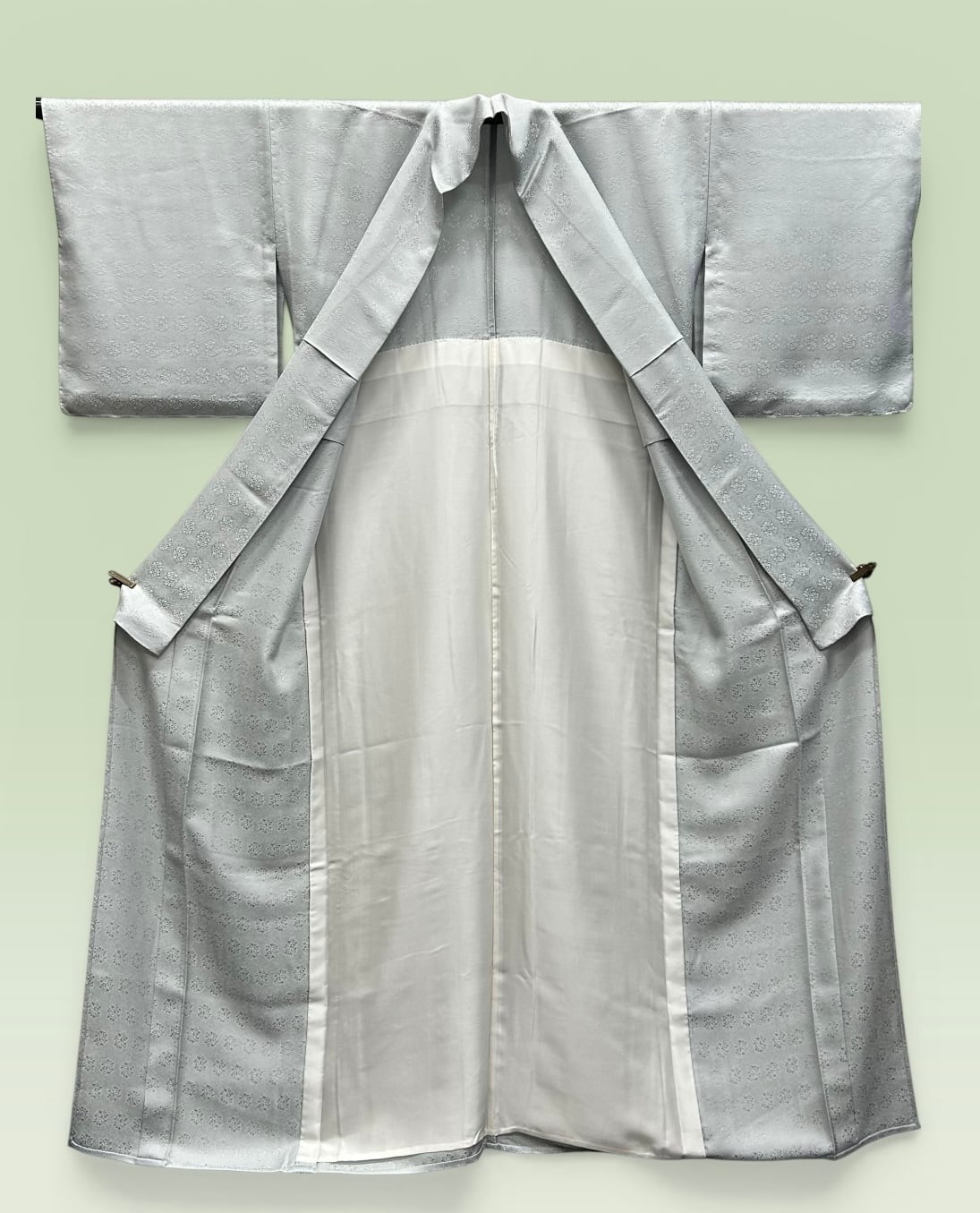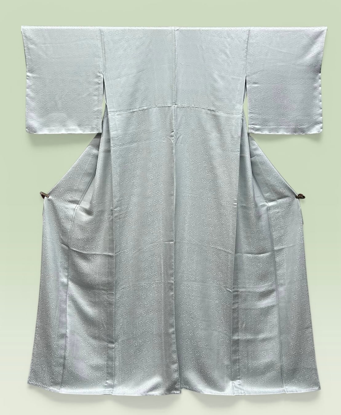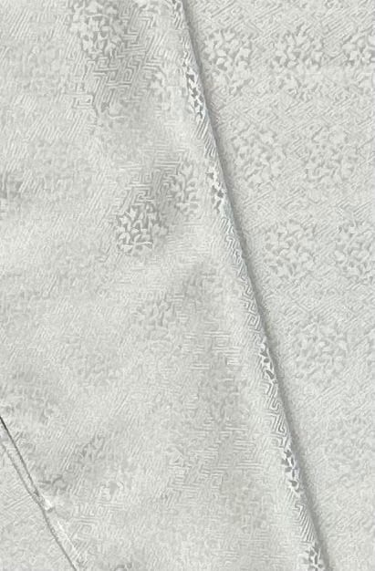 薄めの白緑色、単衣の色無地のご紹介です。沙綾形と小花の精緻な地紋が施されています。こちらのお着物は、しっとりとした柔らかな肌触りが特徴で、着用するたびに心地よさを感じられます。一部にしつけ糸がつきです。