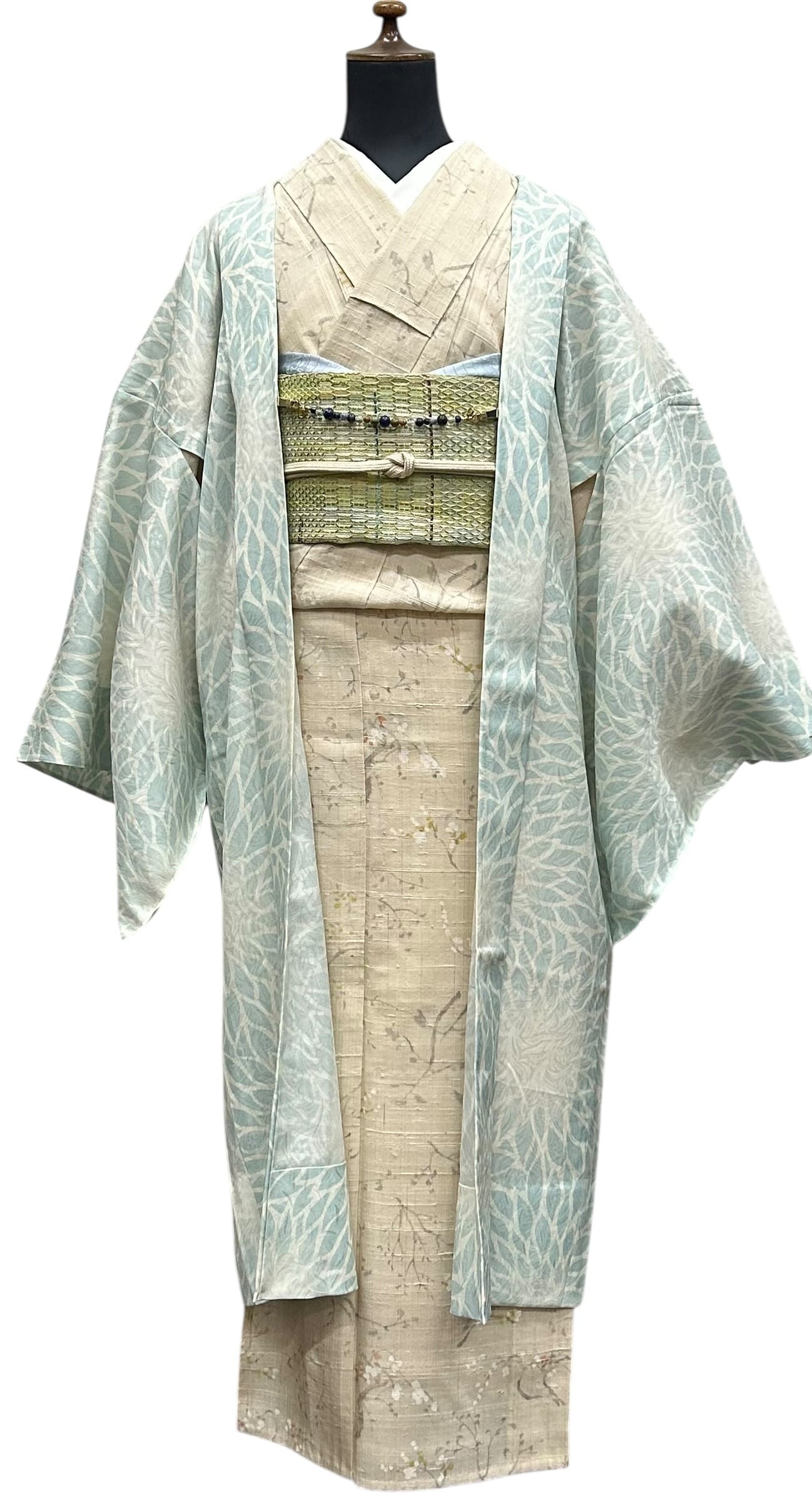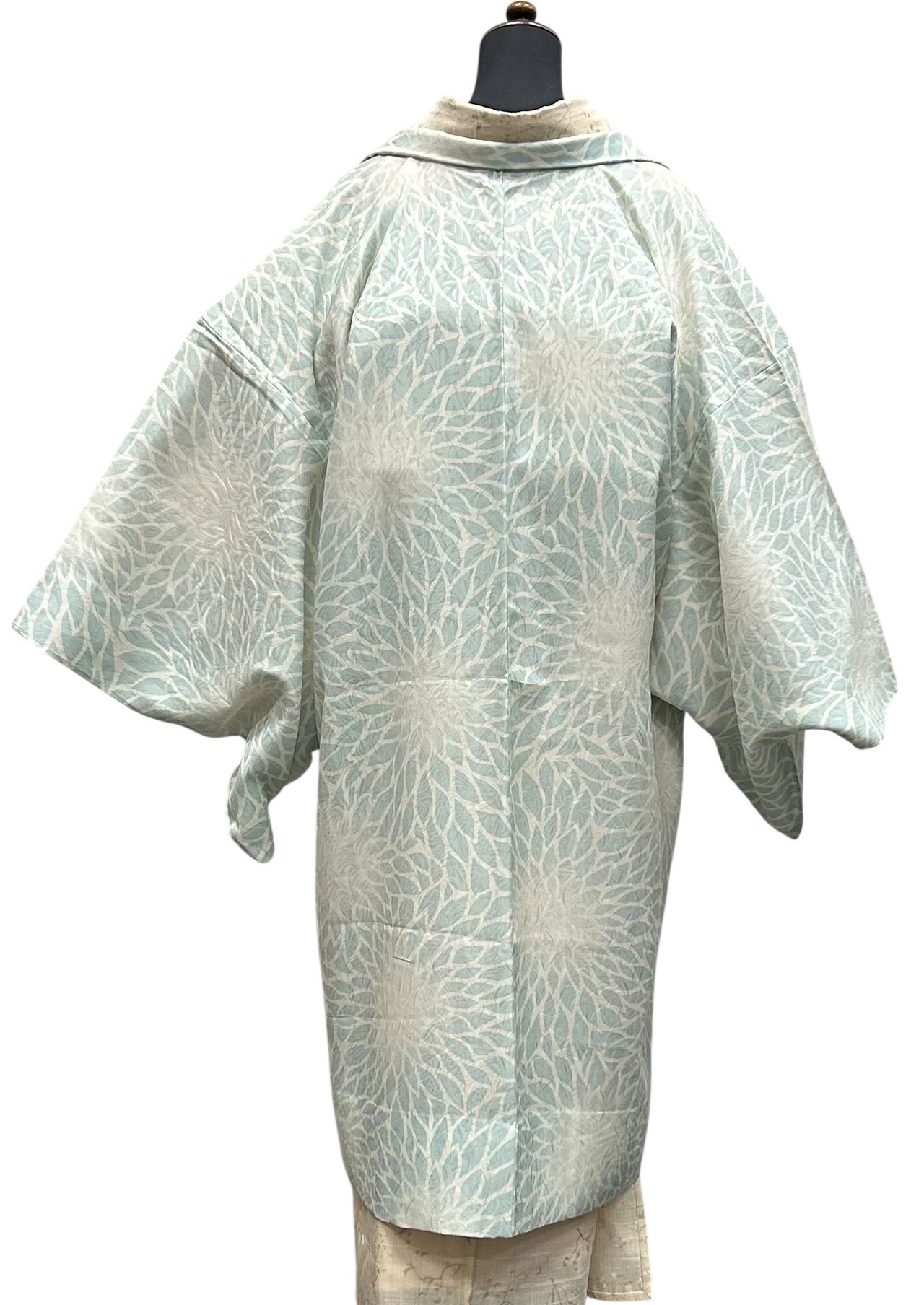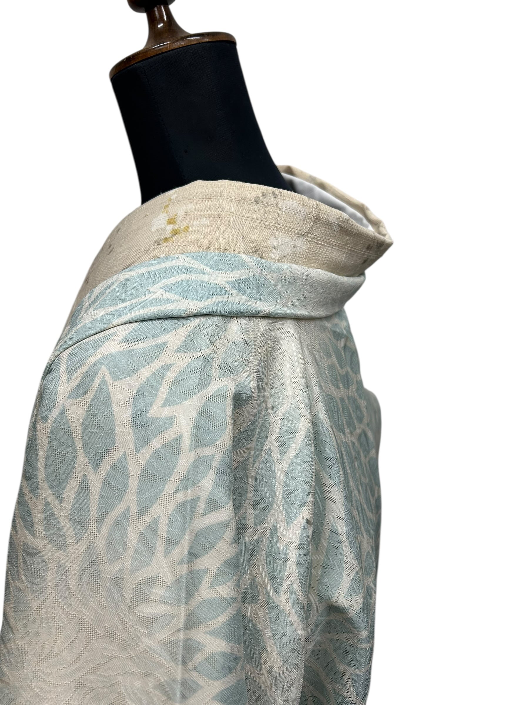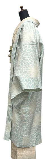 象牙色に錆青磁色で描かれた大柄な花が全体に優雅に広がり、涼しげな印象を与える紋紗の夏羽織です。透け感のある生地は、サラッとした肌触りで、これからの季節にぴったりのアイテムで塵除けとしても長くお使いいただけるお品です。
