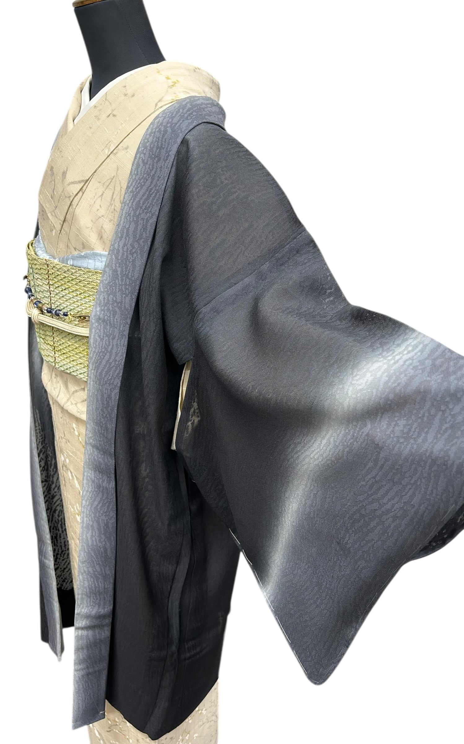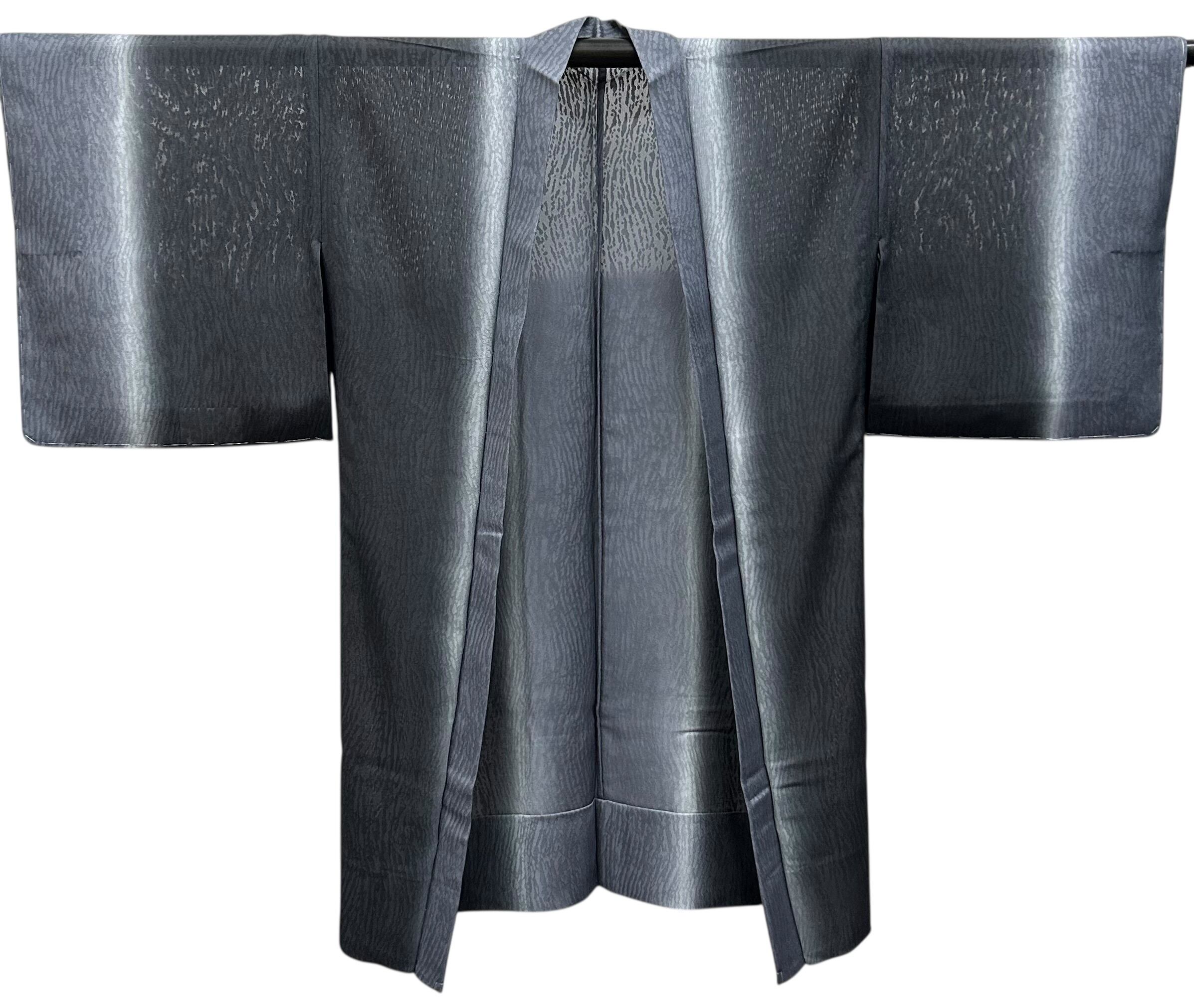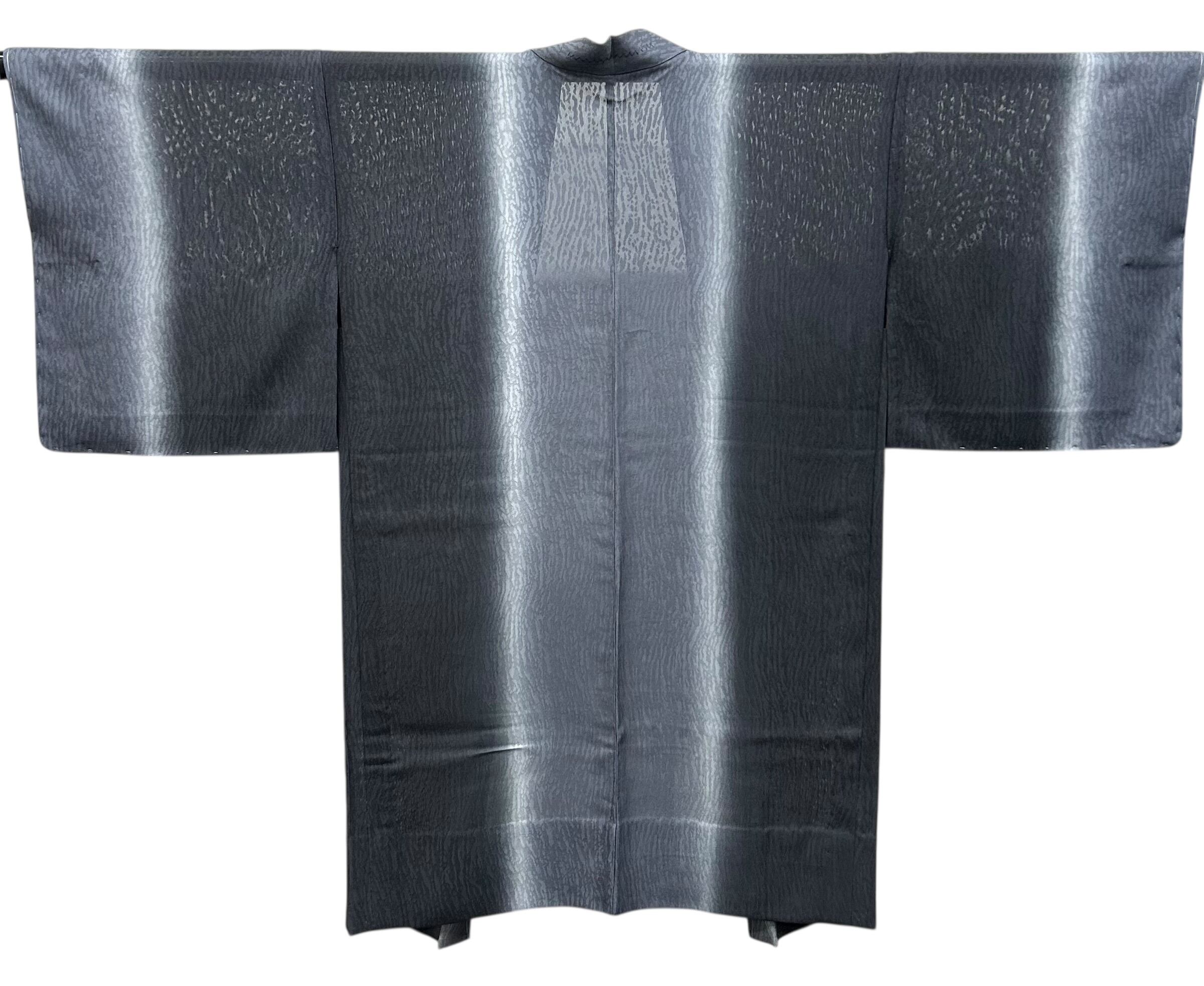 黒~灰青~蕎麦切色~藍墨茶色のグラデーションが魅力の夏の紋紗羽織です。サラッとした肌触りの生地は、暑い夏の日でも快適にお使いいただけるアイテムで、塵除けとしても重宝することでしょう。美しいカラーのグラデーションは、様々なシーンで活躍し、あなたの装いに華やかさを添えます。