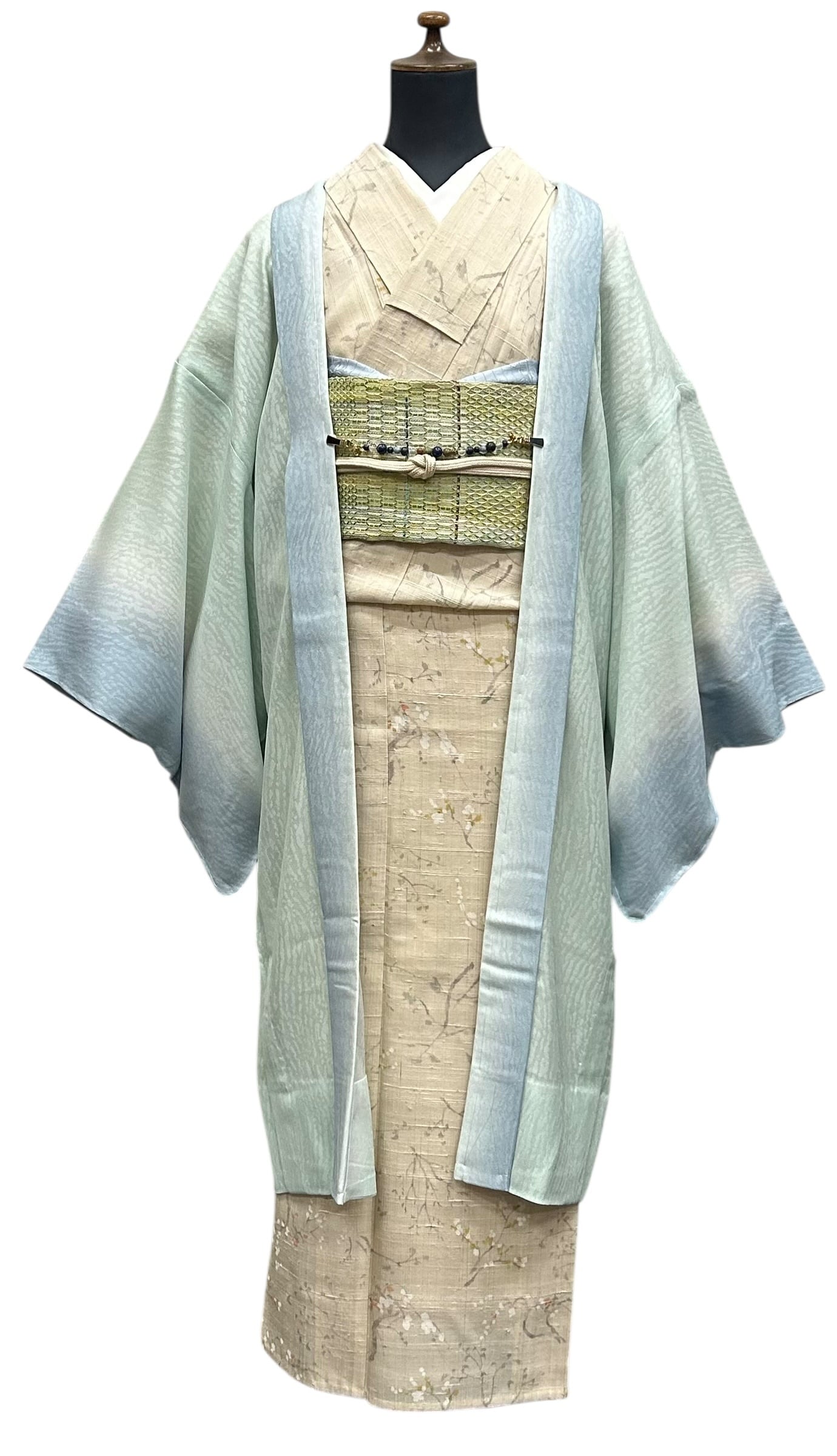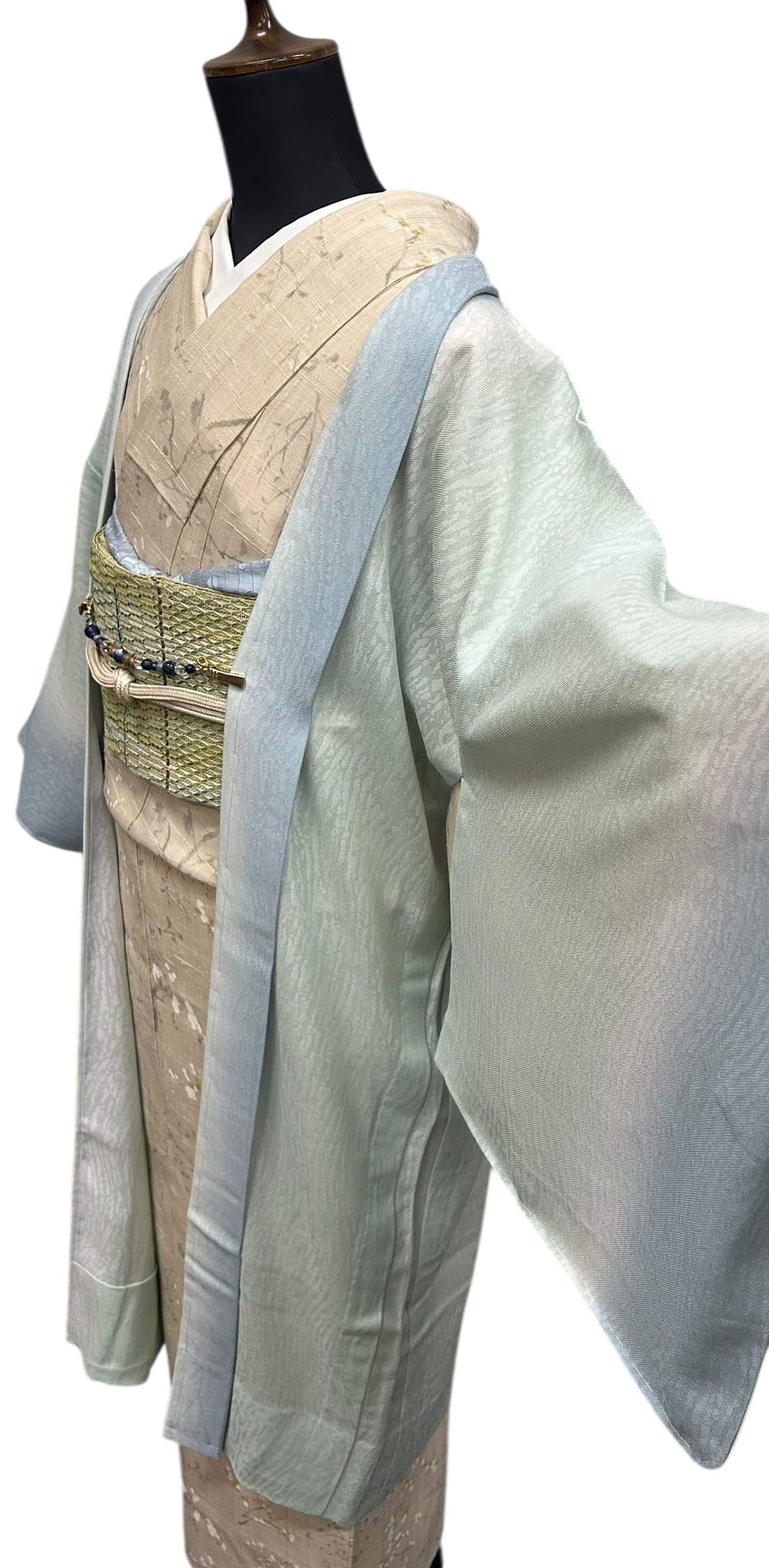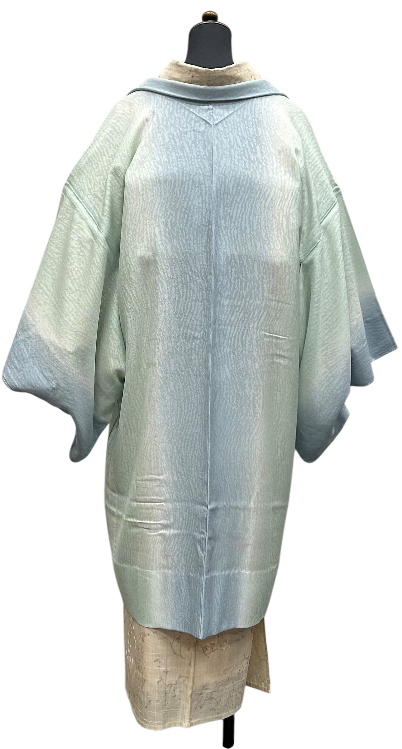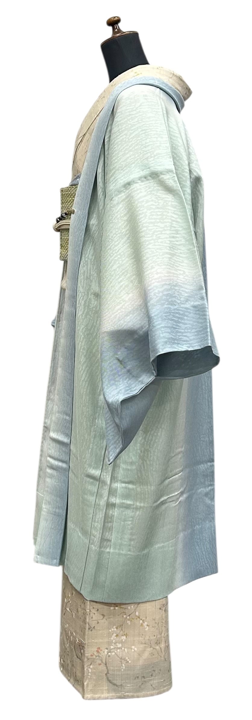 薄い薄萌葱色~白~くすんだ浅縹色のグラデーションが特徴の美しい紋紗の夏羽織です。サラッとした肌触りの生地は、暑い夏の日にぴったりの涼やかさをもたらし、塵除けとしてもお役立ていただけるので長くお使い頂けるアイテムです。