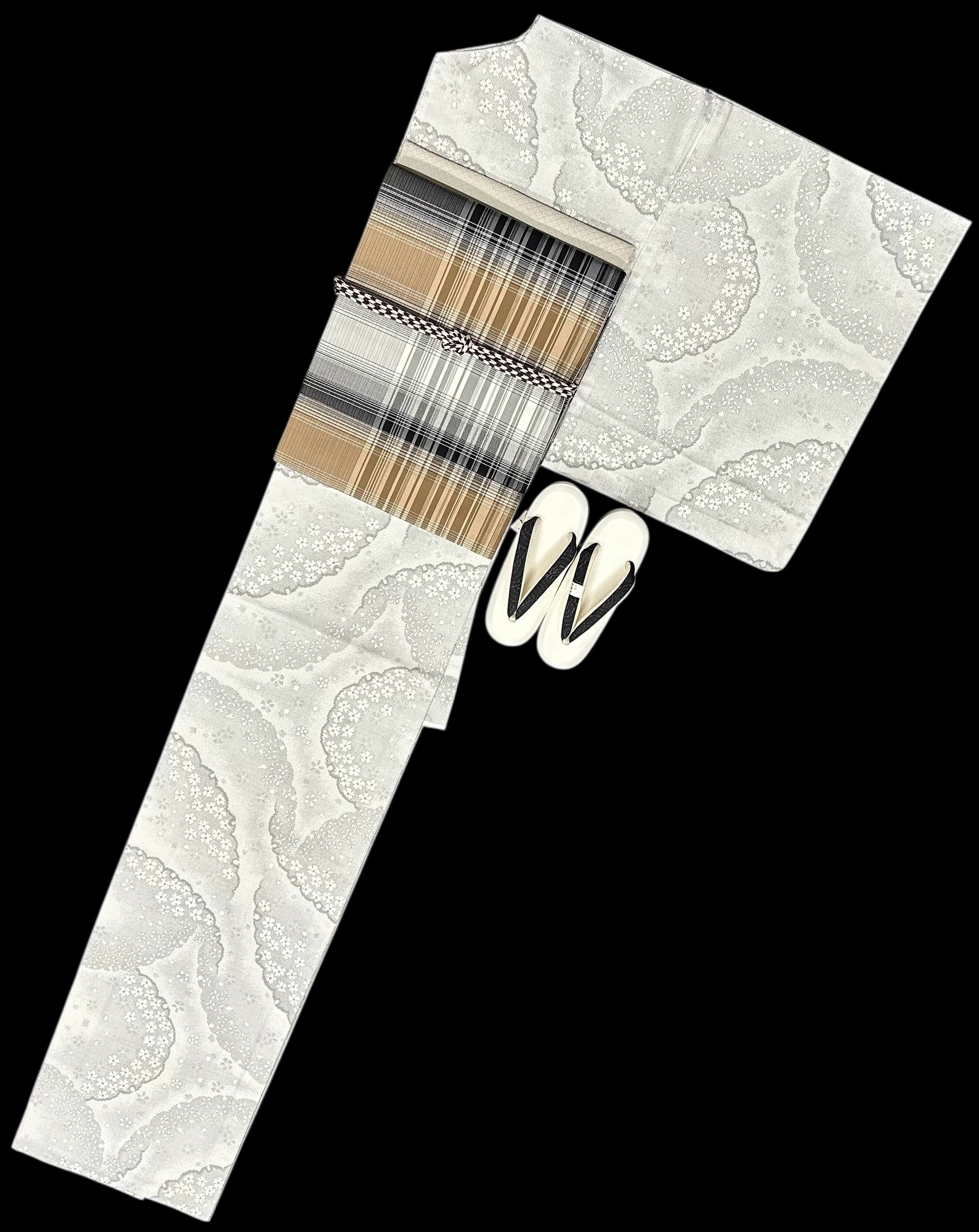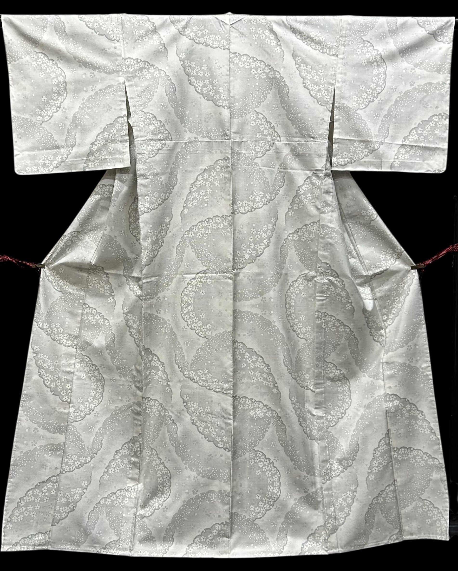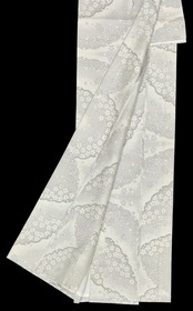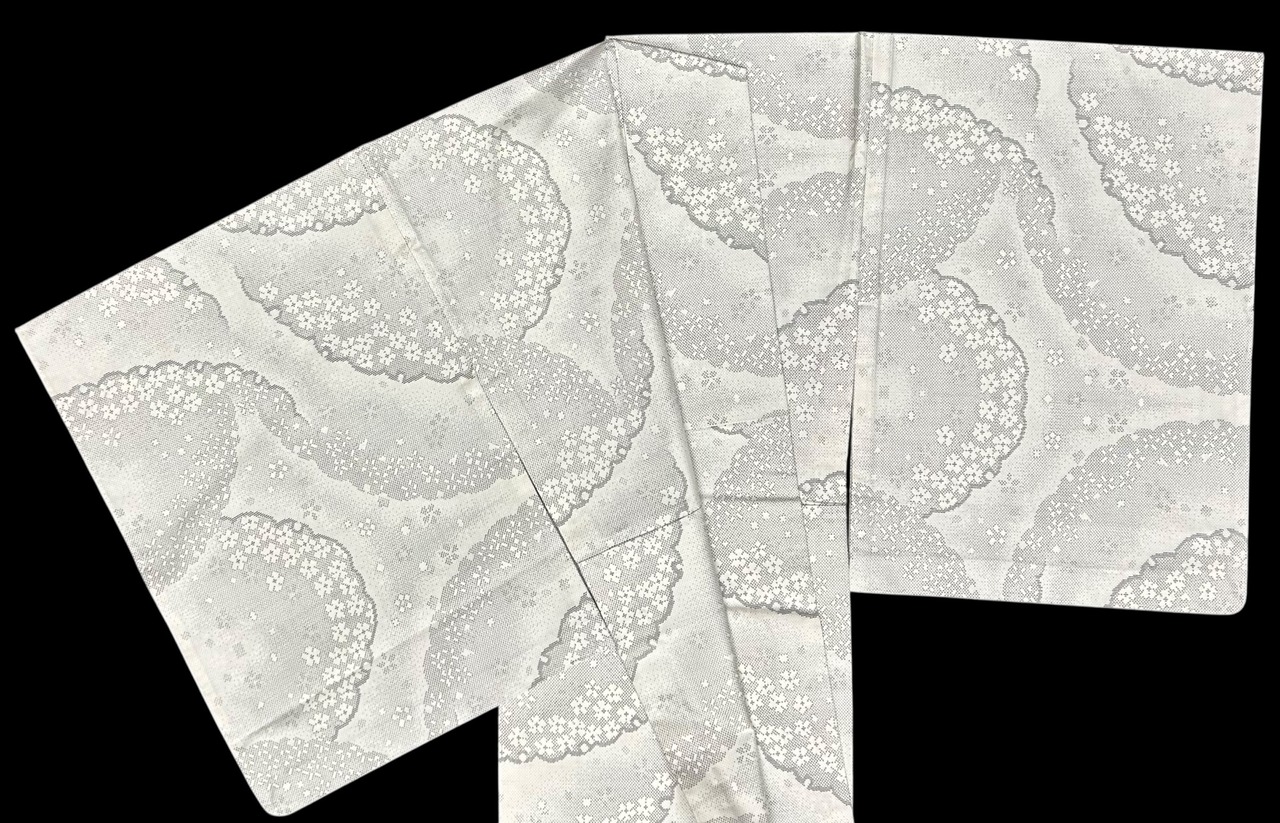 上品な単衣の白大島着物のご紹介です。胡紛色の地に、灰色の濃淡が織りなす大きな雪輪模様が印象的で、その中に舞い散る小花が優雅さを加えています。程よいハリ感とサラッとした肌触りは、着心地の良さを感じさせる逸品です。一部しつけ糸つきです。