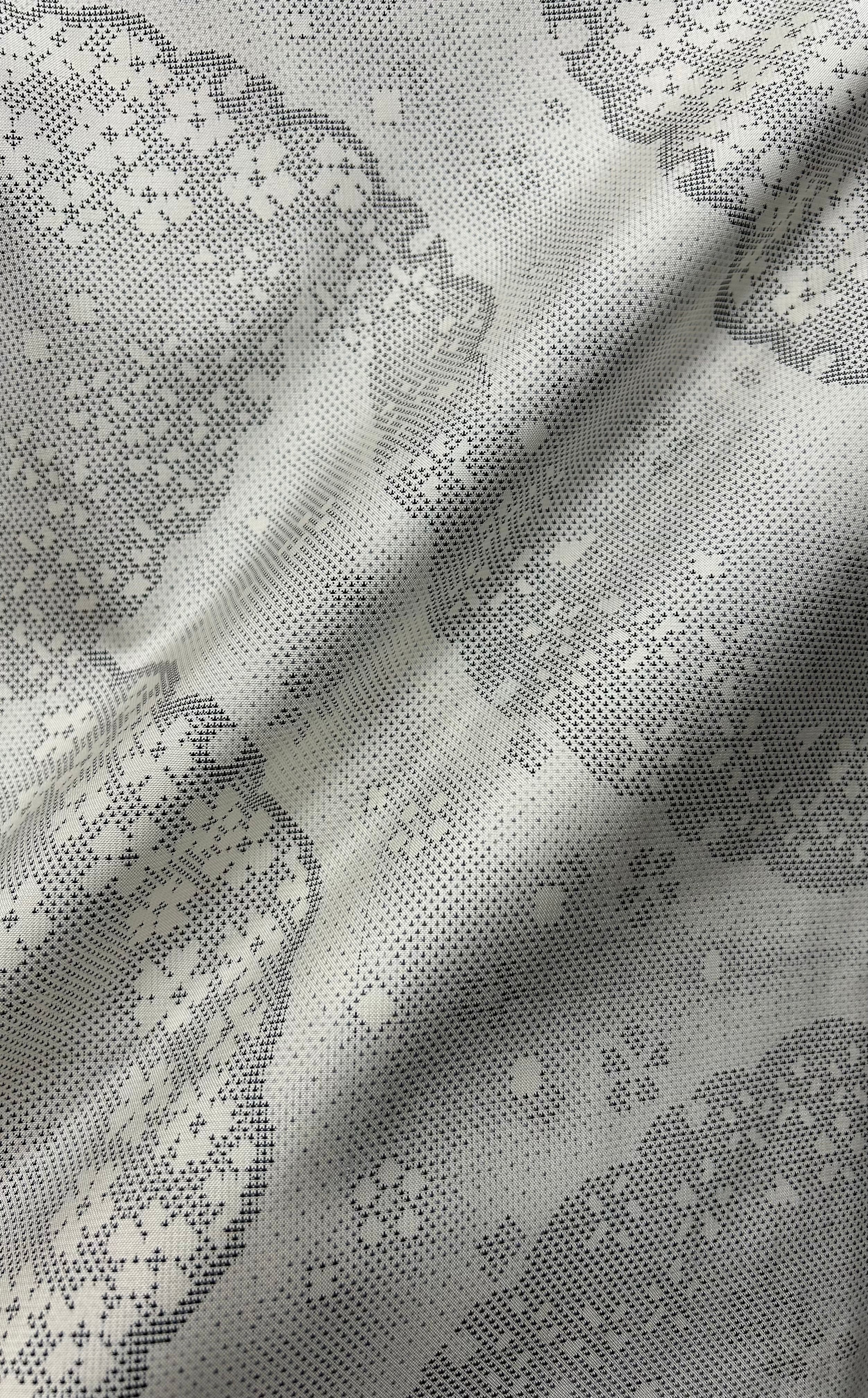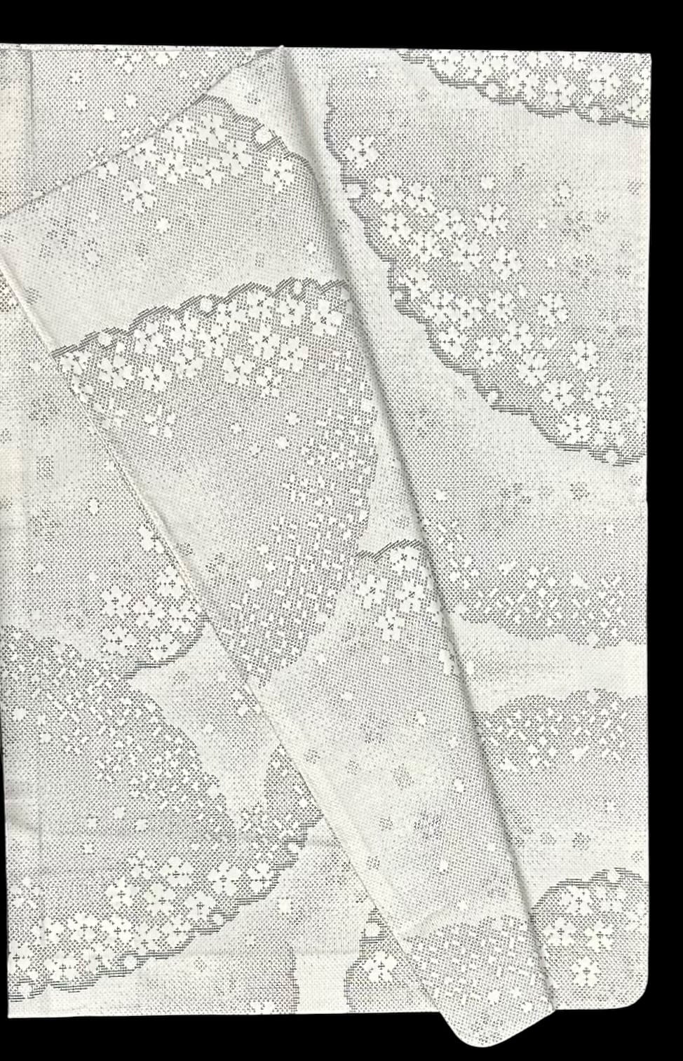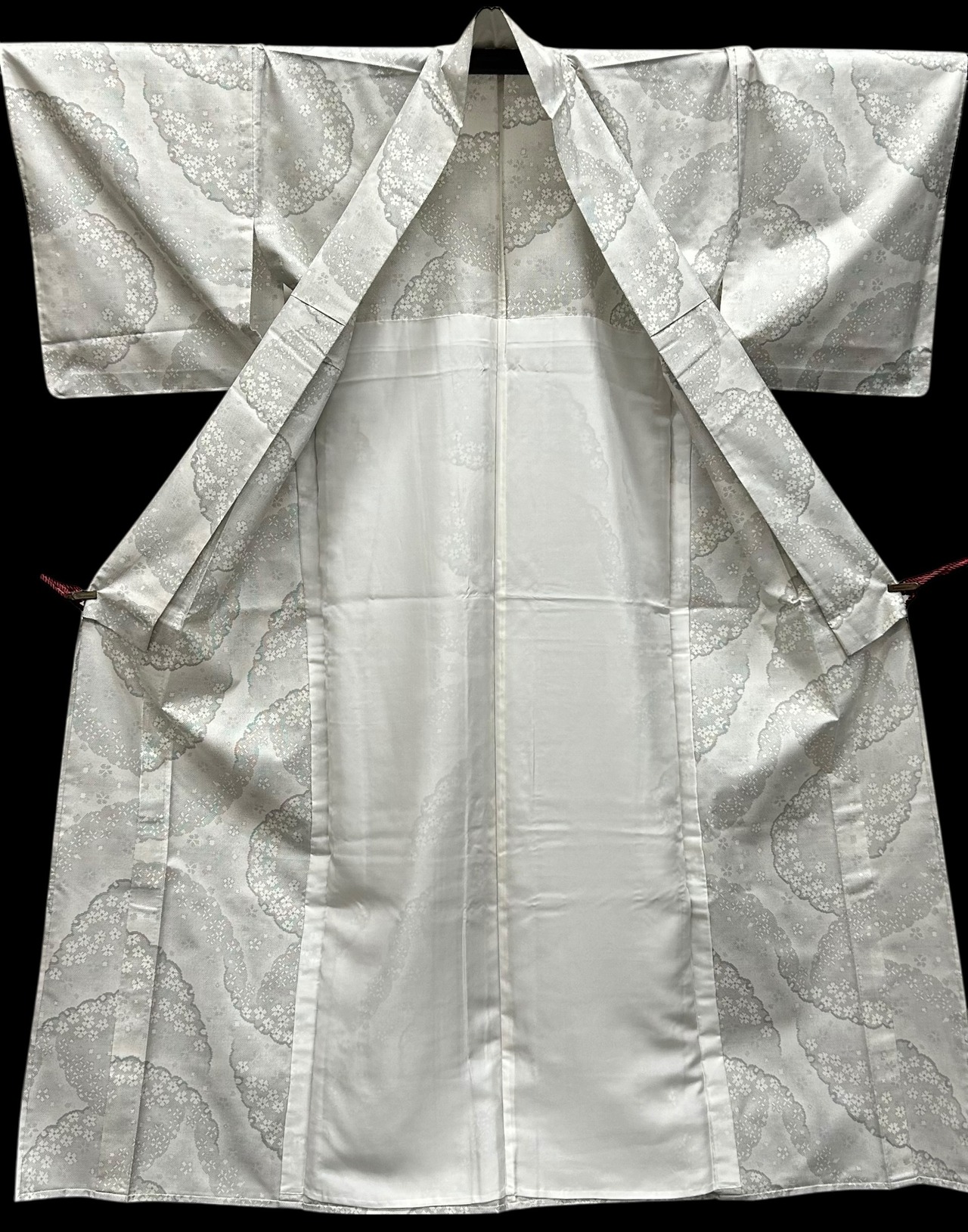 上品な単衣の白大島着物のご紹介です。胡紛色の地に、灰色の濃淡が織りなす大きな雪輪模様が印象的で、その中に舞い散る小花が優雅さを加えています。程よいハリ感とサラッとした肌触りは、着心地の良さを感じさせる逸品です。一部しつけ糸つきです。