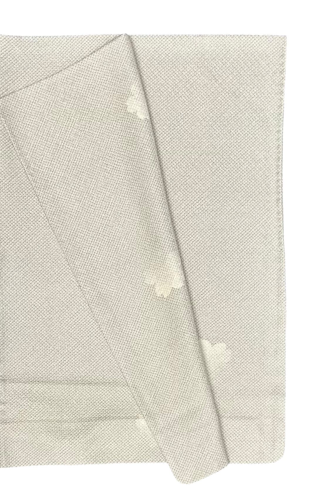 上品で優雅な単衣・小紋着物のご案内です。細かい疋田柄の白橡色と亜麻色の穏やかな地に、ほんのり浮かび上がる桜の花の飛び柄が、着物全体に華やかな印象を与えています。さっぱりとした肌触りで、心地よい着用感をお楽しみいただける一品です。