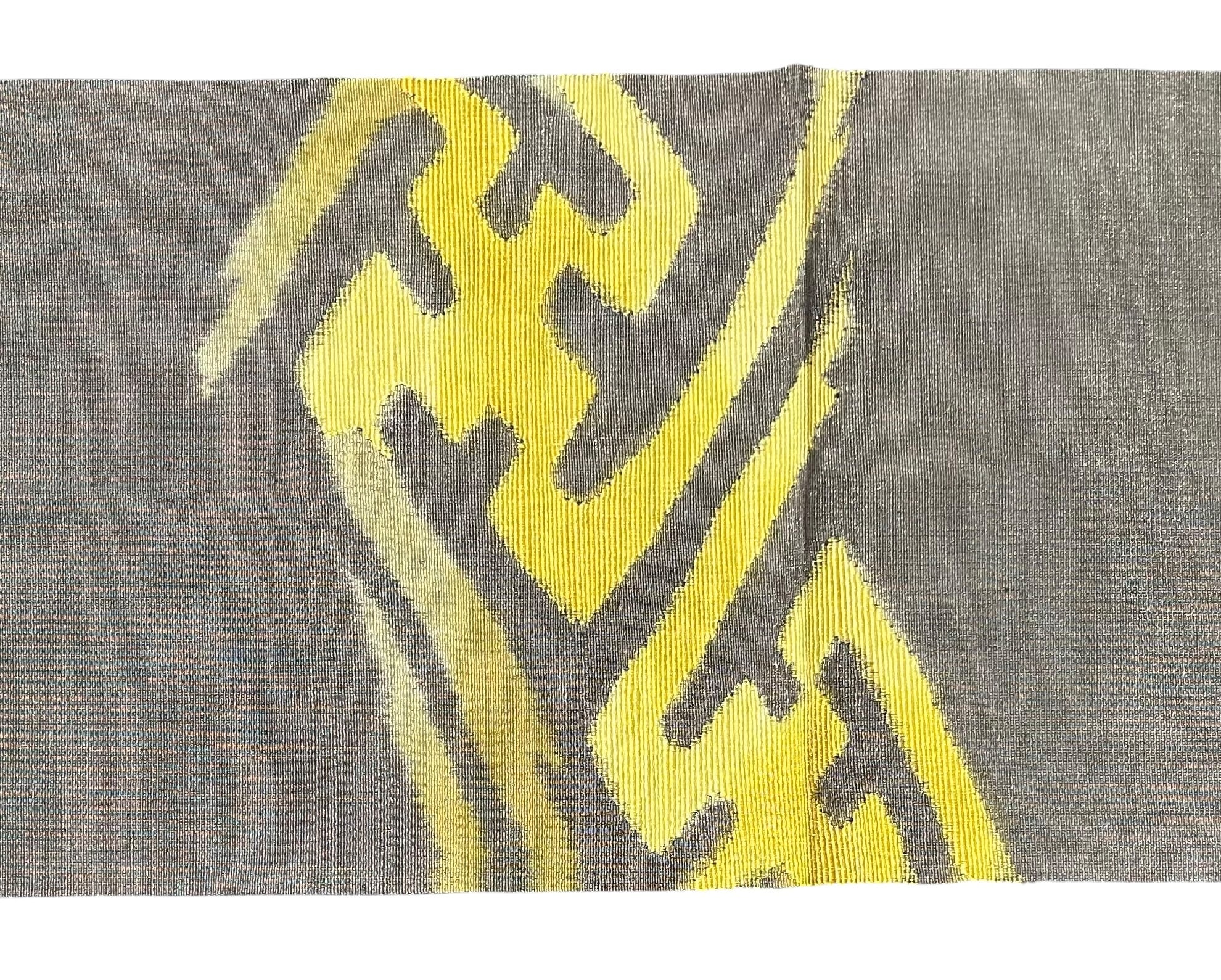 上品で魅力的な八寸名古屋帯のご案内です。ほんのり金糸が織り込まれたうすめの涅色の地に、山吹色や芥子色の濃淡の 紗綾形紋様が施されています。程よいハリ感があり、幅広くお楽しみいただけるデザインとなっています。