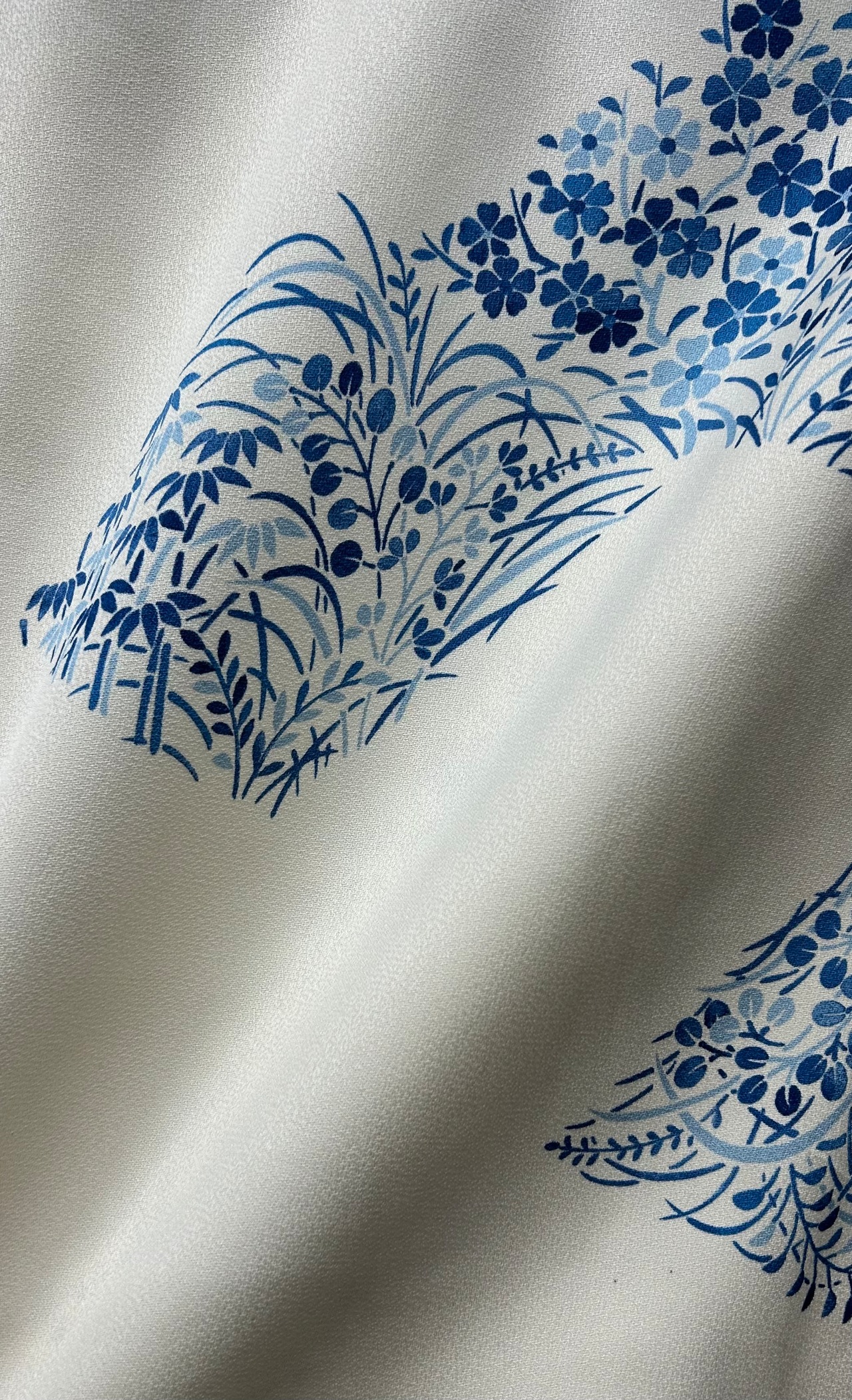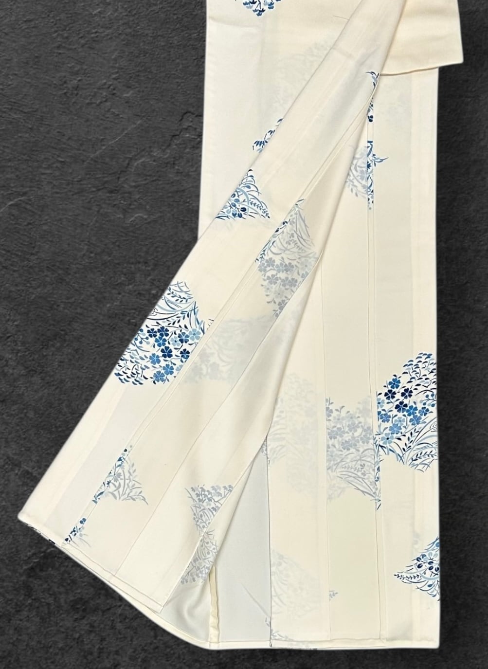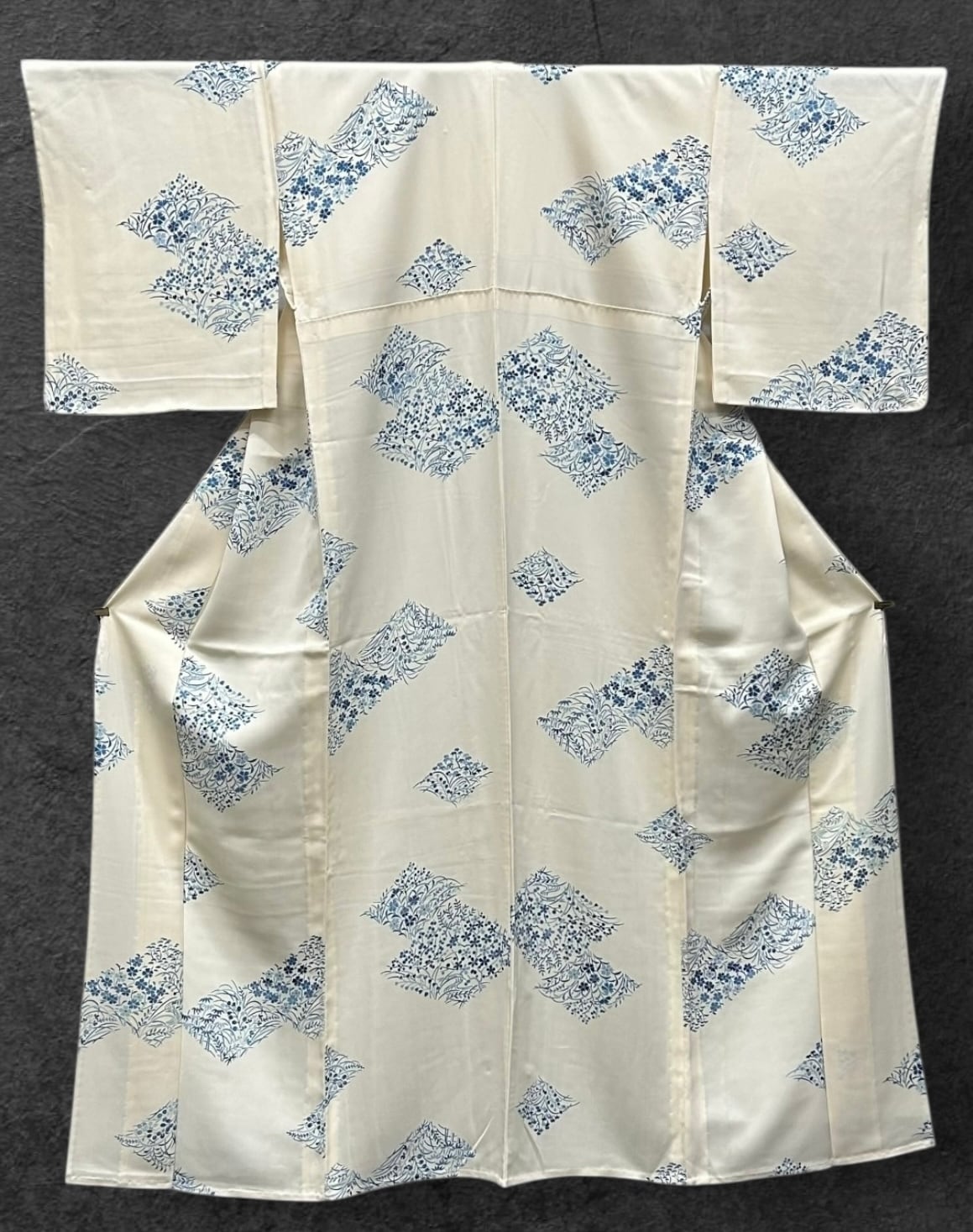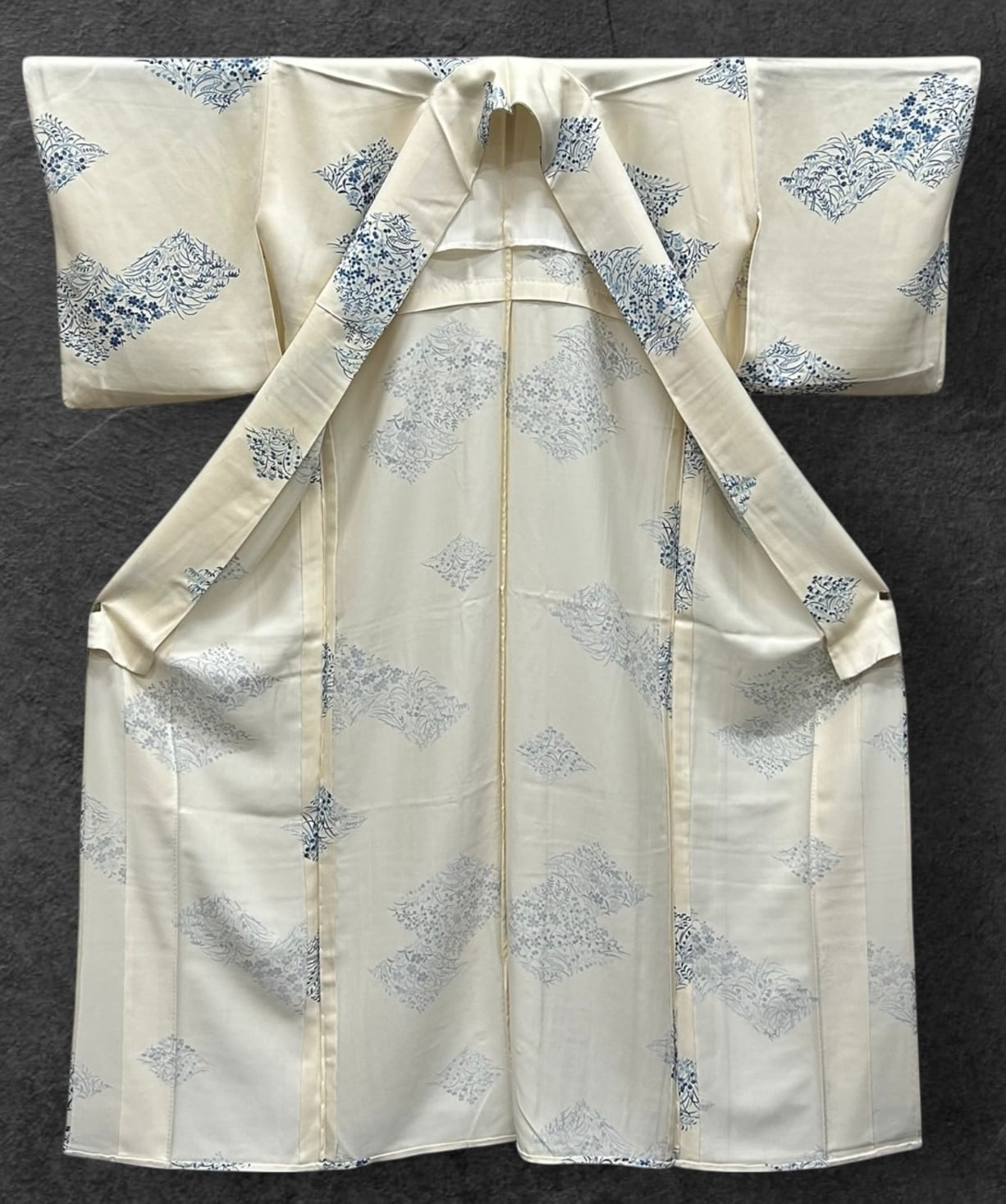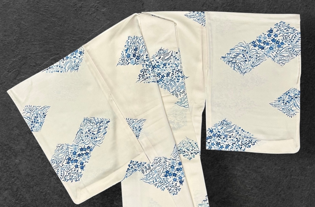 優雅な単衣・小紋着物のご案内です。鳥の子色の地に、秘秘色や藍色の濃淡で施された四季の花々が、菱形に型どられ華やかな印象を与えています。着心地の良いなめらかな肌触りで、日常から特別なシーンまで幅広くご活用いただける一品です。しつけ糸つきです。