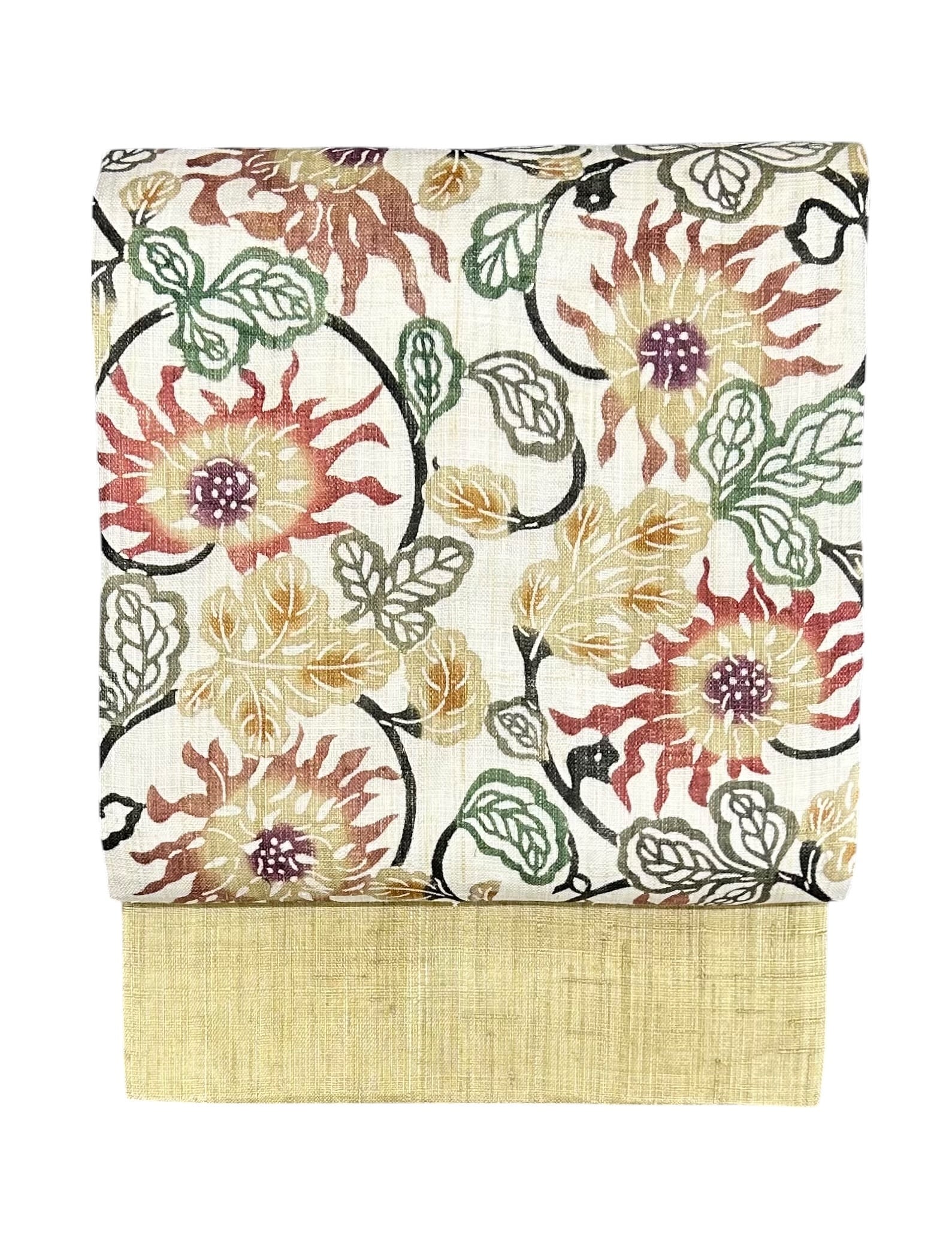 栗山吉三郎さんの型染めの名古屋帯のご紹介です。生成り色の地に薄い木蘭色のたれ先が優雅に施され、赤茶色の濃淡の花々や海松色や草色の葉が華やかさを引き立てます。しっかりとしたハリ感があり、さっぱりとした肌触りで、軽やかな印象を与えてくれる逸品です。反端、落款付き、お仕立て品です。
