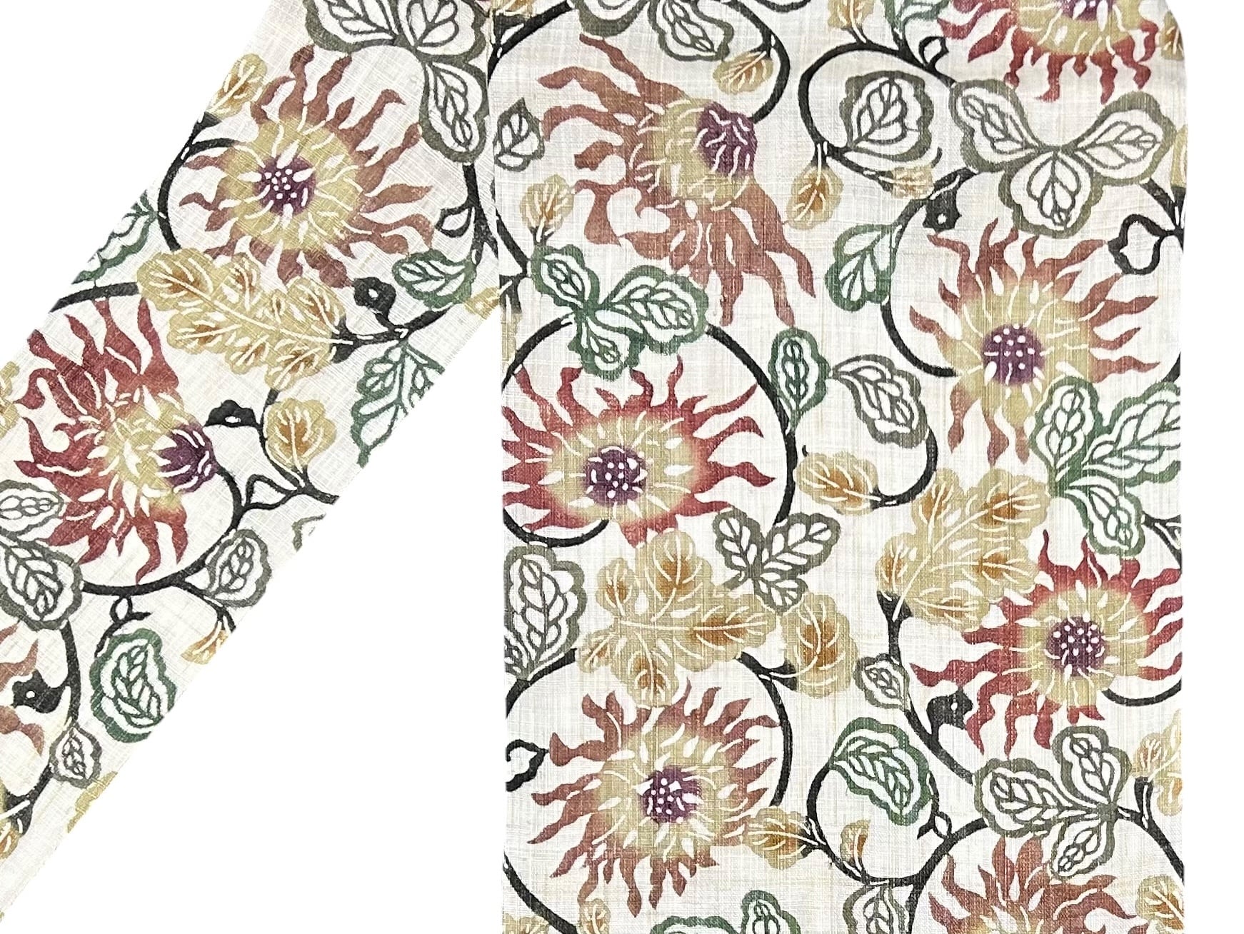 名古屋帯 和染 本大麻帯 栗山吉三郎 落款有り 生成り色の地 花唐草文様 お仕立て品 長さ 376㎝ Q6650