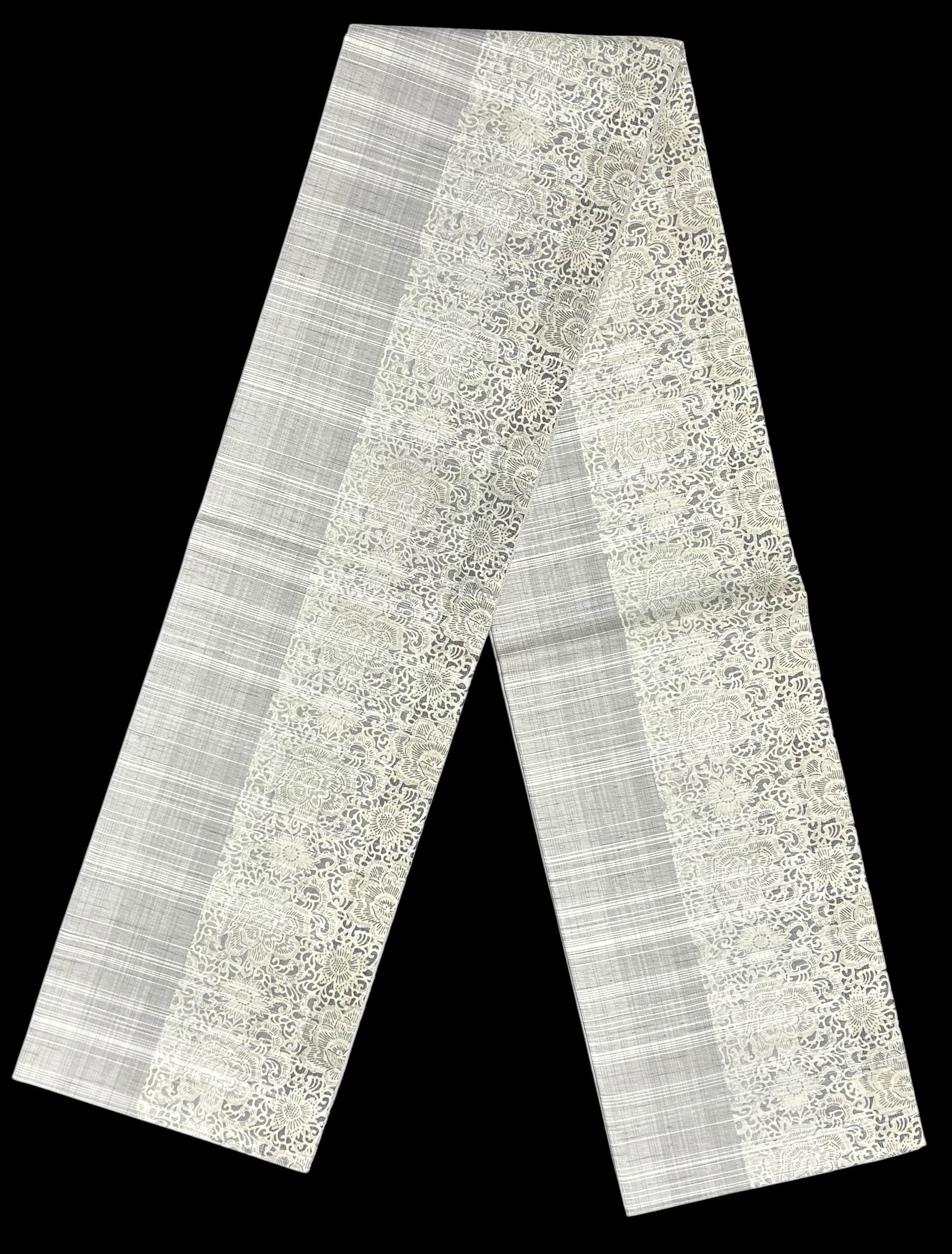袋帯 紬地 生成り色と絹鼠色などにほんのり銀糸 変わり格子と草花/生成り色と絹鼠色の細かい横縞 長さ 462㎝ Q6641