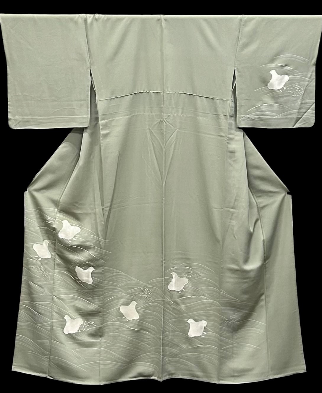 単衣 訪問着 明るめの柳茶色の地 白い波流水文様と千鳥 銀こま刺繡 裄丈 68㎝ K4473
