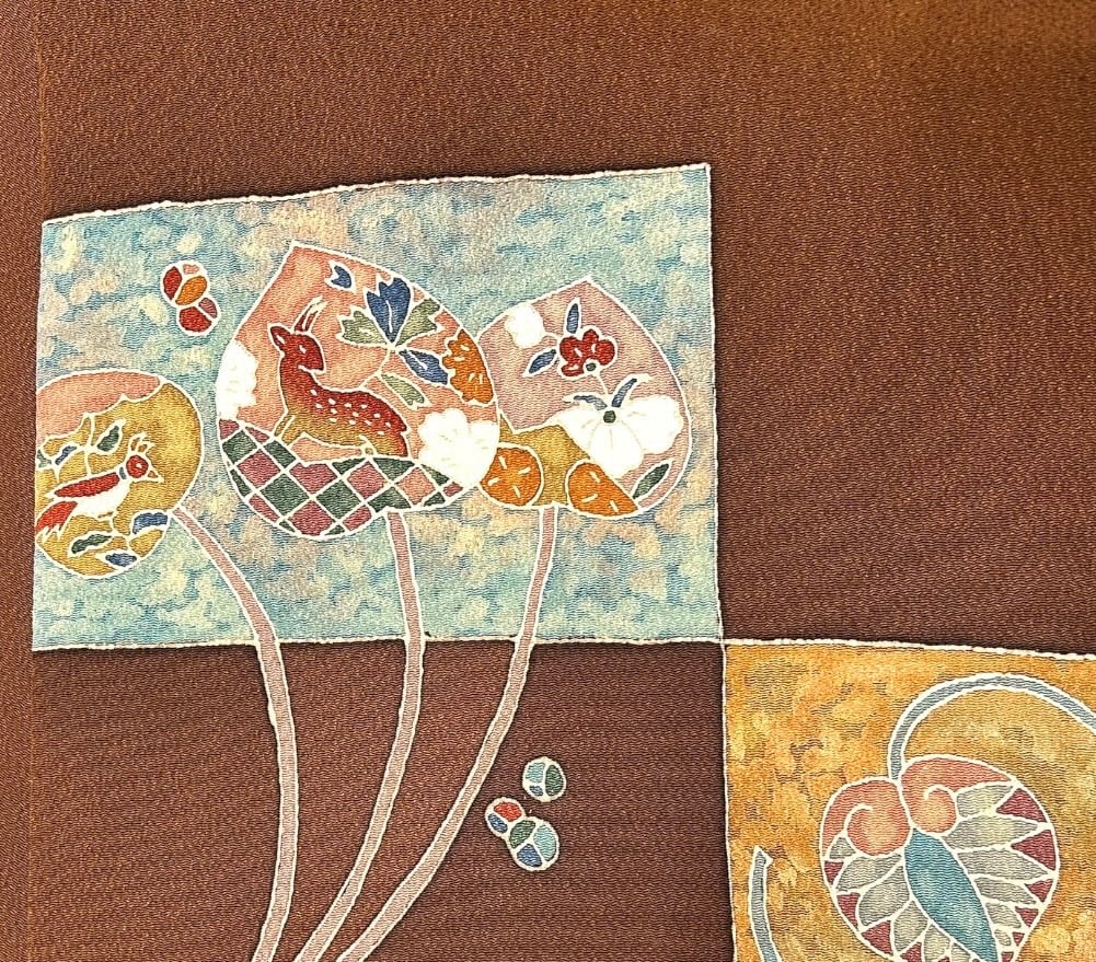 褐色の地に、葵に鹿や鳥などの幻想的な染めが特長の開き名古屋帯です。この一品は、柔らかめしっとりとした肌触りで、前腹のお柄は関東巻と関西巻で異なり、コーディネートの幅を広げてくれるのも嬉しいポイントです。ちりめん地、作家物、落款のついた逸品です。