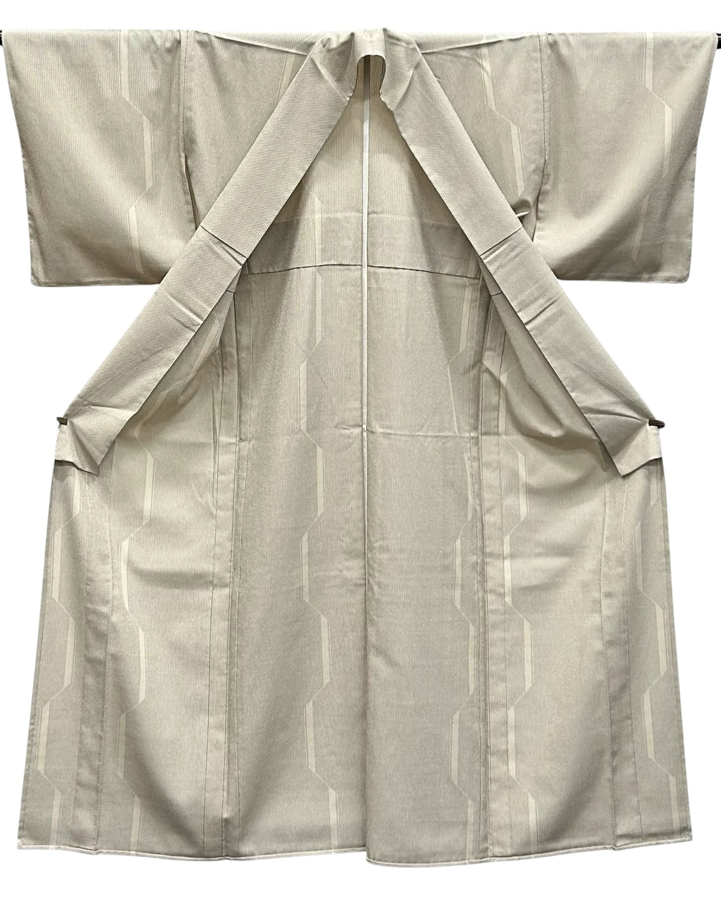 単衣 本塩沢 砂色と黒の縦縞 砥粉色のお洒落な幾何学模様 裄丈 66.5㎝ K5302