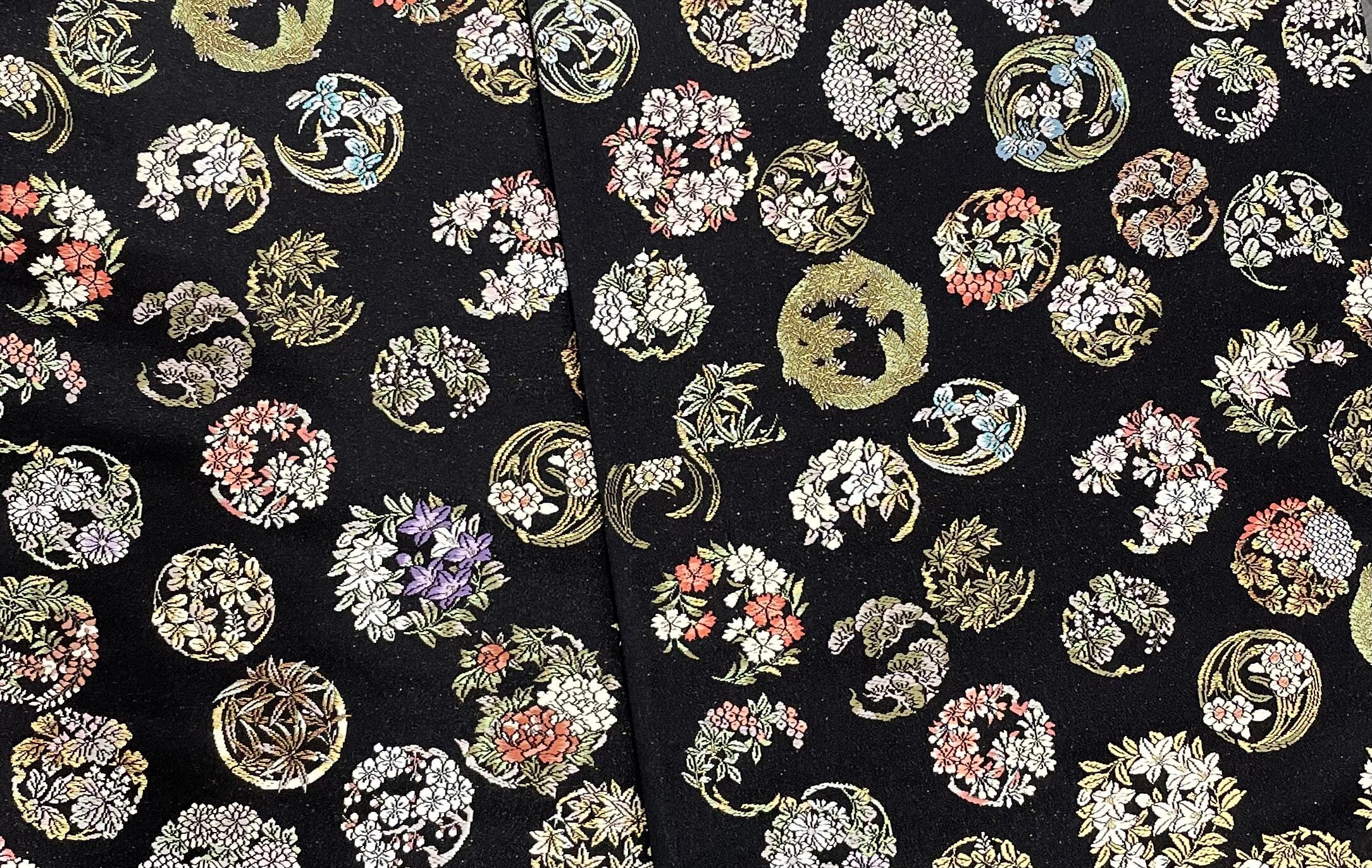 袋帯 黒地 山下織物 本金 草木染 長さ464cm Q1669 花弁丸散らし