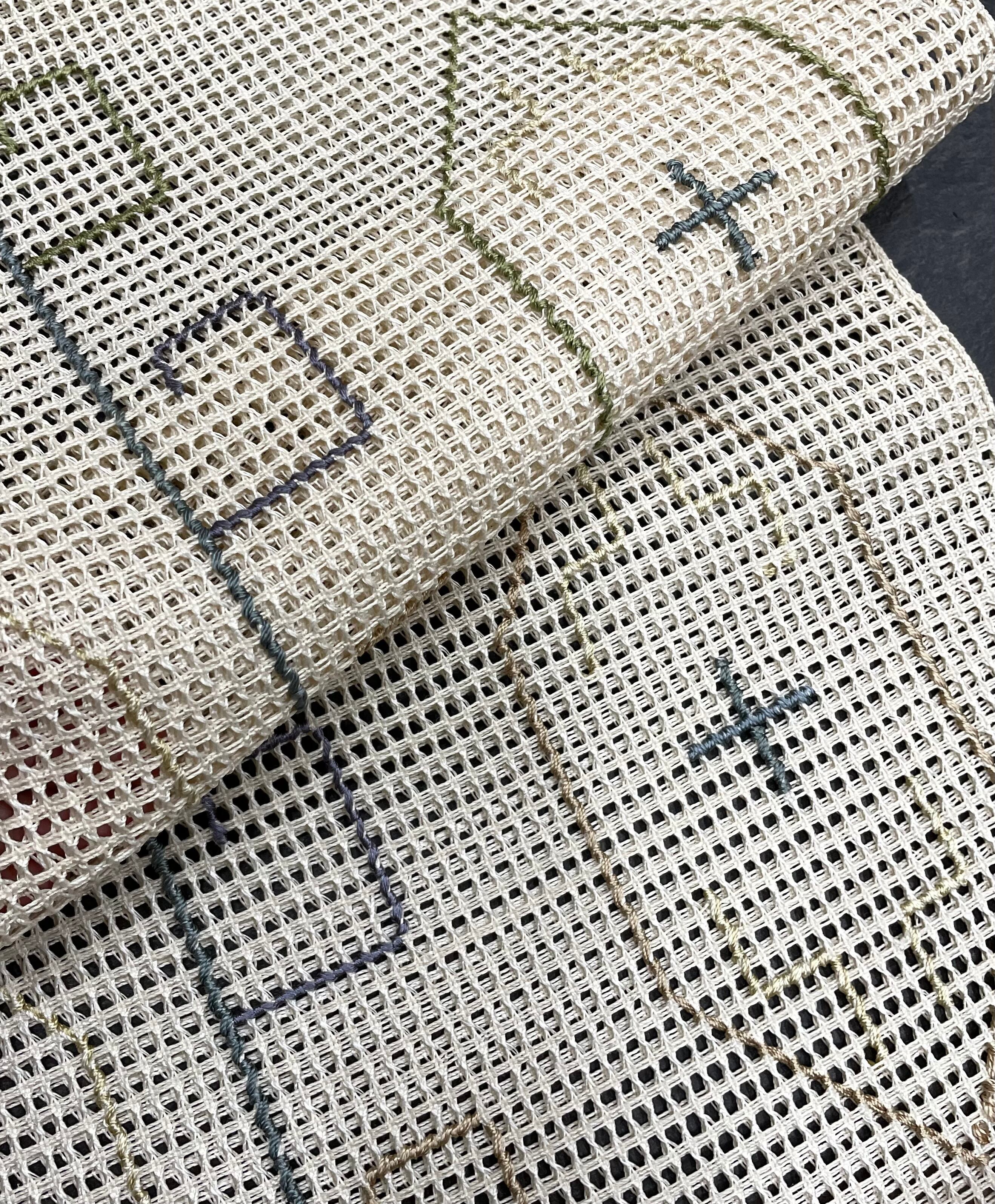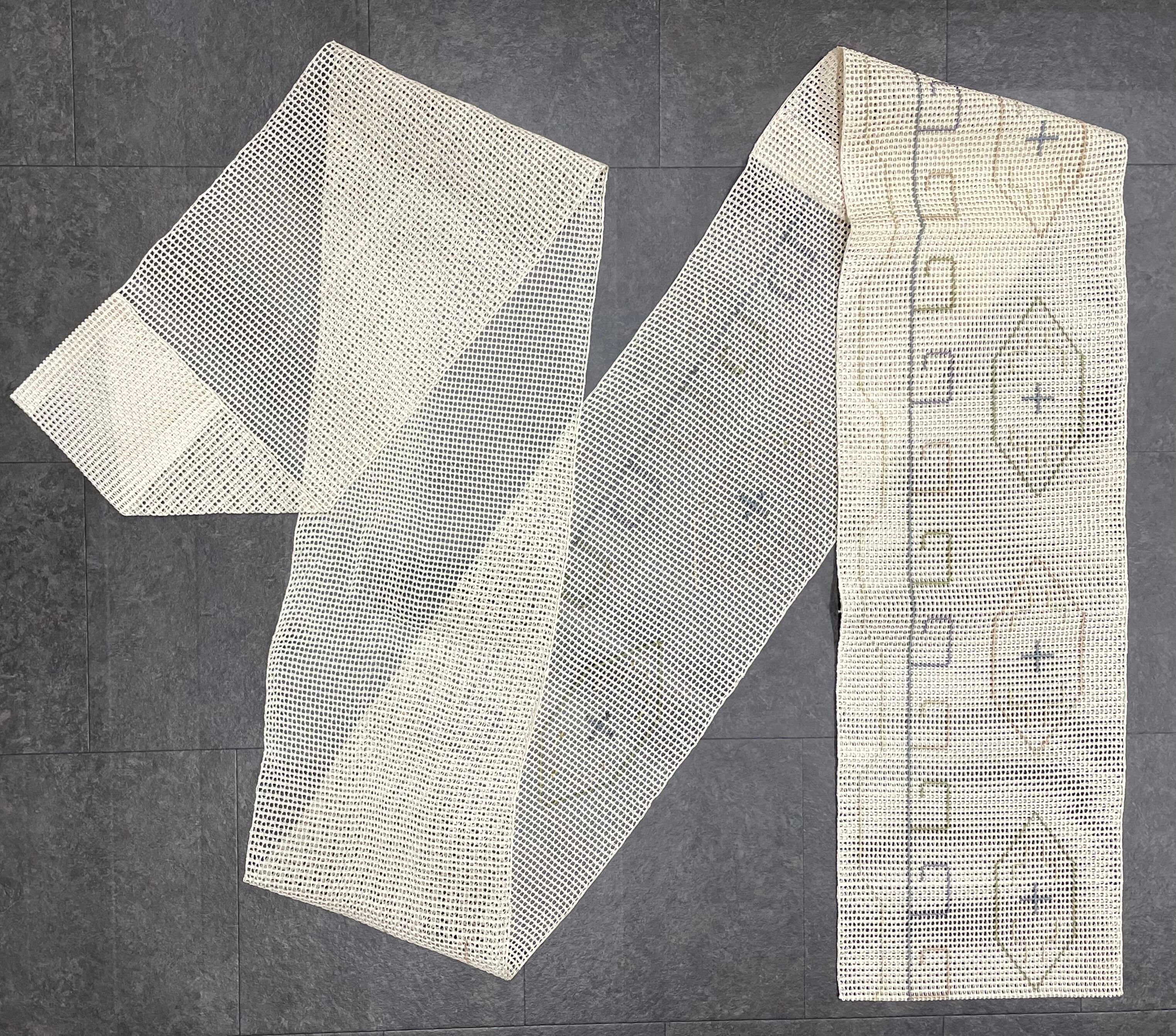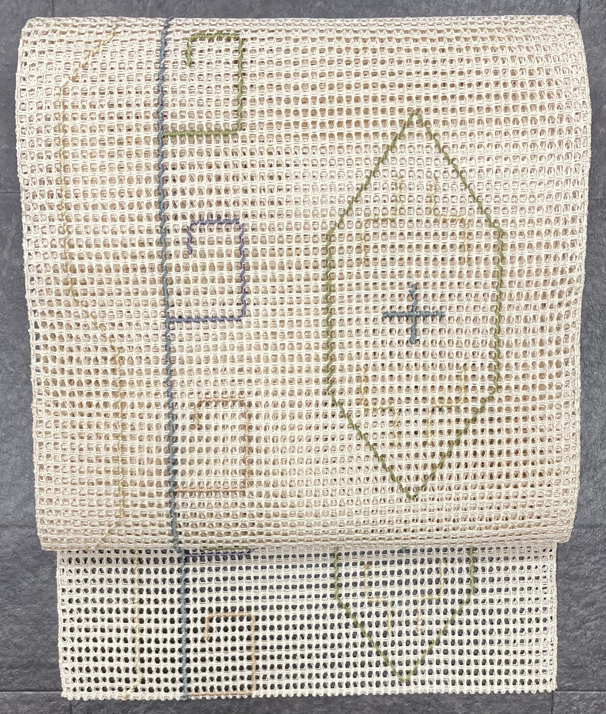 薄い生成色の地に薄花色、鶯色、榛色の模様が個性的な羅の帯です。