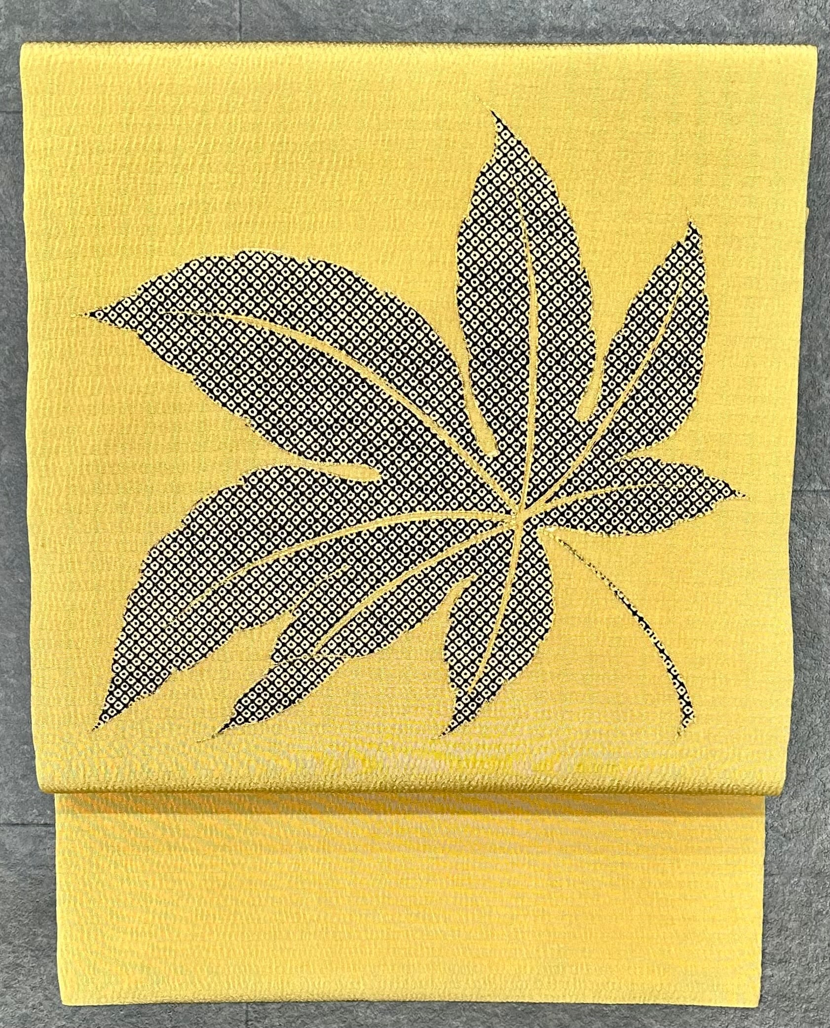 金色の縮緬地に、黒橡色の疋田柄の紅葉が映えるお太鼓柄の名古屋帯です。
