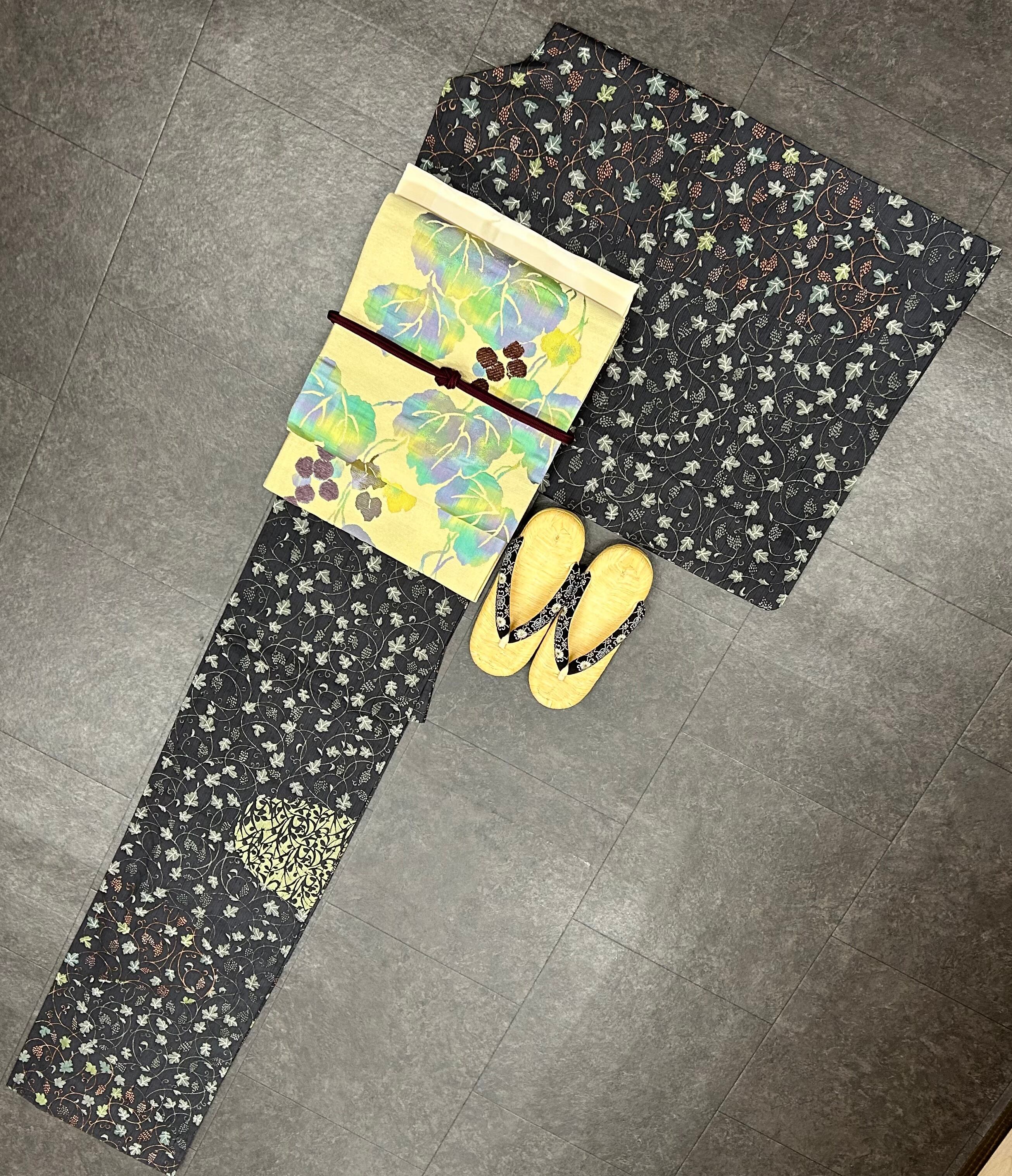 革色の地に、葡萄の総柄に袖と下前に抹茶色の模様が入っていて個性的な染め紬の着物です。