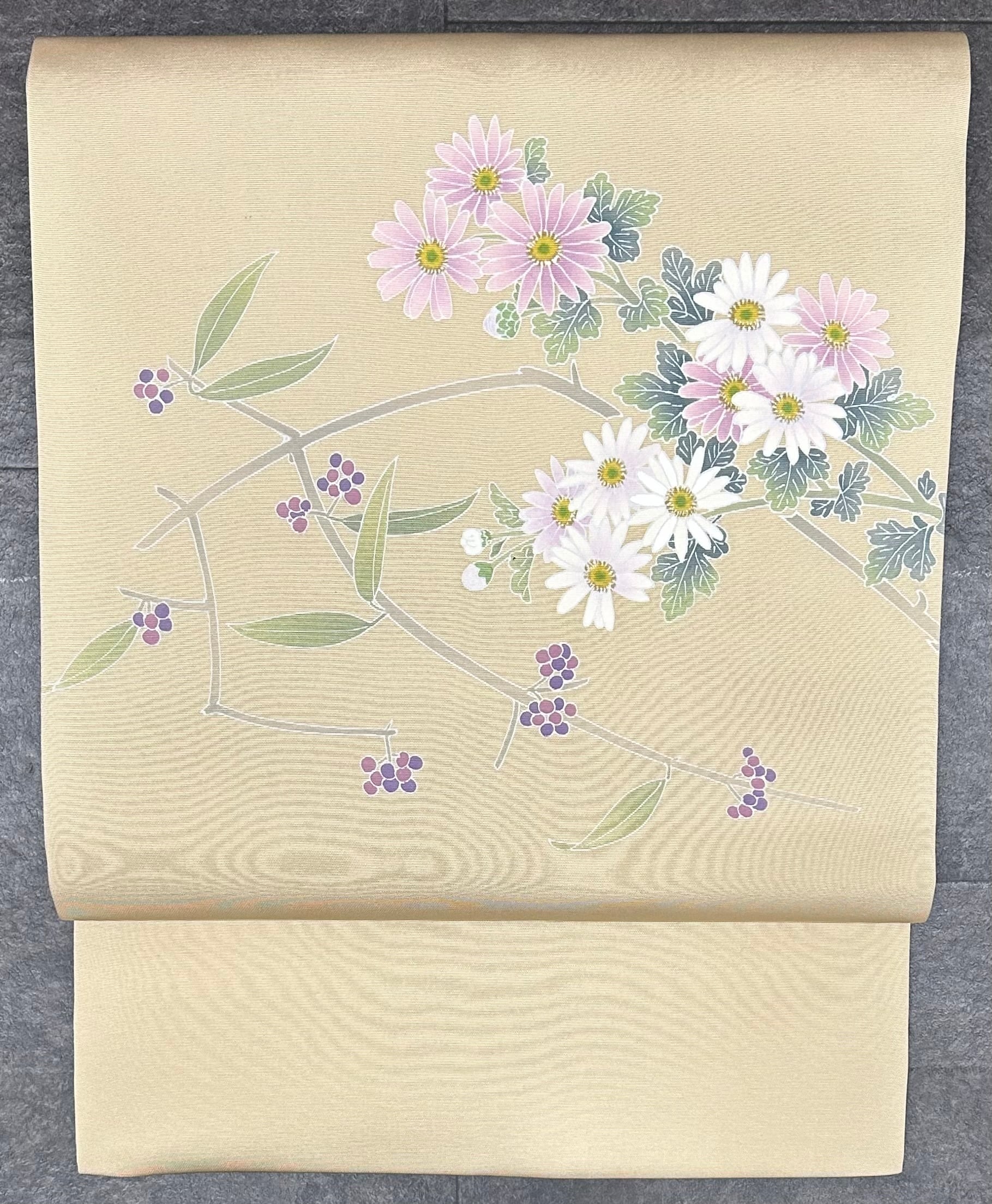 白茶色の地に浅紫色の濃淡の菊の花と、えびぞめ色の濃淡の木の実の柄。