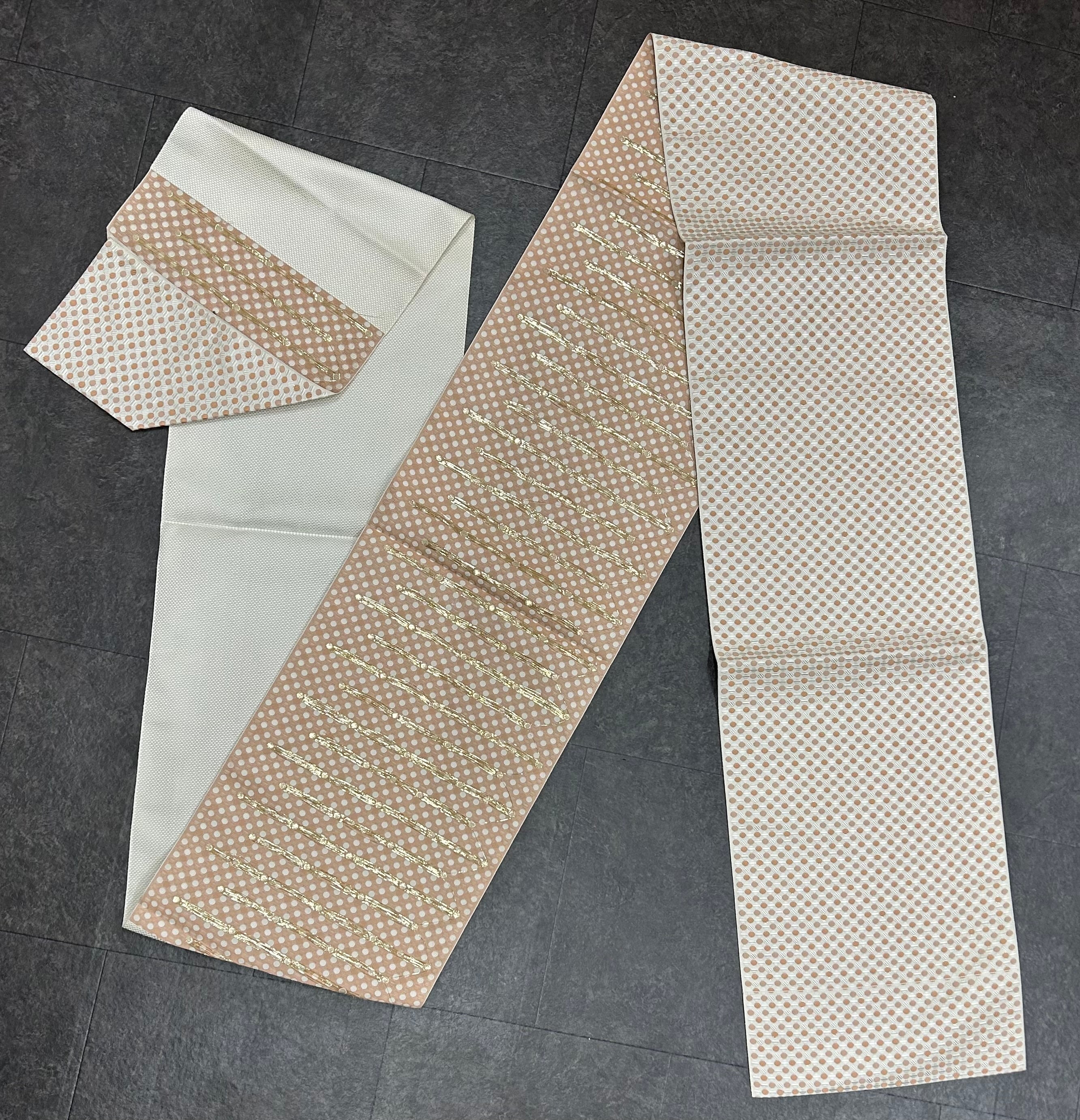 名古屋帯 八寸博多帯 松葉仕立て 象牙色 水玉 長さ 372㎝ Q3443