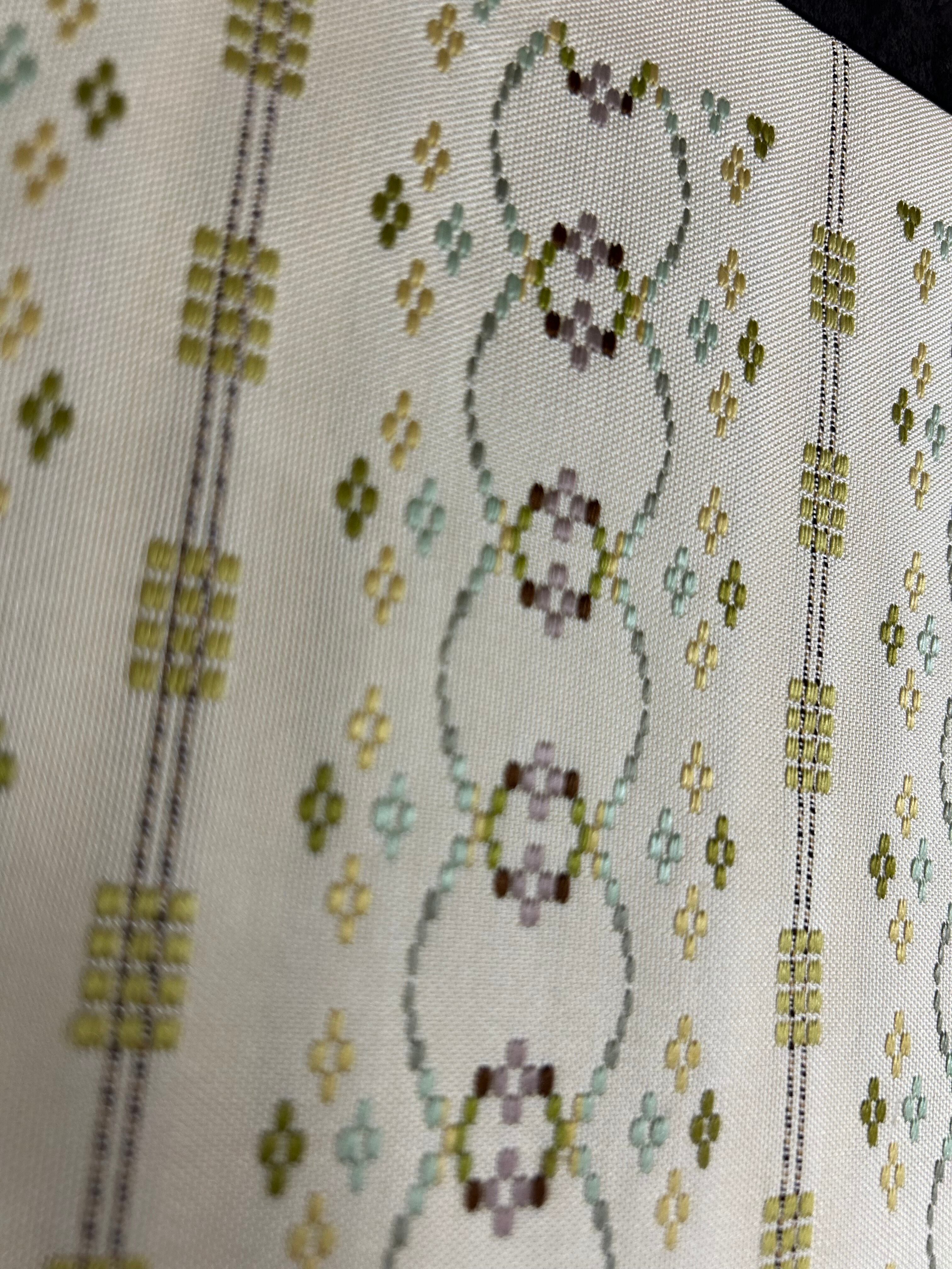 シルクの光沢が美しい黄色がかった砥粉色の地に抹茶色、青白橡色、濃いめの淡黄色、藤鼠色などを用いた南風原花織、柔らかめの芯が入った名古屋帯です。