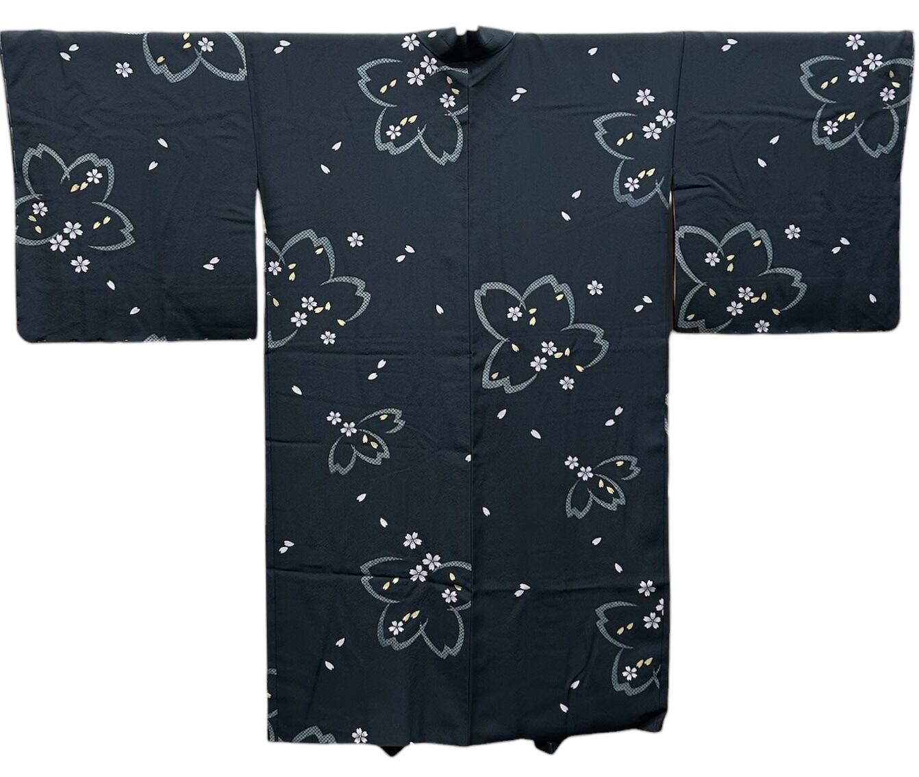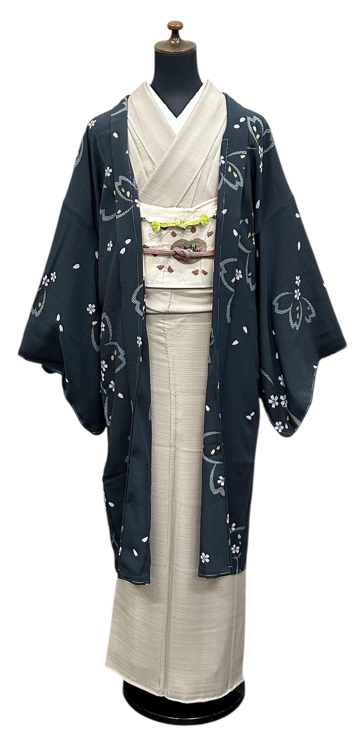 百入茶色の地に、大きい疋田柄の桜と小さい桜や花びらの飛び柄が素敵な羽織です。