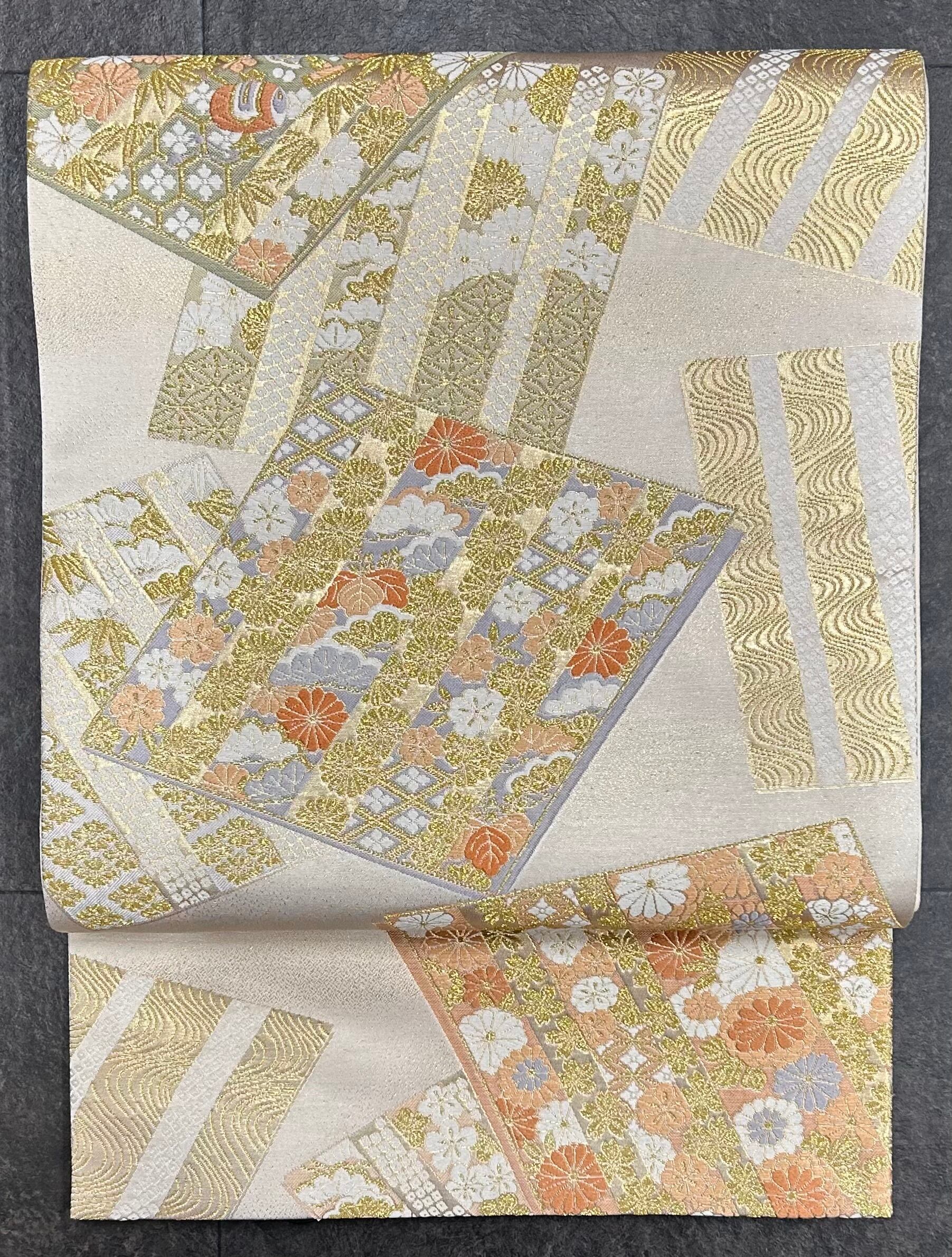 薄卵色に金糸の入った地に、金色、赤香色、曙色、柳茶色、生成り色、濃い淡藤色などで織られた、琥珀錦、小袖色糸文のしっかりとした厚みにある袋帯です。