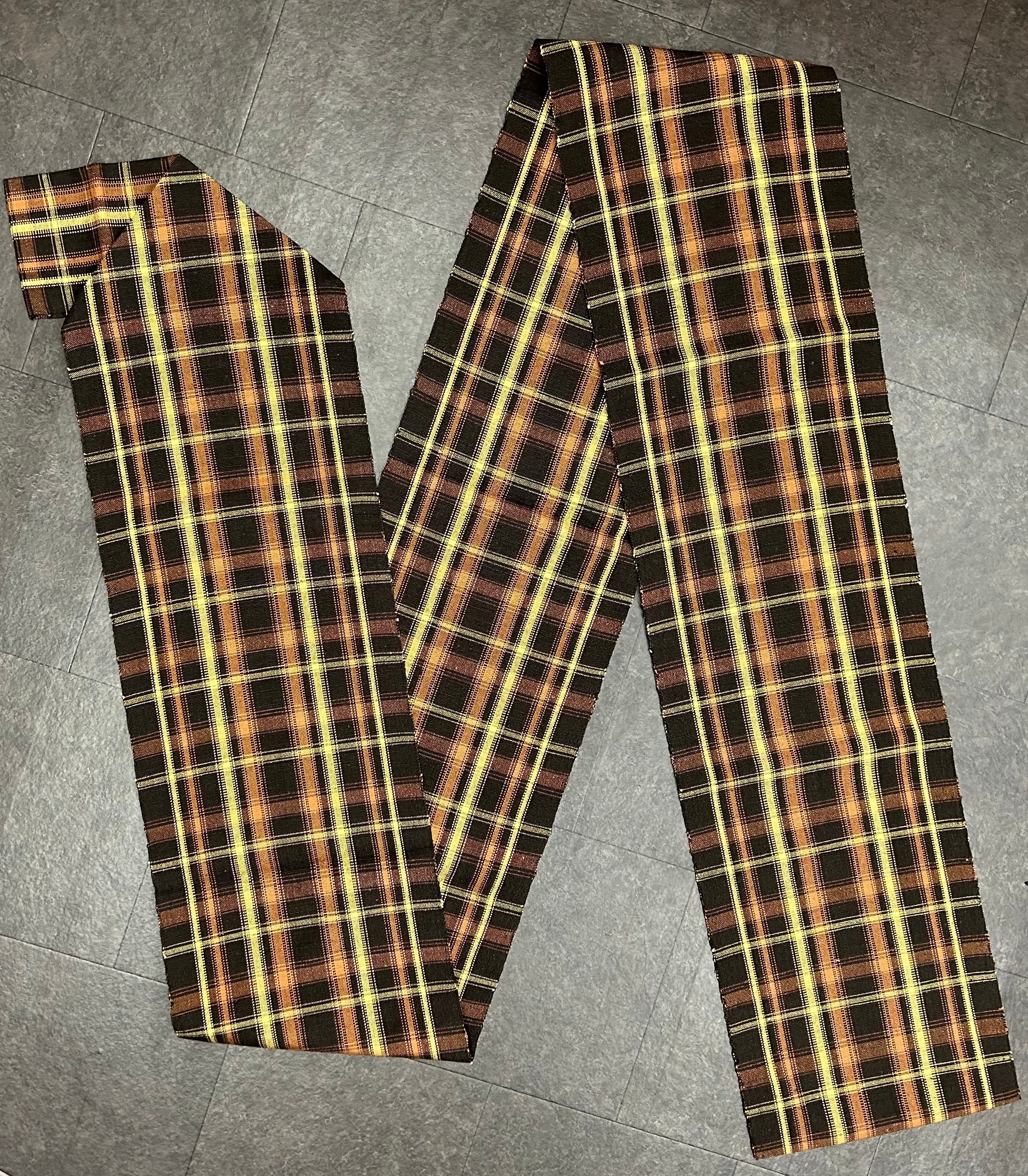 黒色×飴色×宗伝唐茶色の格子柄、フシのあるザックリ感のある結城紬、証紙の付いたお品です。