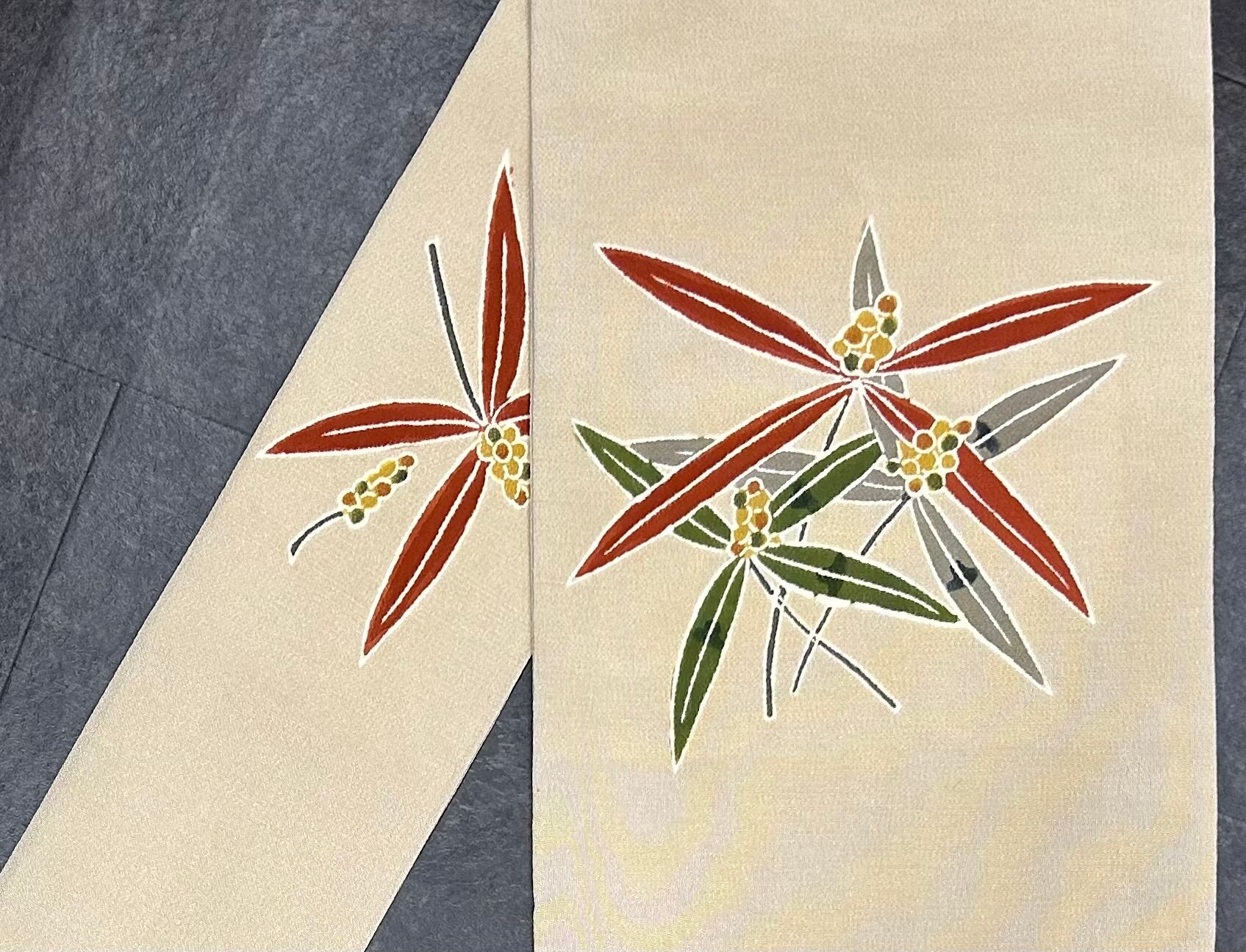 濃いめの白橡色の地に、小豆色と濃い苔色、源氏鼠色の笹のようにも見える植物の染め,